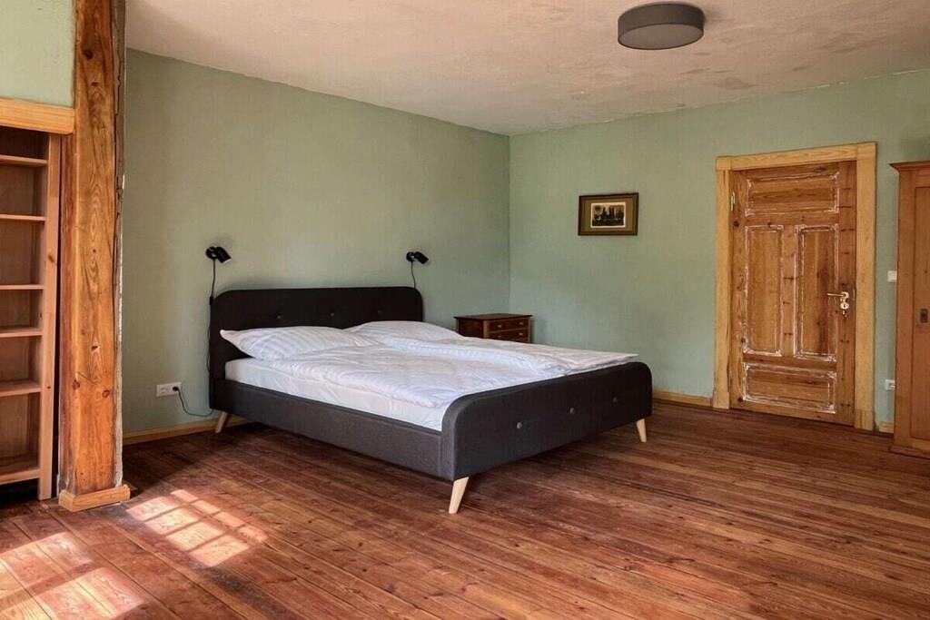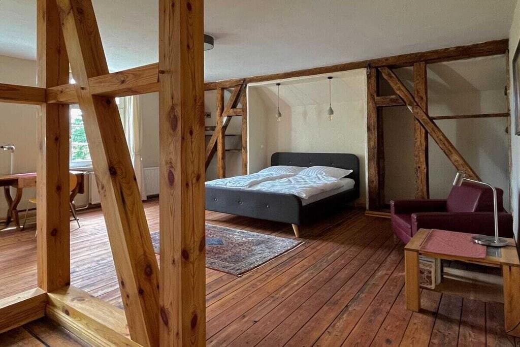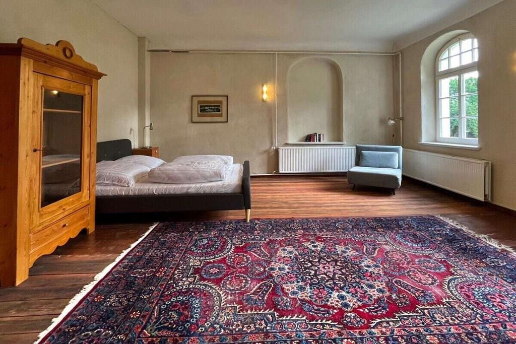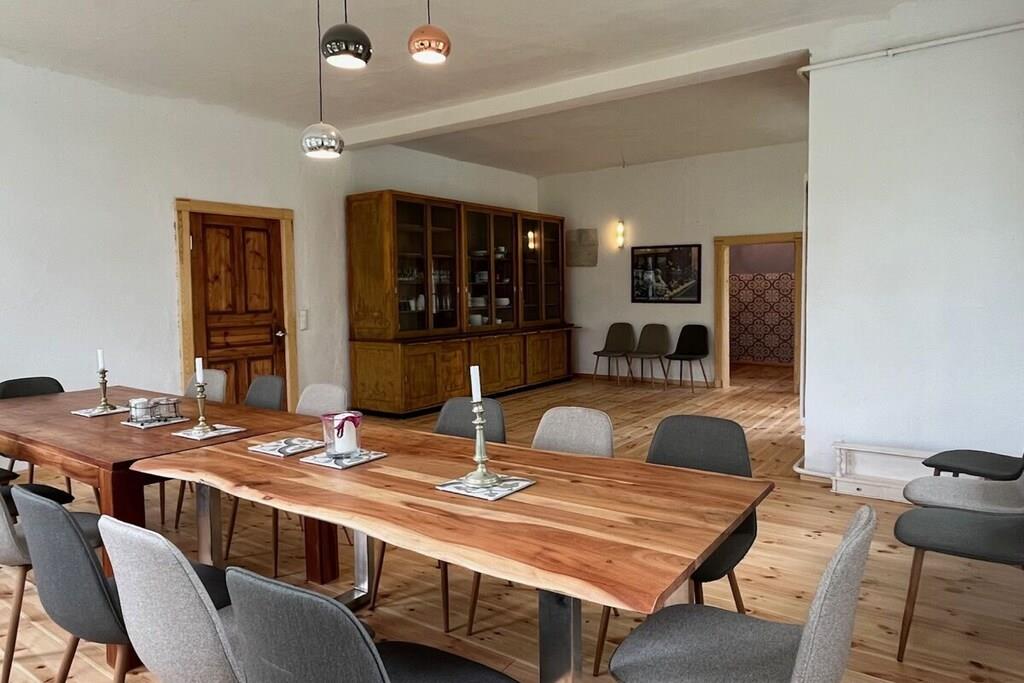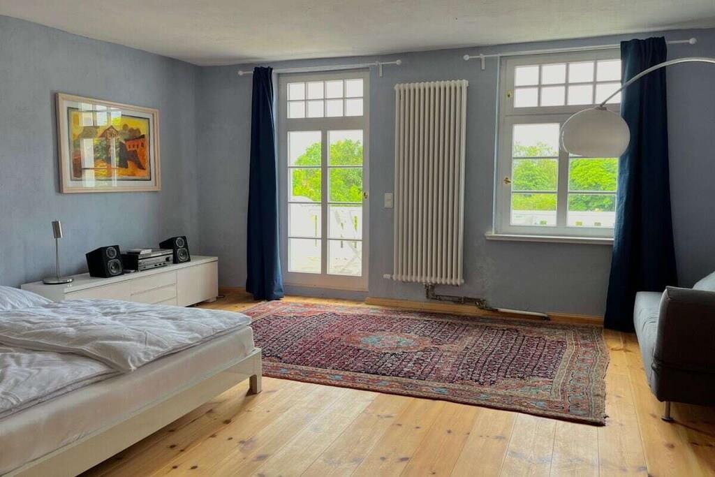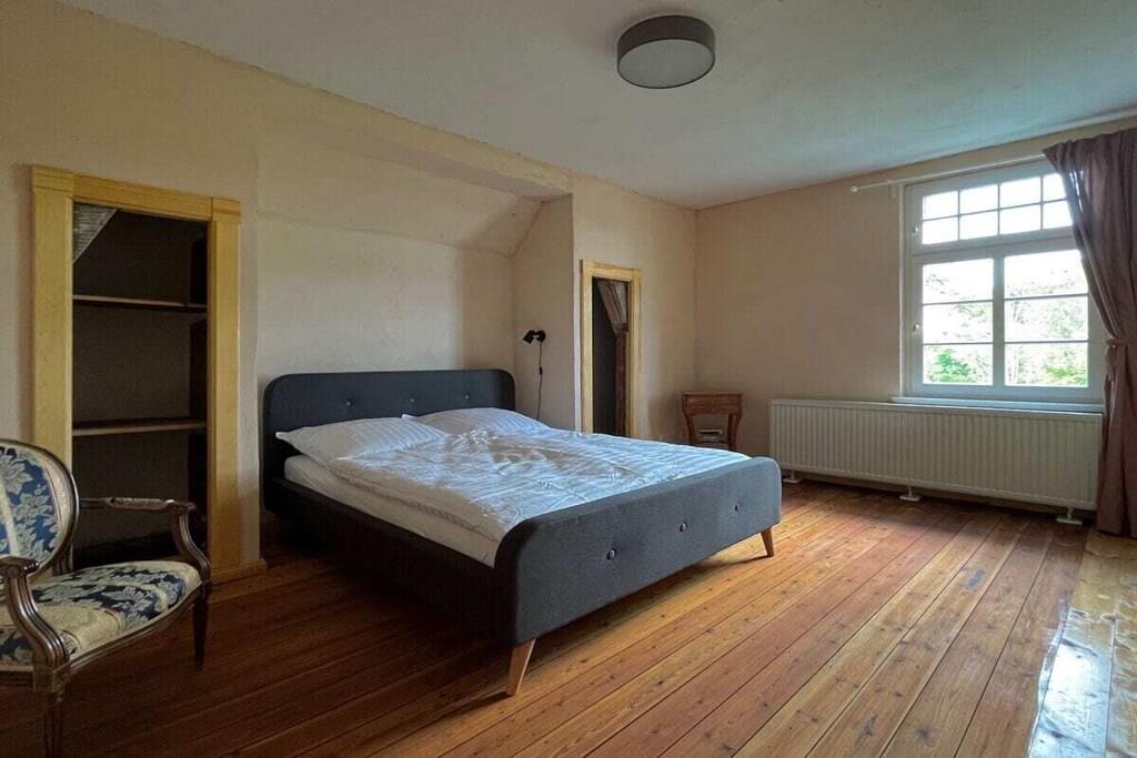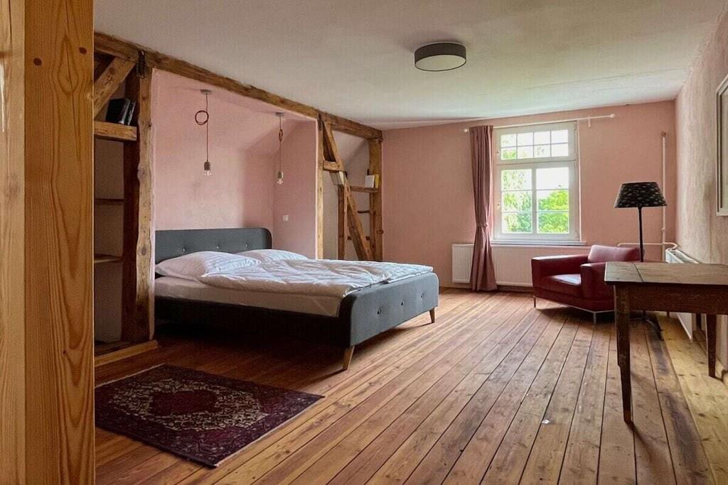 Das Wohnzimmer bietet reichlich Sitzgelegenheiten, und einen alten Flügel, der gerne bespielt wird (wenn er denn "in Stimmung" ist. Das helle Esszimmer bietet reichlich Platz fürs gemeinsame Speisen, ein kleiner Teeraum schließt sich daran an. Die Schlafzimmer haben wir mit einer Mischung aus Antiquitäten, neueren Möbeln und Fundstücken ausgestattet. Ein Schlafzimmer im Obergeschoss und das Schlafzimmer im Erdgeschoss haben eigene Bäder. Außerdem sind im Obergeschoss zwei Bäder jeweils mit Badewanne vom Flur aus erreichbar. Und im Erdgeschoss liegt noch unsere farbenfrohe Gästetoilette. Das Haus verfügt über einen Balkon, der einen schönen Blick auf die umliegende Landschaft bietet. Im Garten können Sie den Tag über der Sonne folgen, bis Sie abends auf der Veranda auf der Rückseite des Hauses die Abendsonne genießen. Auf der Vorderseite des Hauses haben wir im Garten einen Bouleplatz angelegt, falls Sie eine ruhige Kugel schieben wollen. Ein Sitzplatz unter der alten Trauerweide lädt zum Grillen oder Feuermachen ein. Das Ferienhaus ist für Nichtraucher und bietet eine allergenarme Umgebung. Es ist das perfekte Zuhause für Familien, Freunde und Gruppen, die eine entspannte Auszeit in der Natur suchen.