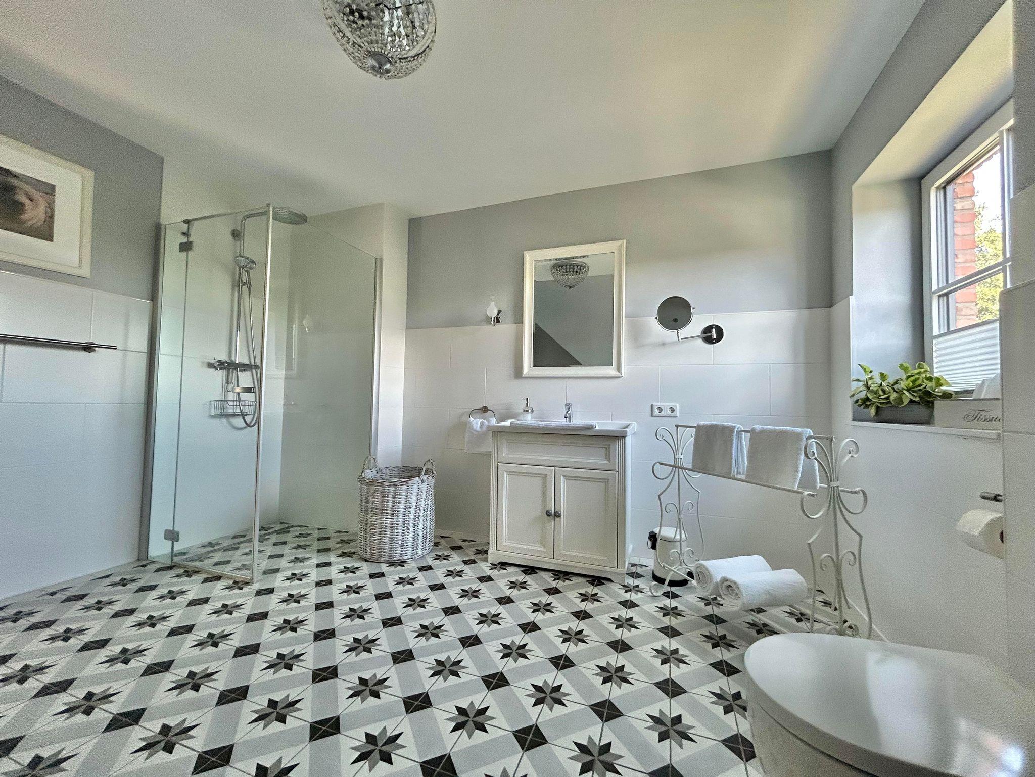 geräumiges Duschbad mit flacher Dusche, Föhn. Terrasse möbliert mit Strandkorb, Teakholzgartensitzgruppe, Deckcair, elektr. Grill, eingezäunter Garten