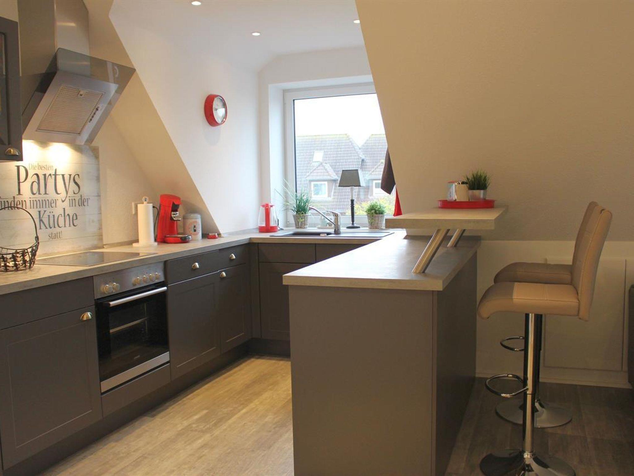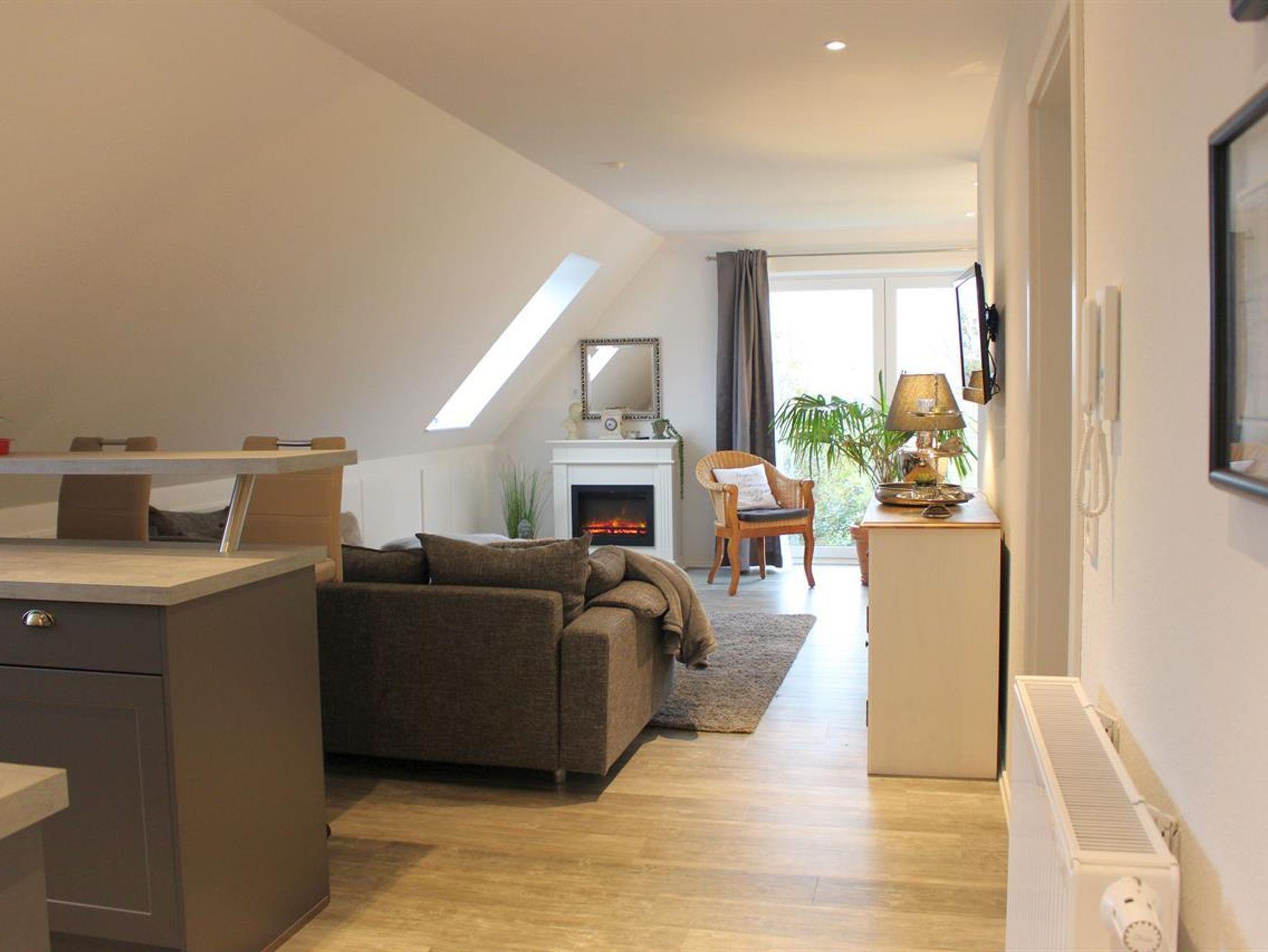 Gemütliches Wohnzimmer mit offener komplett eingerichteter Einbauküche ( u.a. Backofen, Geschirrspüler etc. ) und Essessecke. Grosszüge Dachterasse mit Gartenmöbeln Zwei Schlafzimmer mit je einem Doppelbett für 2 Personen. Großzügiges Duschbad mit WC und Fenster.