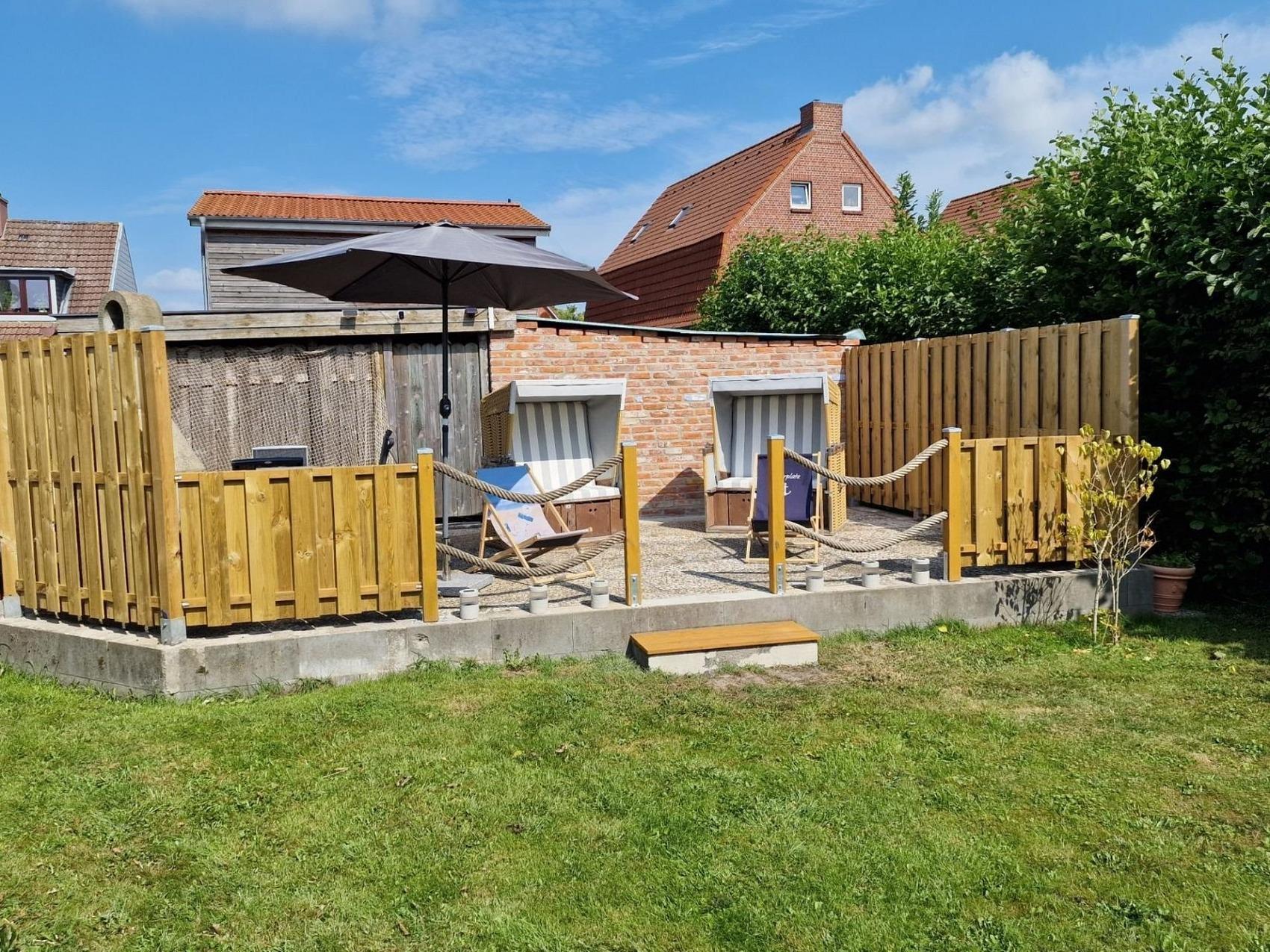 Entspannen Sie auf unserer über 30m² großen, uneinsehbaren (noch nicht ganz fertigen, aber uneingeschränkt nutzbaren) Sonnenterrasse mit Strandkörben, Sitzgelegenheit, Gartengrill und Strandstühlen.