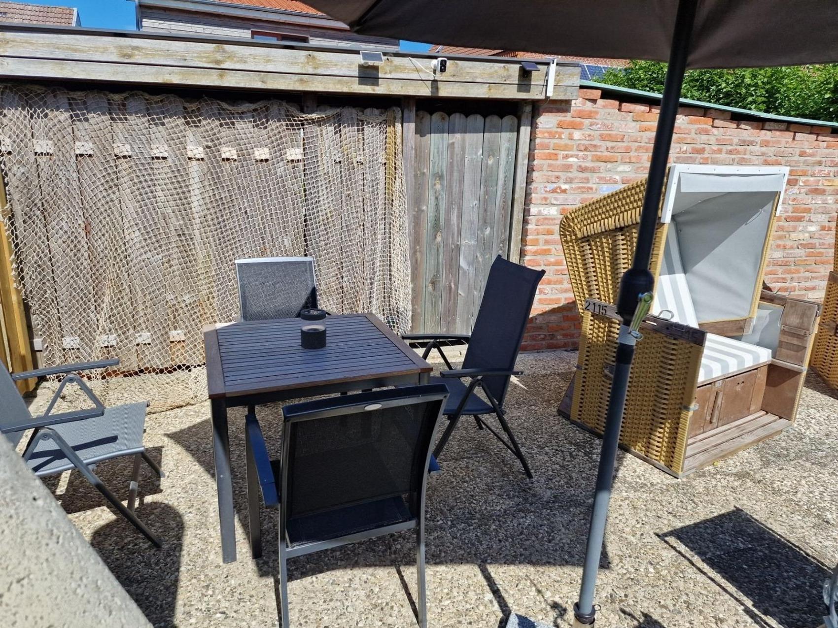 Eine Sonnenterrasse mit Gartenmöbeln und Sonnenschirm befindet sich direkt an der Wohnung.