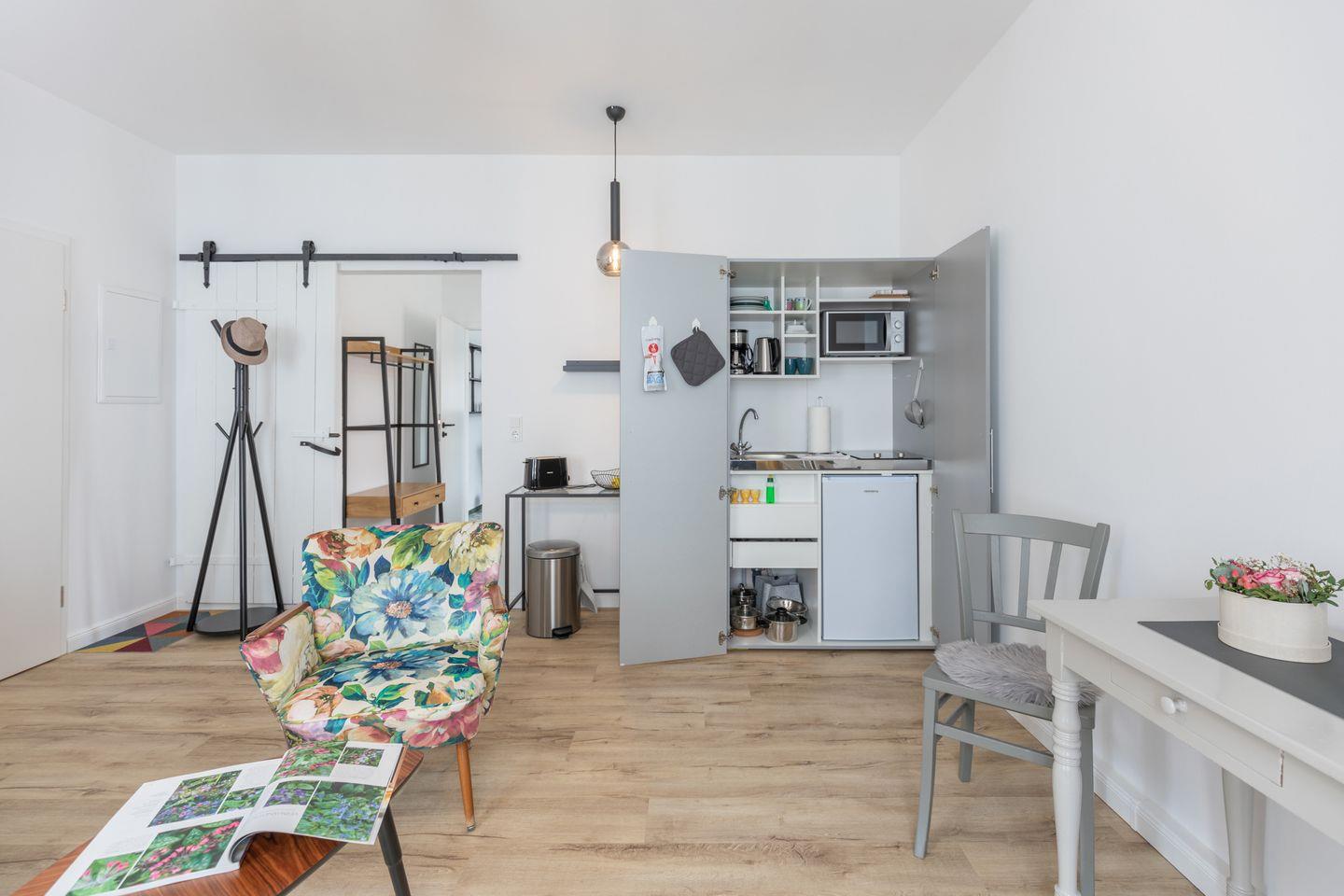 Das geschmackvolle Apartment ist ca. 45 qm groß und ideal für ein bis zwei Personen. Das Wohnzimmer ist gemütlich eingerichtet mit einem komfortablen Sessel, einem Sofa und einem Flachbild-TV. Die Pantryküche bietet alles, was Sie für Ihre kleine Urlaubsküche benötigen: Kühlschrank mit Gefrierfach, Mikrowelle, Kaffeemaschine, Toaster, Wasserkocher und 2-Platten-Ceranfeld.