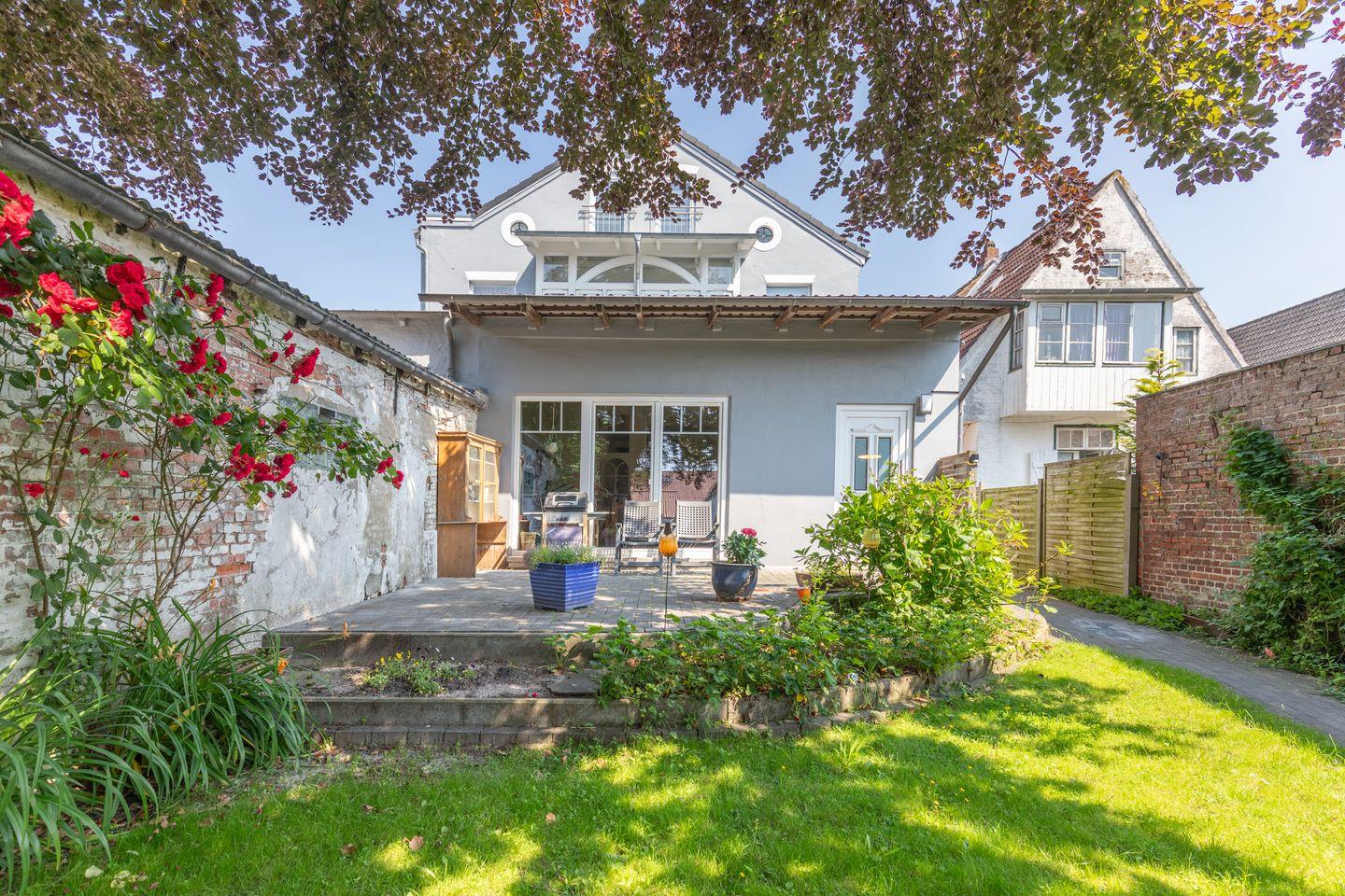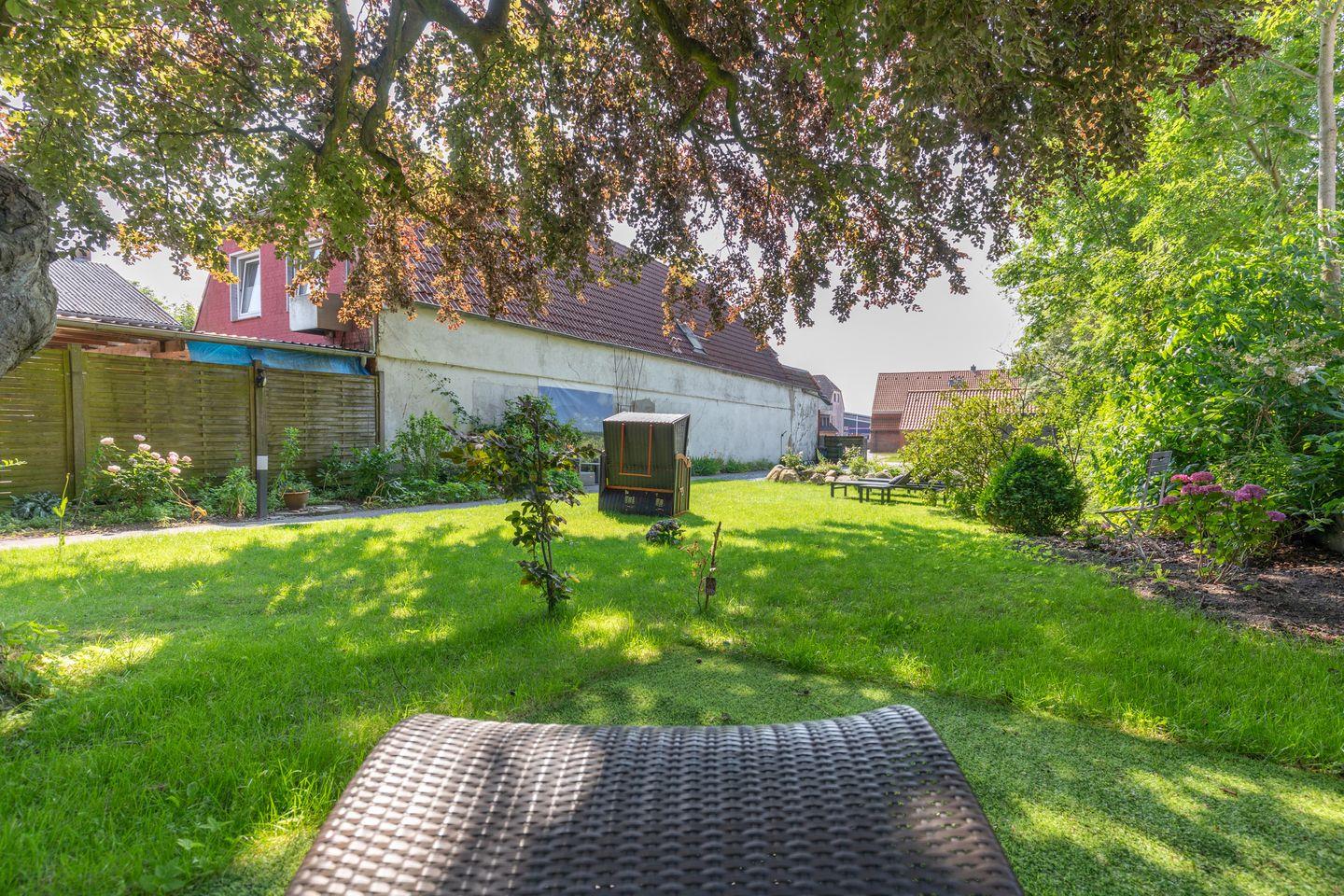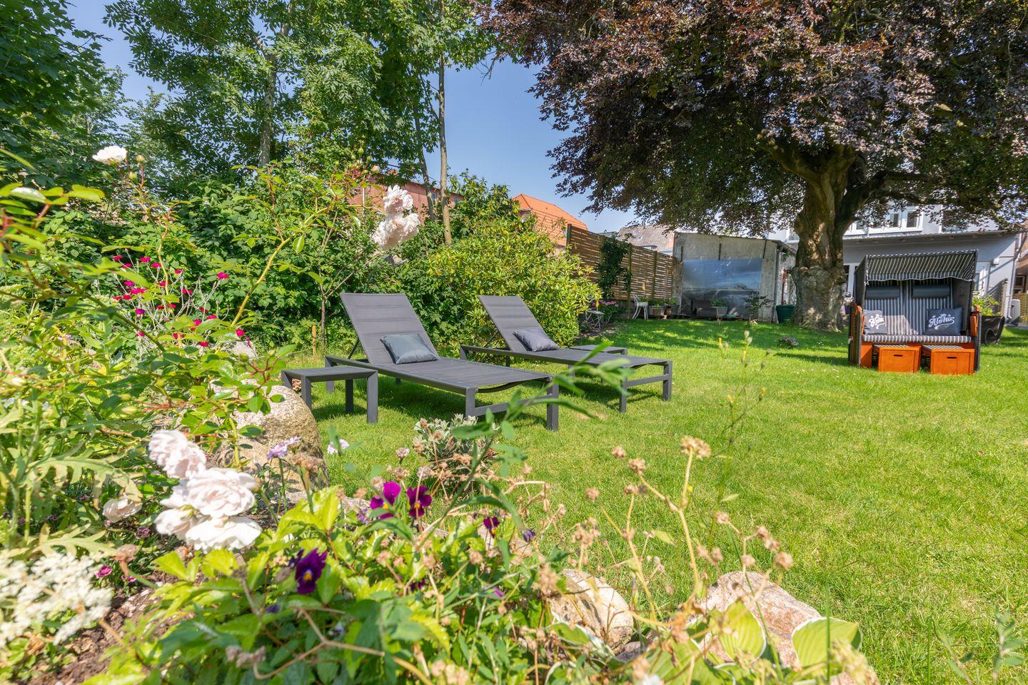 Im Hinterhof lädt ein herrlicher Garten mit einer großen, schattenspendenden Rotbuche zum Verweilen ein. Der Garten, die Außensitzplätze und der Strandkorb stehen allen Ferienwohnungen zur Verfügung und können gerne von Ihnen genutzt werden.