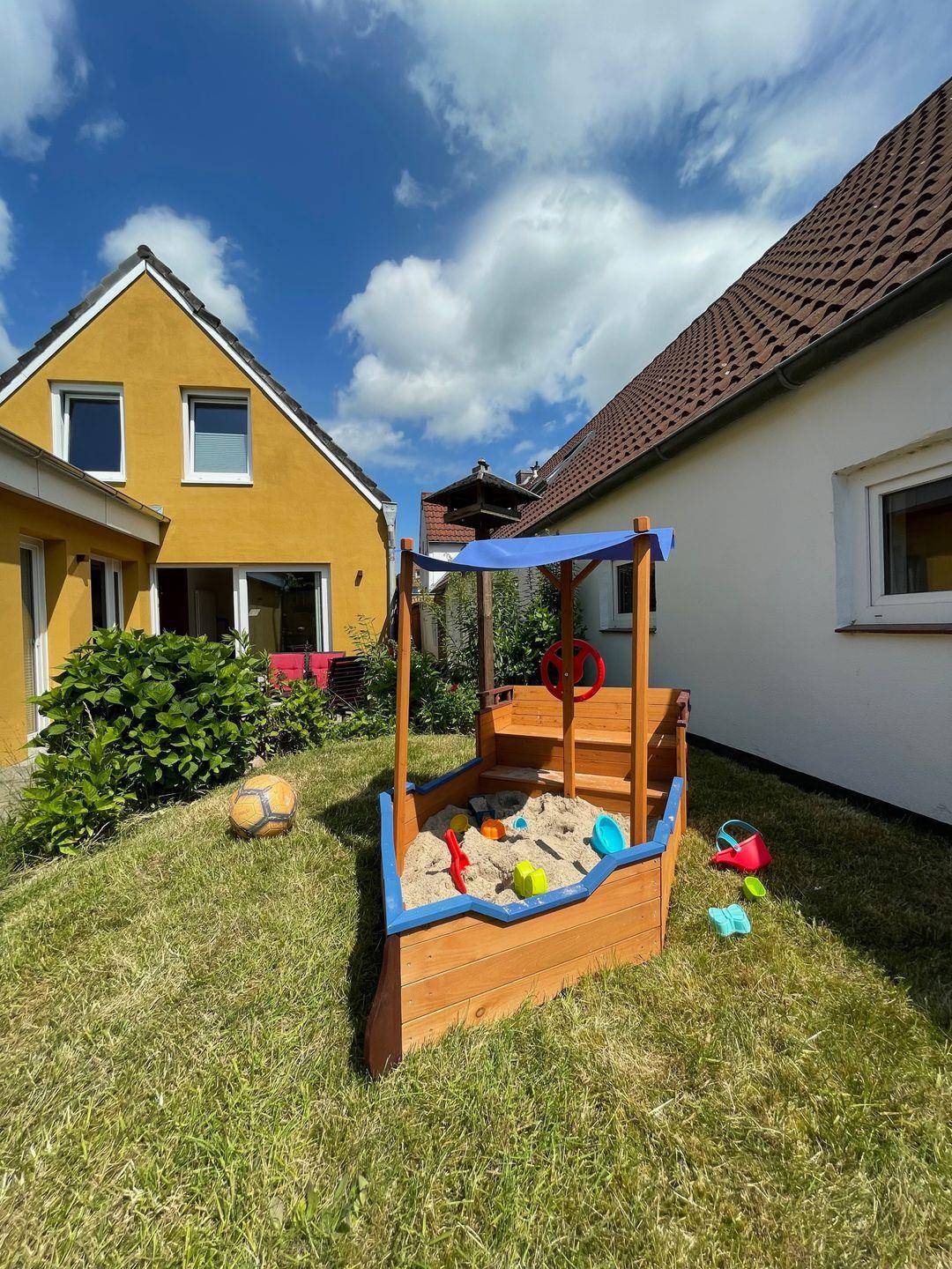 Viel Platz drinnen, viel Platz draußen. Im langgestreckten Garten kann man im Liegestuhl die Nordseebrise genießen und dann beim gemeinsamem Grillabend den Tag ausklingen lassen.
