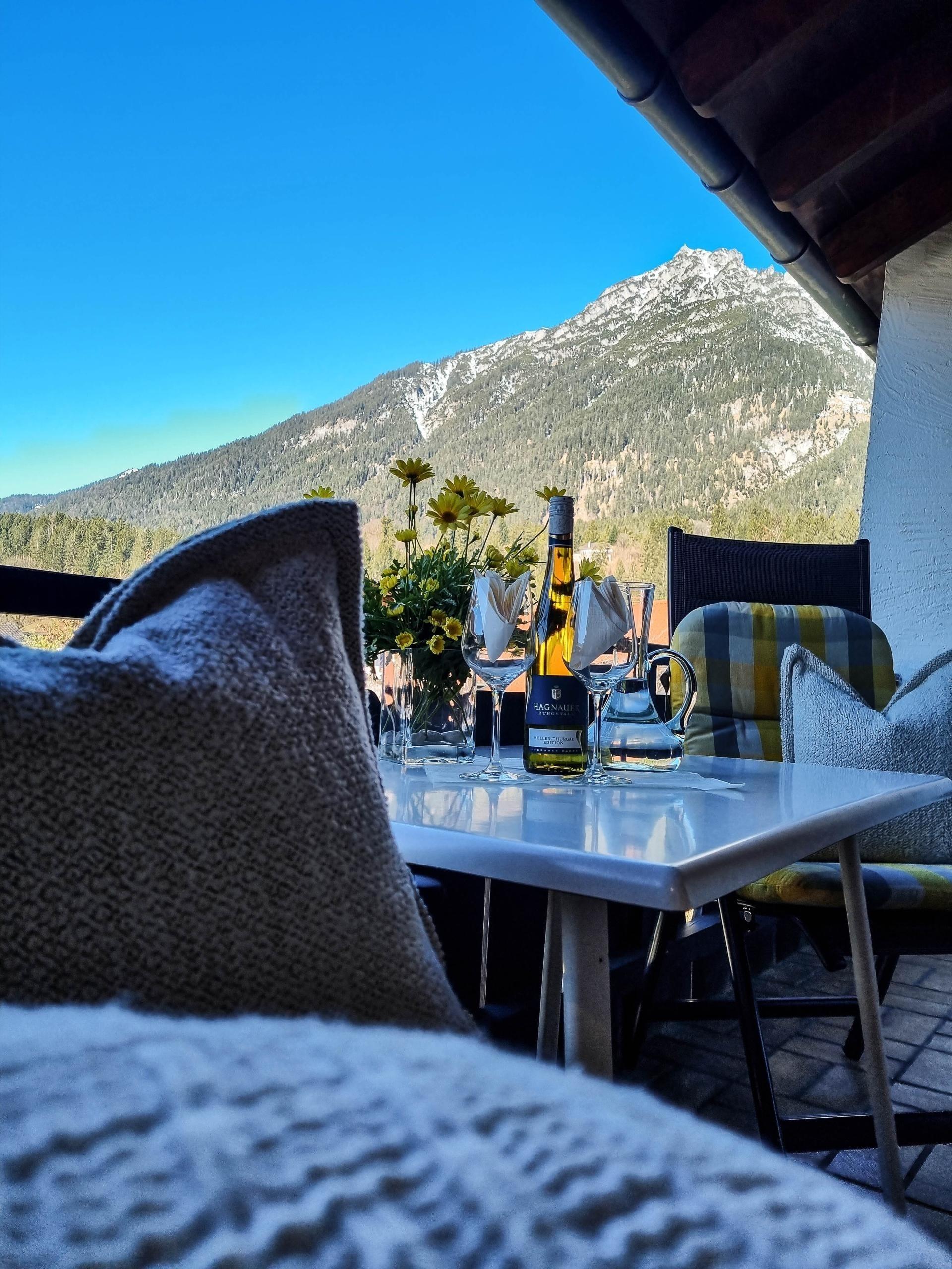Von dort genießen Sie das wunderschöne Alpenpanorama des Wettersteinmassives.