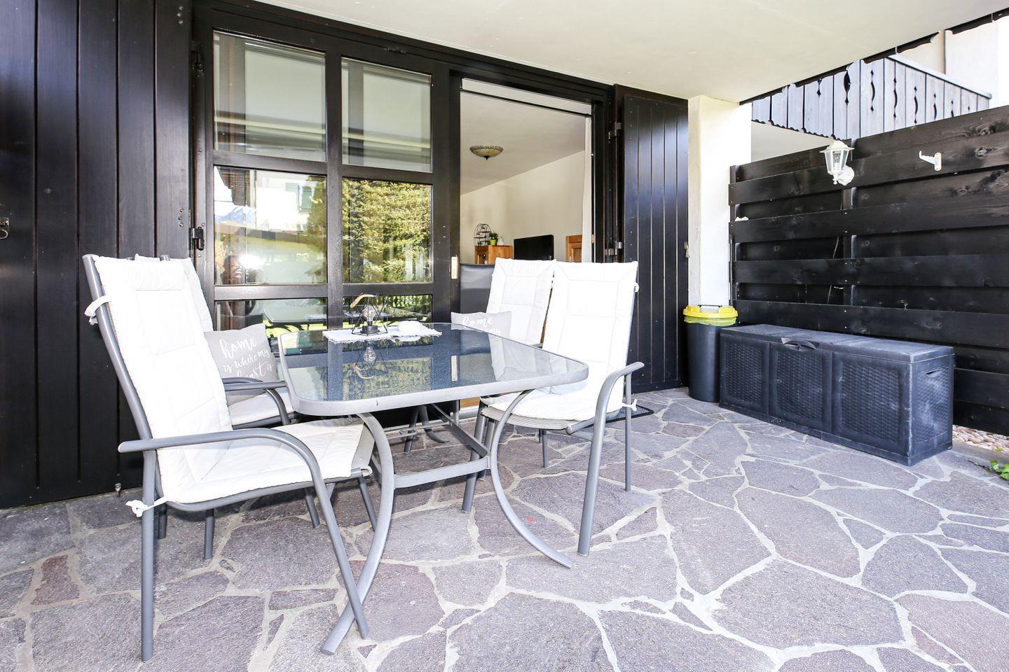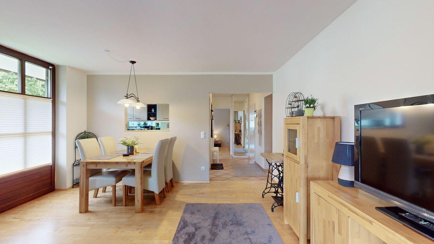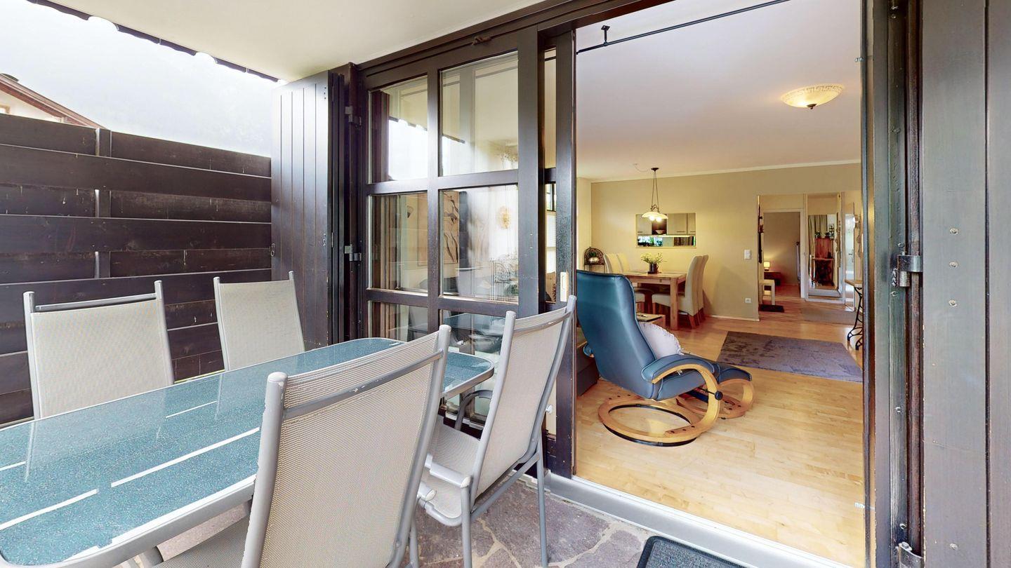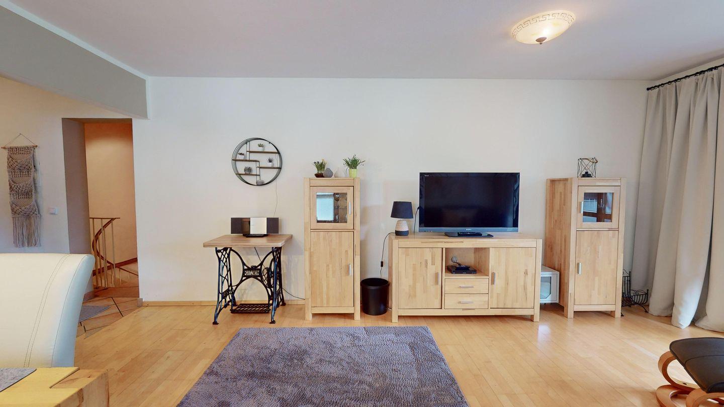 Es erwarten Sie ein großzügiges, helles Wohnzimmer mit Flachbild-TV, gemütlicher Sitzgruppe und separatem Essbereich sowie Zugang zur eigenen Terrasse mit Garten.