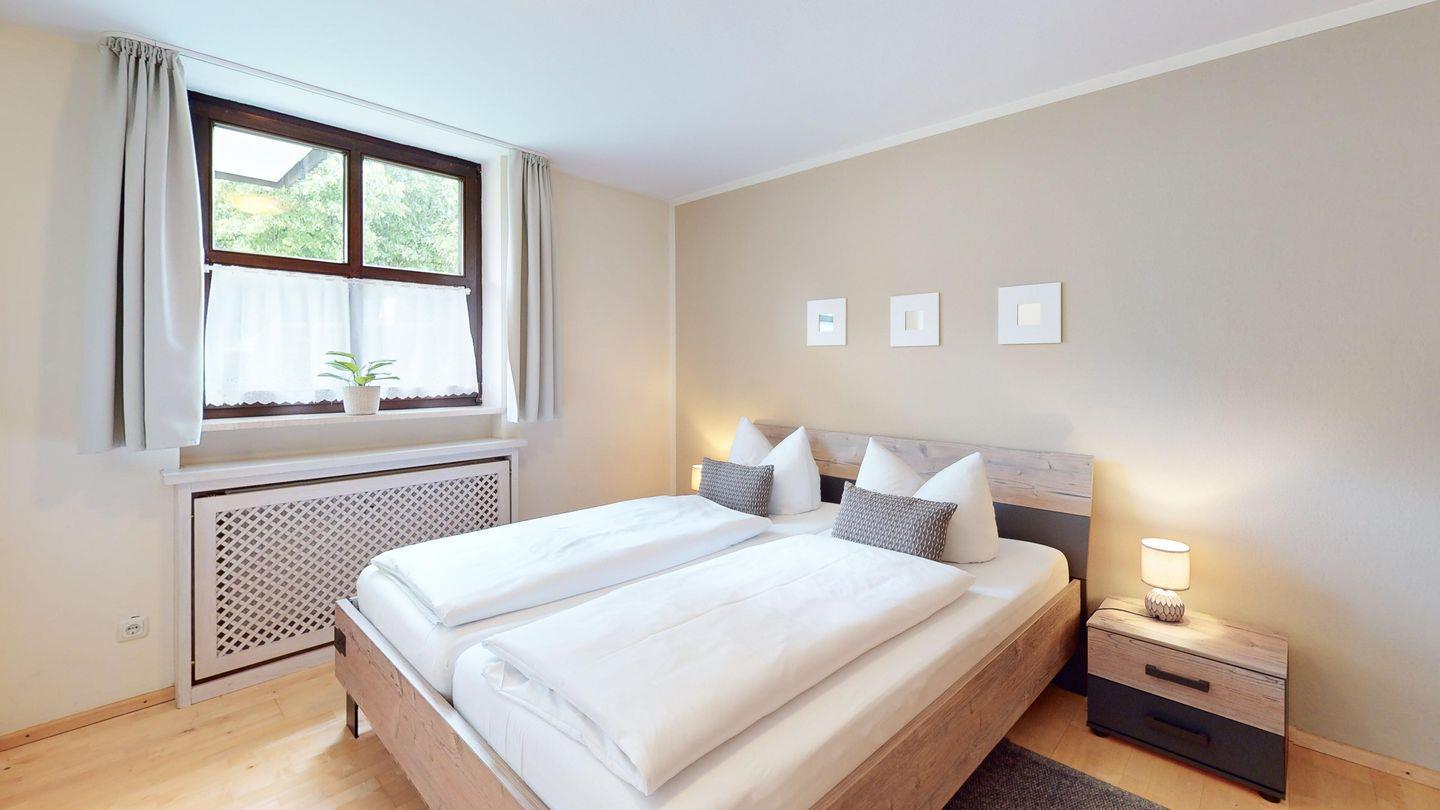 Das 2. Schlafzimmer erreichen Sie durch eine Wendeltreppe ins Untergeschoss. Es handelt sich hier um das gleiche Doppelbett wie im oberen Schlafzimmer und ein Fenster sorgt für genug Licht.