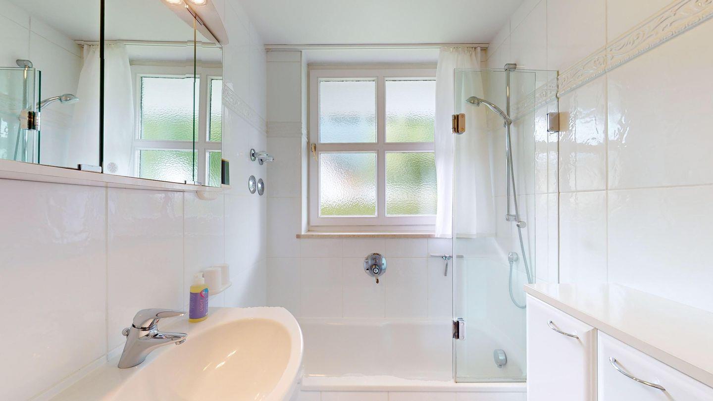 Im vorderen Teil der Wohnung findet sich außerdem das weiß geflieste Tageslichtbad mit Badewanne und darin integrierter Duschvorrichtung sowie WC.