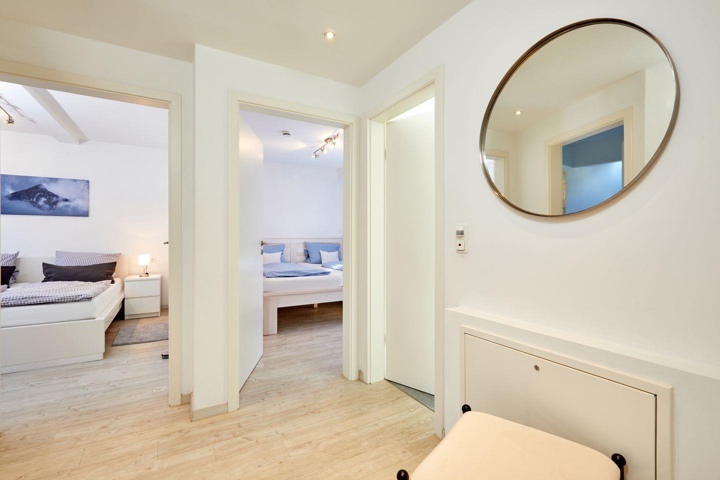Die Ferienwohnung Alpspitze mit insgesamt 110 qm liegt im Erdgeschoss und verfügt über einen großzügigen Eingangsbereich, durch welchen der Rest der Wohnung erreichbar ist. Hier ist ausreichend Platz für Jacken und Schuhe.
