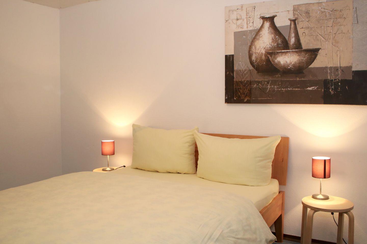Das 1. Schlafzimmer findet sich ebenfalls hier, im Anschluss an das Wohnzimmer. Es wartet ein gemütliches Doppelbett für ausreichend Platz für 2 Personen auf Sie. Wie der Rest der Wohnung ist auch das Schlafzimmer mit ausreichend Fenstern ausgestattet.