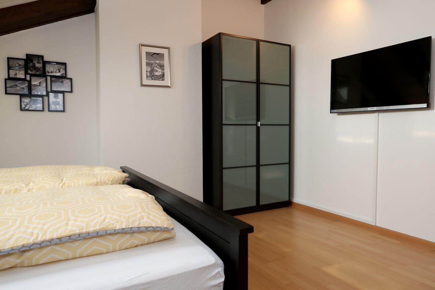 Im 1. OG befinden sich ein Schlafzimmer, ein Badezimmer mit bodengleicher Dusche und WC, die voll ausgestattete Küche und das Wohnzimmer. Vom Wohnzimmer aus hat man Zugang zu dem großen Balkon mit Blick auf die Berge und auch in der Küche kann man beim Kochen durch die großen Fensterflächen den Blick ins Grüne genießen.