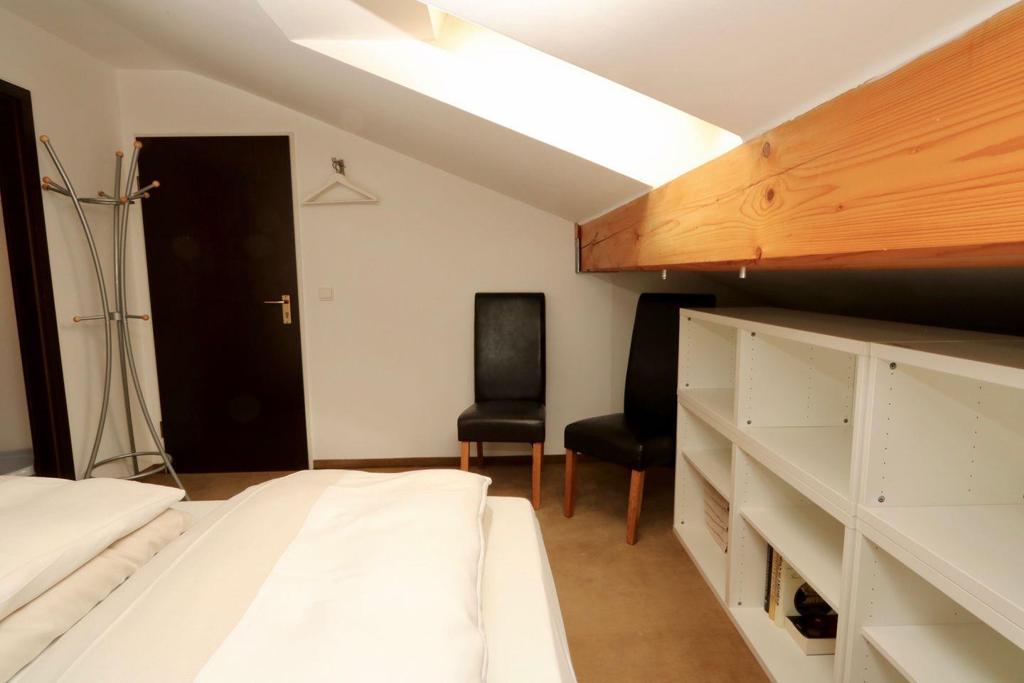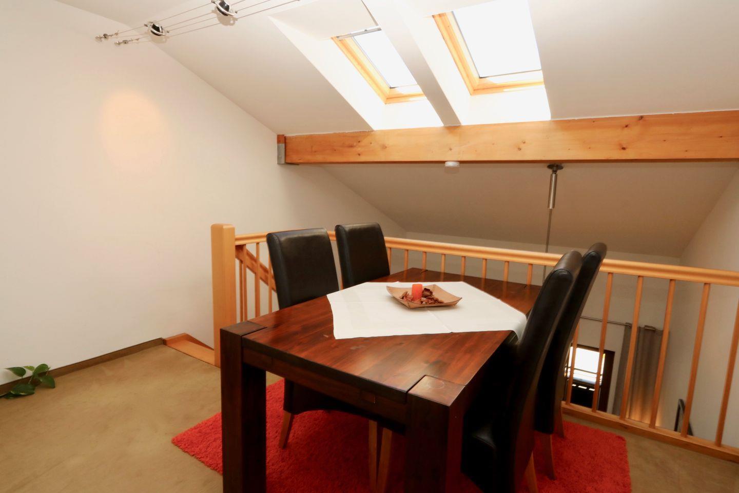 Vom Wohnzimmer aus geht es dann über eine Treppe in das 2. Geschoss der Wohnung, die Galerie. Hier befindet sich der Esstisch, sowie das zweite Schlafzimmer mit Doppelbett und das zweite Badezimmer mit Dusche.