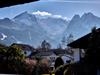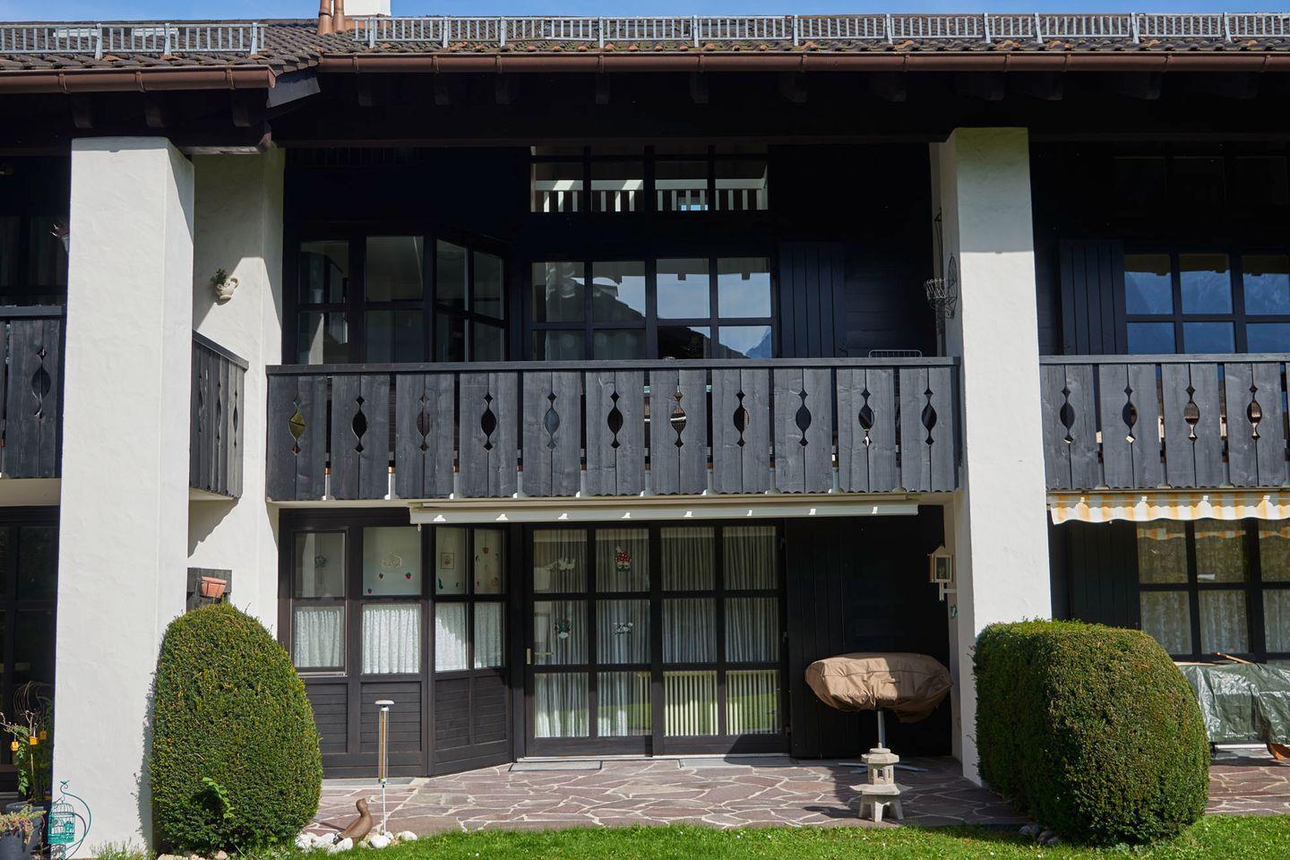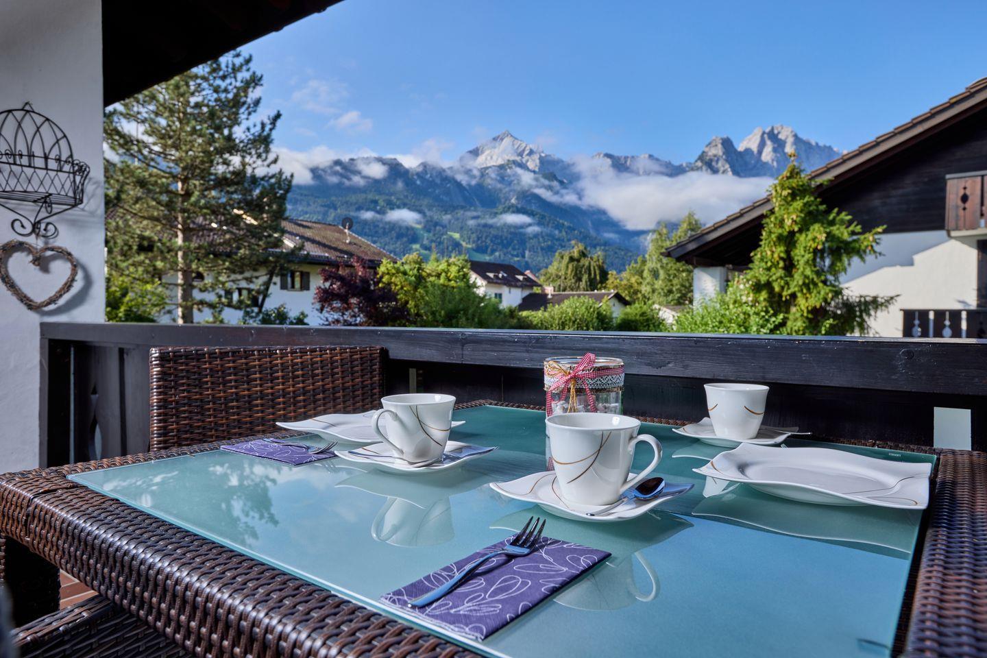 Das großzügige Esszimmer mit breiter Fensterfront ermöglicht nicht nur vom überdachten Balkon einen atemberaubenden Zugspitzblick, auch beim Frühstück oder Abendessen kann man sich in dem Blick auf die Berge von Garmisch-Partenkirchen verlieren. Möchte man sich entspannen, steht hier noch eine gemütliche Couch zur Verfügung. Diese lässt sich bei Bedarf auch ausziehen und zu einer bequemen Schlafgelegenheit für eine 3. Person umfunktionieren.