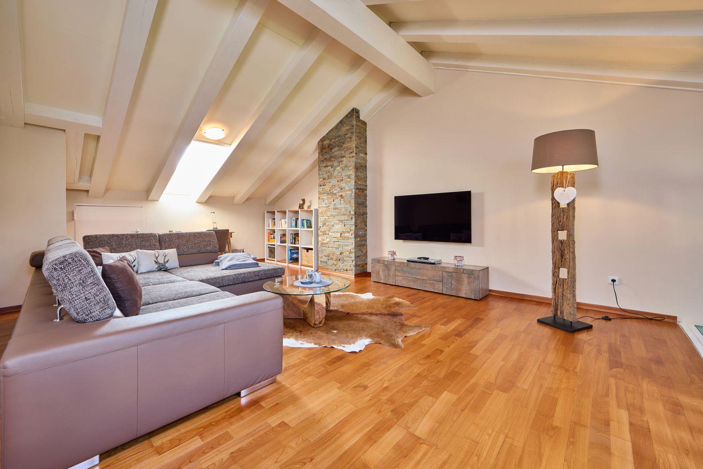 Den oberen Teil der Maisonette Wohnung erreichen Sie über die Wendeltreppe. Sie werden von einer eleganten und bequemen Wohnlandschaft erwartet. Hinsetzen, Füße hochlegen und den Lieblingsfilm auf dem großen, internetfähigen Smart-TV mit Soundbox genießen.
