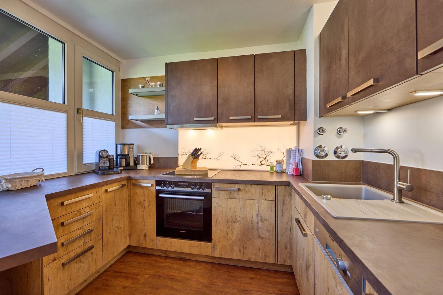 Die moderne, alpine Einbauküche ist ein Highlight. Viele beleuchtete Glaselemente sorgen für ein tolles Ambiente. Elektrogeräte - von der Spülmaschine bis zum Kühlschrank - sind da, die Küche ist voll ausgestattet. Für Kaffeeliebhaber steht sowohl eine Filterkaffeemaschine als auch eine Nespresso-Maschine zum Einsatz bereit.