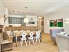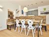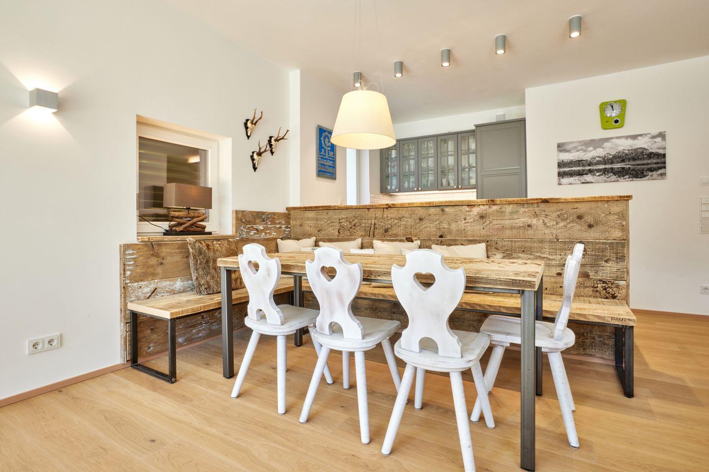 Im Erdgeschoss befindet sich als Herzstück der Wohnung ein großzügiger Wohn- und Essbereich mit integrierter, offener Küche. Die heimelige Sitzgruppe mit Eckbank lädt zum Zusammensitzen am Esstisch ein. Eine gemütliche Sofalandschaft sorgt für den perfekten Ort zum Abschalten oder für Unterhaltung auf dem Flat-TV.