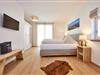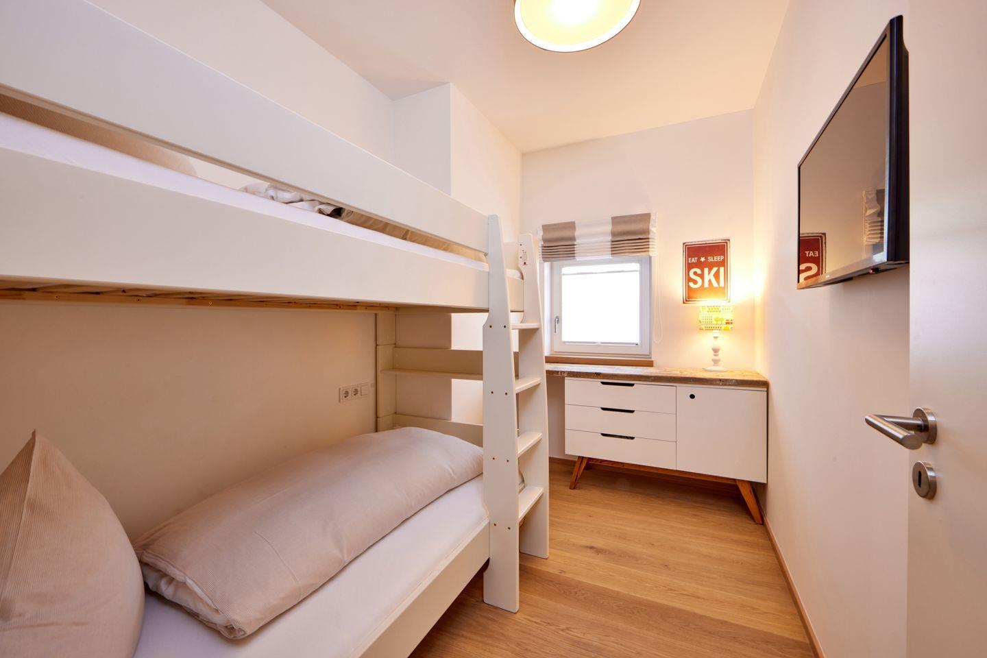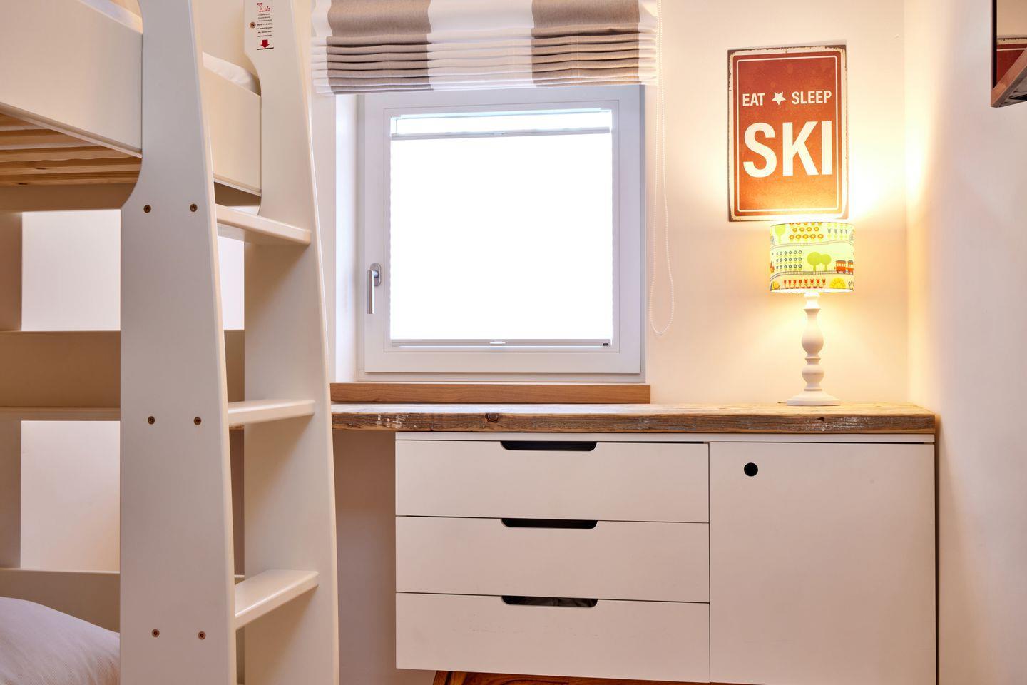 Angrenzend zum Wohnbereich befinden sich ein Bad mit Dusche und zwei der Schlafzimmer. Eines, bestückt mit einem Hochbett, bietet Kindern und Jung gebliebenen ein kuscheliges Plätzchen für die Nachtruhe. Das andere ist mit einem Doppelbett ausgestattet und hat Zugang zu einem eigenen kleinen Badezimmer mit Dusche.