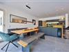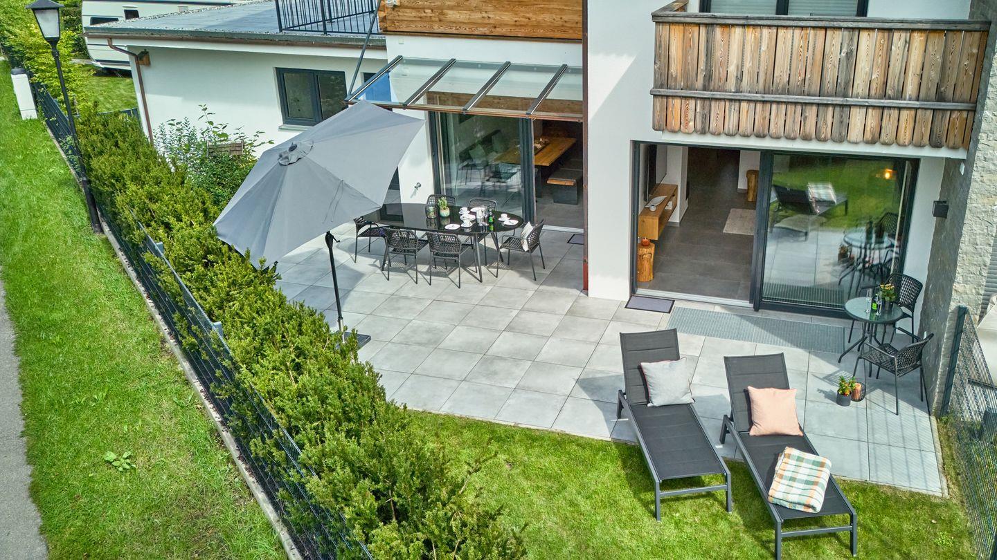 Im Erdgeschoss begrüßt Sie ein heller, offener Wohnraum. Bodentiefe Fenster lassen viel Tageslicht herein und bieten Zugang zur sonnigen Terrasse, auf der Sie in bequemen Gartenmöbeln die herrliche Bergluft genießen können. Am großen Esstisch lässt es sich gesellig zusammensitzen und die offene Küche lässt dank hochwertiger Ausstattung auch begeisterte Köche nichts vermissen. Ein dekorativer Kamin sorgt gerade zu späterer Stunde für eine gemütliche Atmosphäre. Die gemütliche Fernsehecke mit Flachbild-Fernseher und Wohnlandschaft lädt zum Füße hochlegen oder zu einem entspannten Fernsehabend ein.