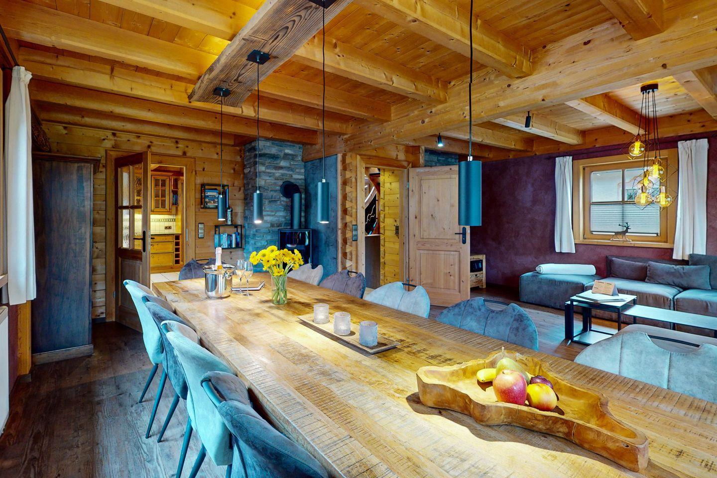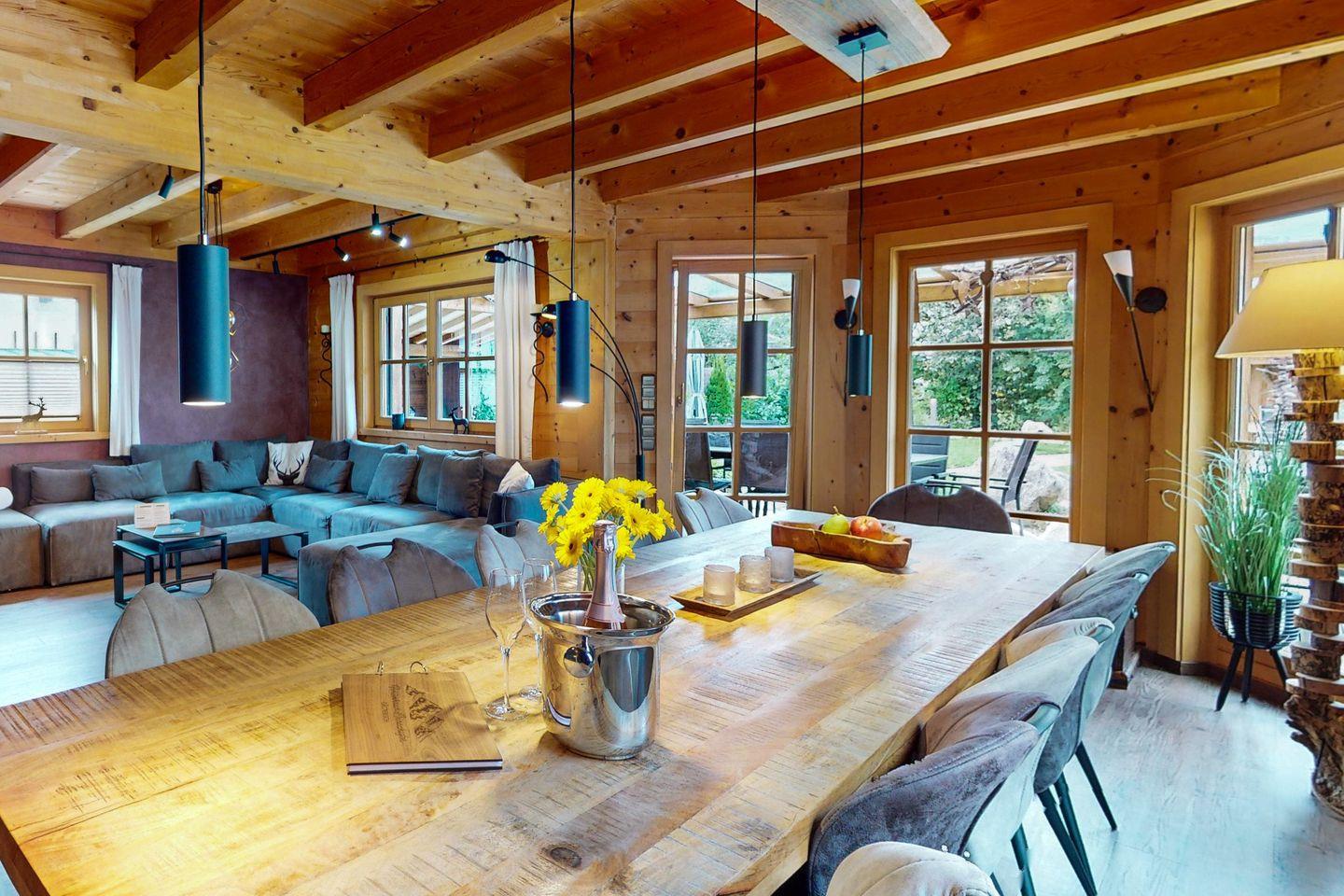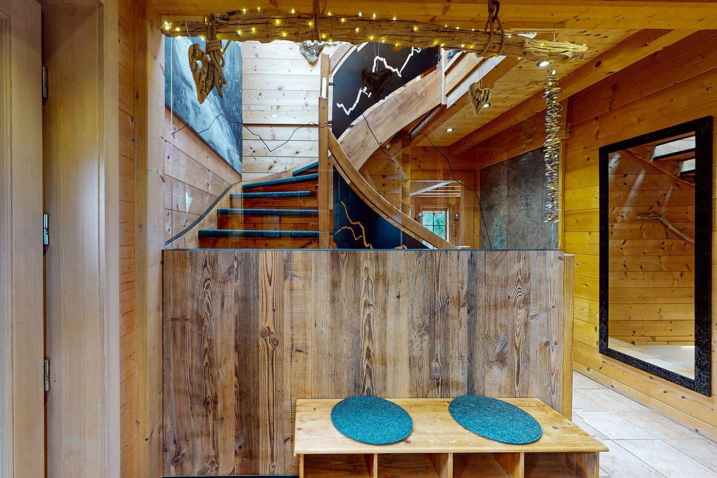 Im Erdschoss erwartet Sie ein offener Eingangsbereich im alpinen Style mit angrenzender Küche, ein Wohn-Essbereich mit gemütlicher Couch, großem Esstisch und einem Schwedenofen, der im Winter für wohlige Wärme sorgt. An das offene Treppenhaus mit Zugang zum Untergeschoss, ist ein zusätzliches Gäste-WC angegrenzt.