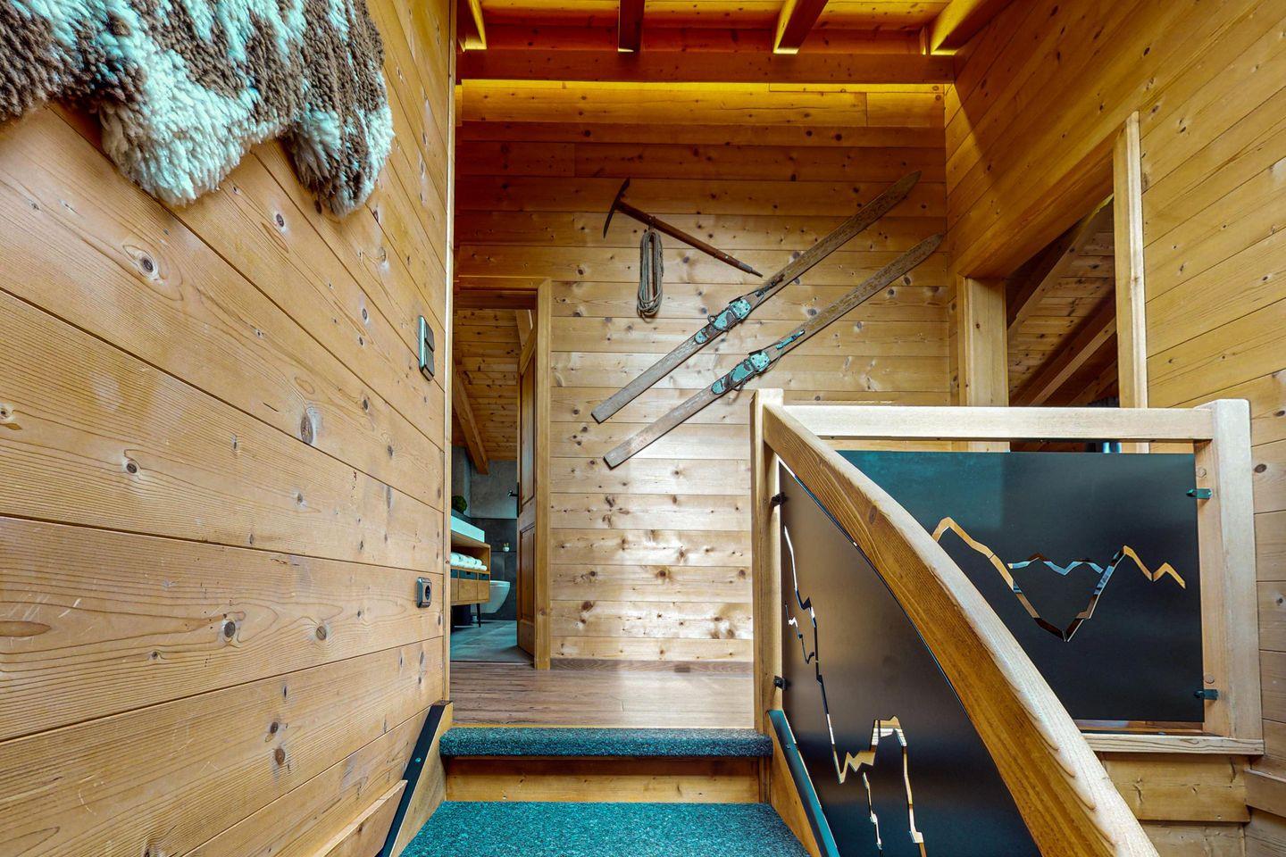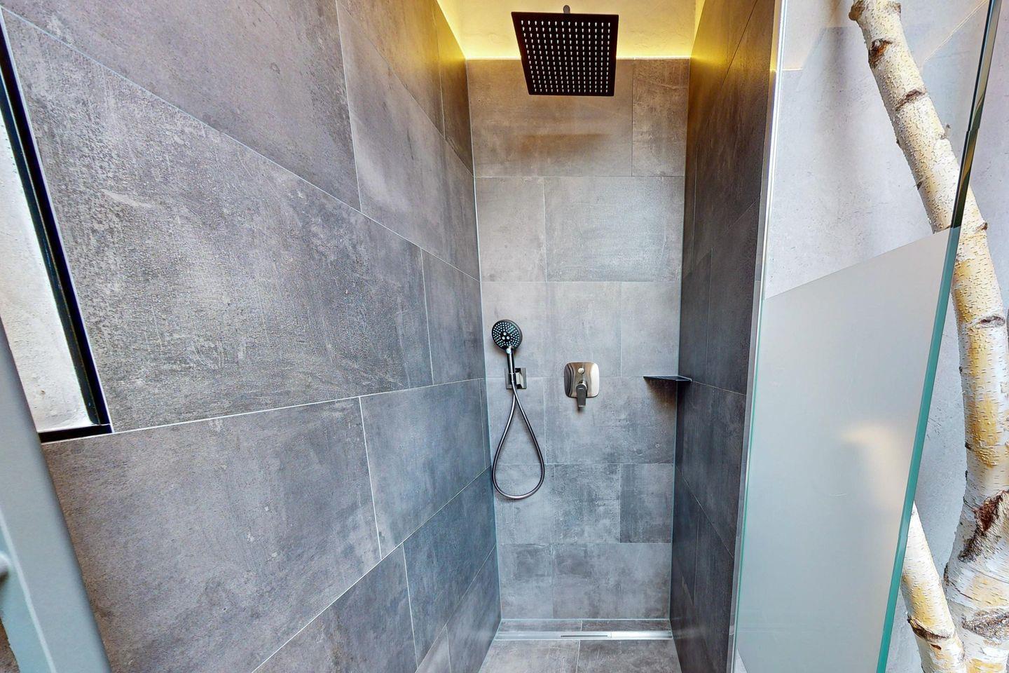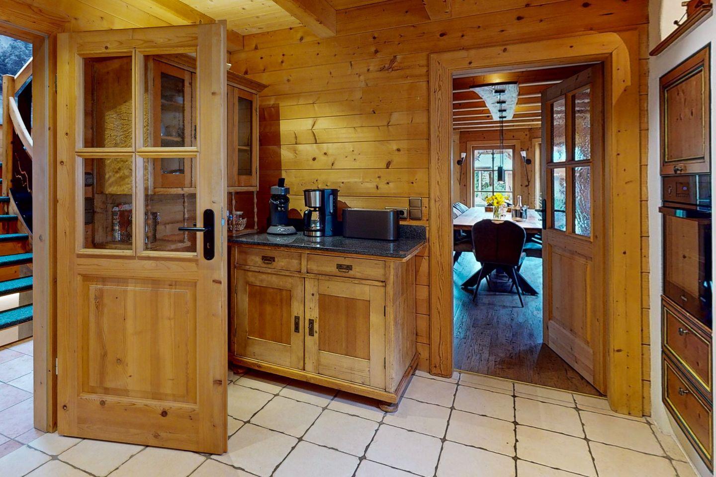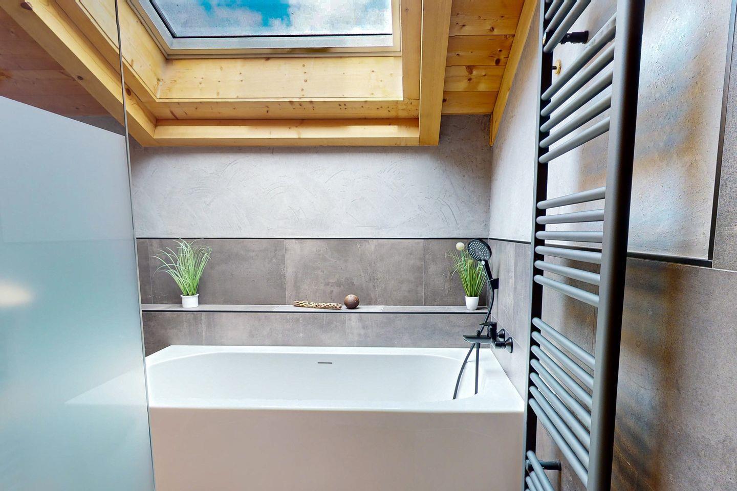 Im Erdschoss erwartet Sie ein offener Eingangsbereich im alpinen Style mit angrenzender Küche, ein Wohn-Essbereich mit gemütlicher Couch, großem Esstisch und einem Schwedenofen, der im Winter für wohlige Wärme sorgt. An das offene Treppenhaus mit Zugang zum Untergeschoss, ist ein zusätzliches Gäste-WC angegrenzt.
