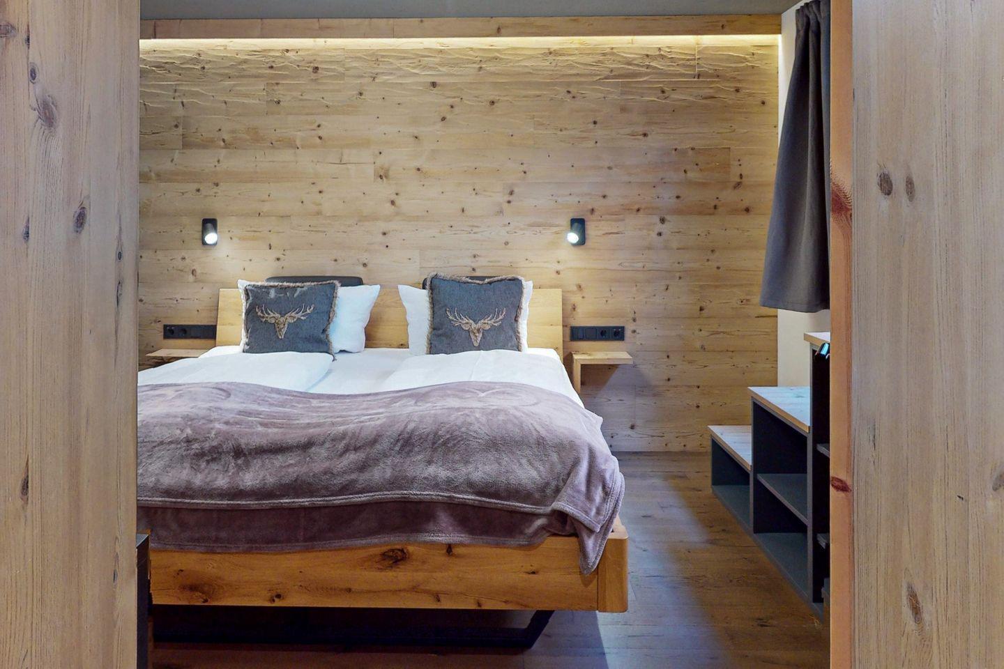 Das geräumige Schlafzimmer mit Doppelbett und Blick auf den Wank bietet eine zusätzliche Couch, die für 2 weitere Schlafmöglichkeiten, mit einer Liegefläche von 1,60 m, ausgezogen werden kann.