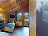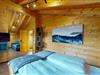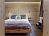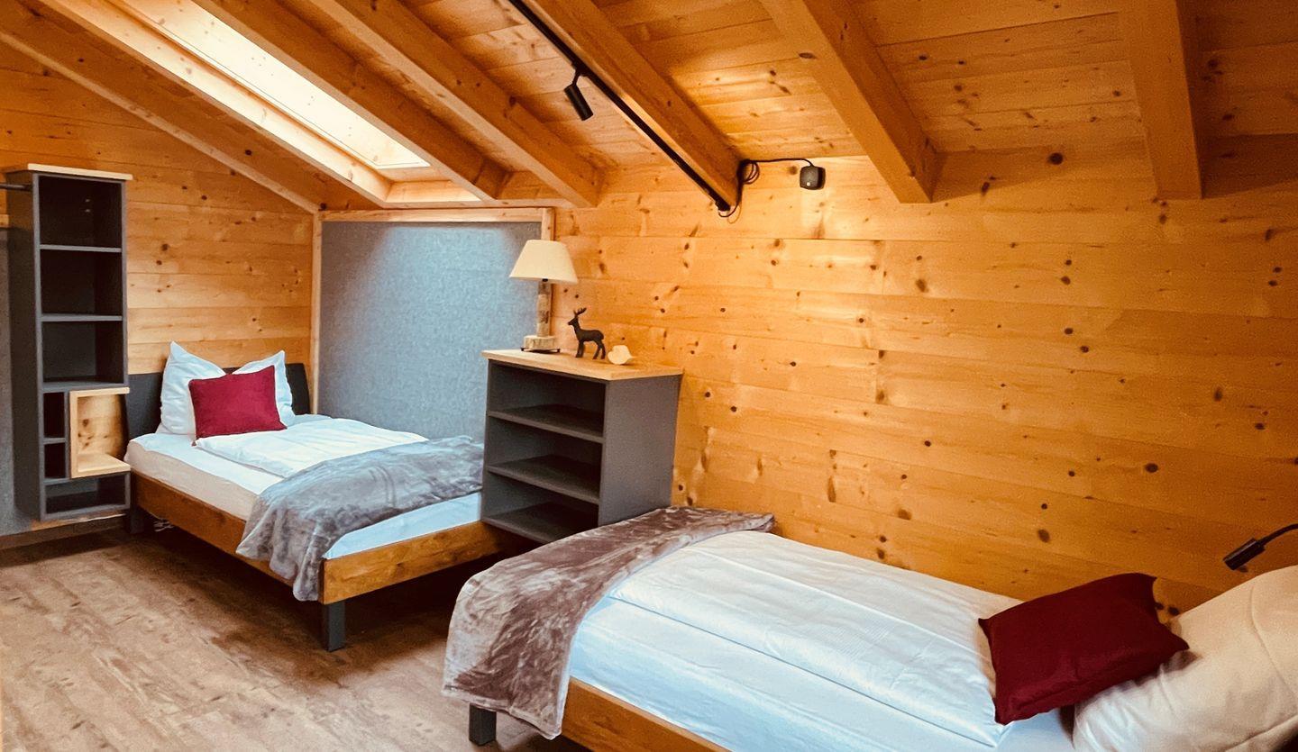 Im Untergeschoss befinden sich 2 weitere Schlafräume, welche durch eine Schiebetür miteinander verbunden sind. Das kleinere Schlafzimmer verfügt über Stockbetten, das größere Zimmer über ein gemütliches Doppelbett. Die lehmverputzten Wände, die Altholzvertäfelung und das große Fenster bieten ein behagliches Wohnklima und Tageslicht. Angrenzend liegt das Badezimmer mit ebenerdiger Dusche, sowie ein separates WC.
