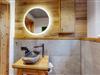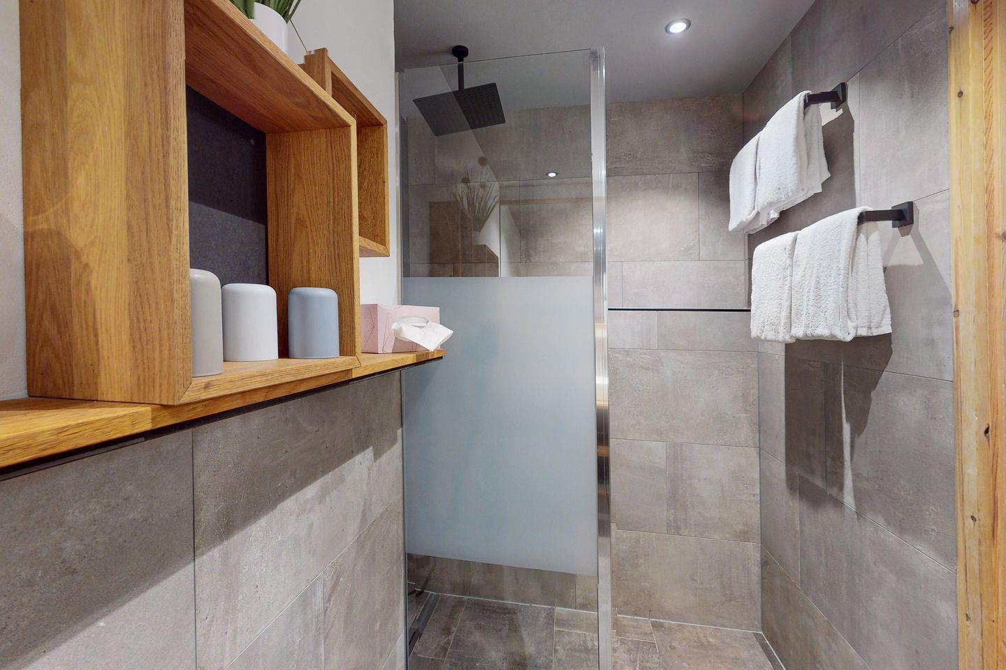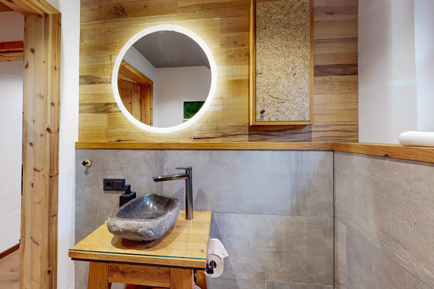 Im Obergeschoss befindet sich das modern gestaltete Badezimmer mit ebenerdiger Dusche, Badewanne und WC, sowie 3 Schlafräume, die mit vielen Naturstoffen, wie Filz, Kork und Holz ausgestattet sind.