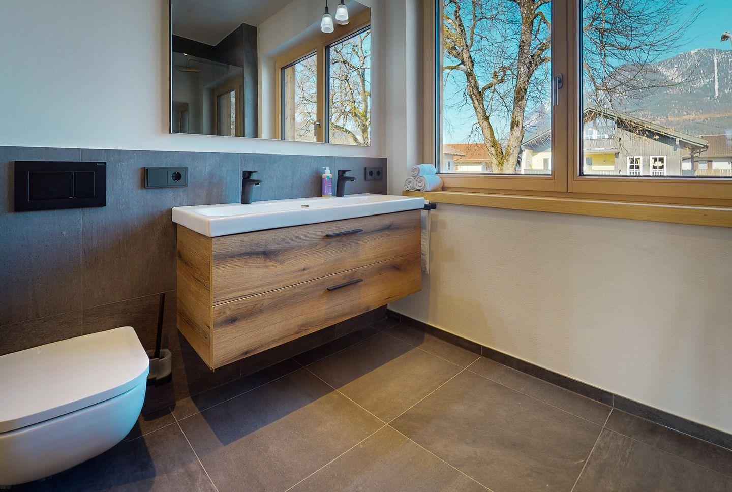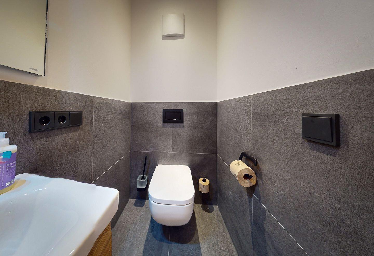 Das mit einer ebenerdigen Regendusche ausgestattete Badezimmer sorgt mit viel Tageslicht für einen erfrischenden Start in den Tag, während ein zusätzliches Gäste-WC die Wohnung praktisch ergänzt.