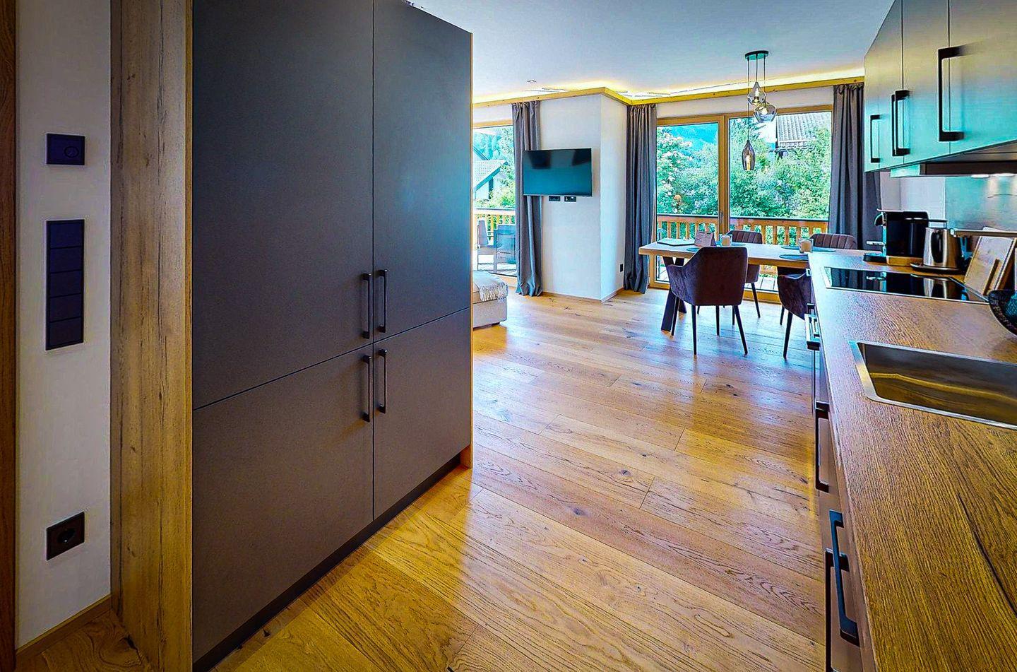 Die Wohnung "Riessersee" einladende 3-Zimmer-Wohnung eine harmonische Mischung aus rustikalem Charme und modernem Komfort. Beim Betreten öffnet sich Ihnen direkt das Herzstück der Wohnung. Ein großzügiger, offen gestalteter Wohnraum mit bequemer Sofaecke mit Fernseher. Daran schließt sich nahtlos die gut ausgestattete Küche und der Essbereich mit einladendem Esstisch an. So bietet Ihnen die Wohnung "Riessersee" einen Raum, der sowohl funktional als auch ästhetisch ansprechend ist und zum gemütlichen Zusammensein einlädt.