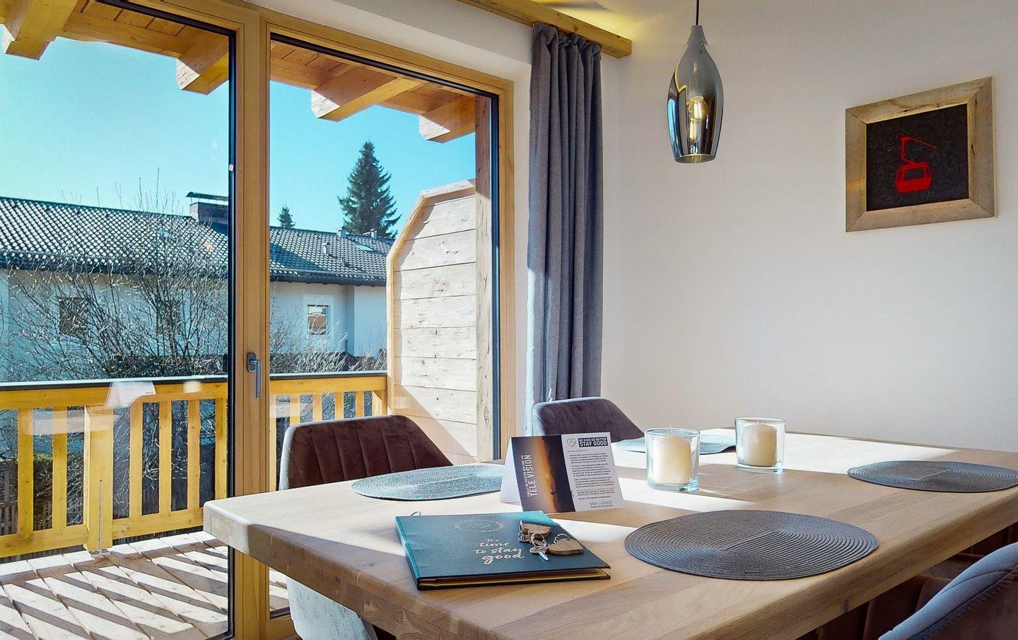 Einer der Höhepunkte dieser Wohnung ist zweifelsohne der große, umlaufende, nach Süden und Westen ausgerichtete Balkon, zu dem sowohl der Wohnraum, als auch die zwei Schlafzimmer Zugang bieten. Von hier aus eröffnet sich ein Bergblick, der den perfekten Rahmen für intime Momente oder zum geselligen Beisammensein an der frischen Luft bietet.