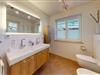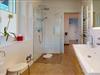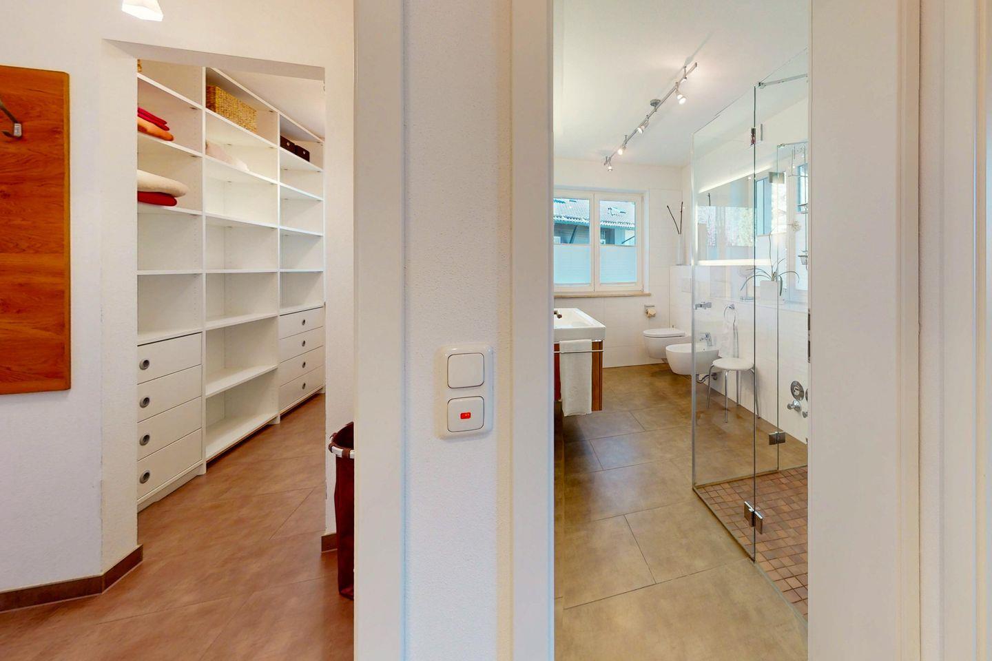 Das Bad lässt durch die Fenster viel Tageslicht herein und ist mit Doppelwaschbecken, ebenerdiger Dusche, WC und Bidet eingerichtet und unterstützt einen komfortablen Aufenthalt.