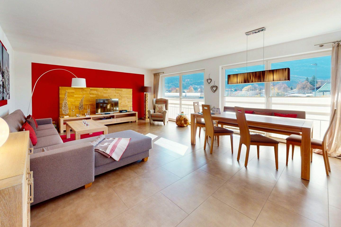 Ein zentrales Merkmal der Ferienwohnung „Maximilian“ ist der umlaufende Balkon nach Süden, Westen und Norden. Die besonders großzügige Südseite bietet viel Platz im Außenbereich und Bergblick auf Alpspitze und Zugspitzmassiv. Der Balkon zieht sich als schmälerer Umlaufbalkon entlang der Fassade weiter und ist sowohl vom Wohnzimmer als auch von beiden Schlafzimmern zugänglich. So stehen mehrere Zugänge ins Freie und unterschiedliche Blickrichtungen in die Berglandschaft zur Verfügung.