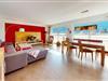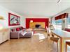 Der Wohn- und Essbereich ist großzügig geschnitten und durch eine breite Fensterfront gut belichtet. Eine komfortable Couchlandschaft, TV und ein Lesesessel bilden die Basis für entspannte Stunden, der Esstisch bietet ausreichend Fläche für gemeinsame Mahlzeiten oder Spieleabende. Direkt angrenzend befindet sich die offene Küche. Sie ist voll ausgestattet – unter anderem mit Herd, Backofen, Mikrowelle, Spülmaschine und den wichtigsten Küchenutensilien – und wird durch eine kleine Theke mit Barhockern ergänzt.