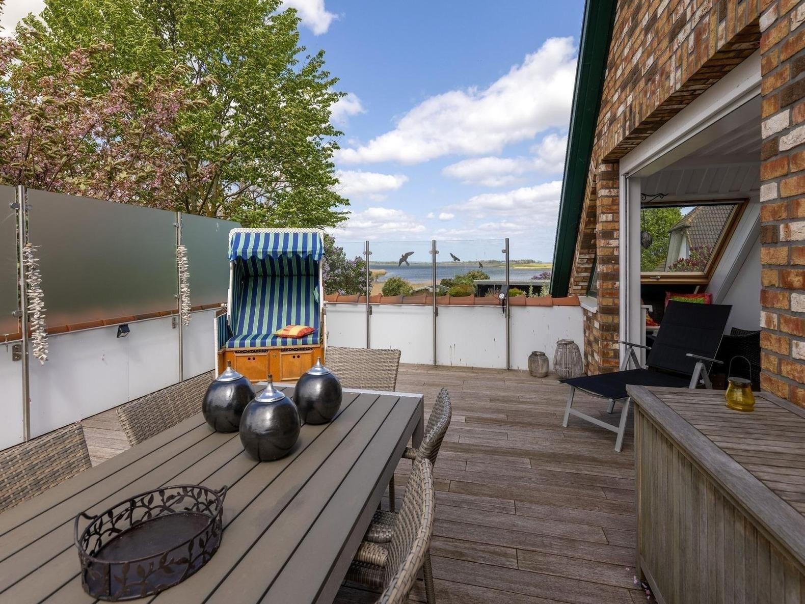 OG-Ferienwohnung „Rügenbrise“ auf Zudar – stilvoll für bis zu 6 Gäste + 2 Kinder. Dachterrasse mit Strandkorb & Boddenblick, Liegewiese am Wasser mit Steg. Idyllische Lage nahe Boddenstrand & Gelbem Ufer.