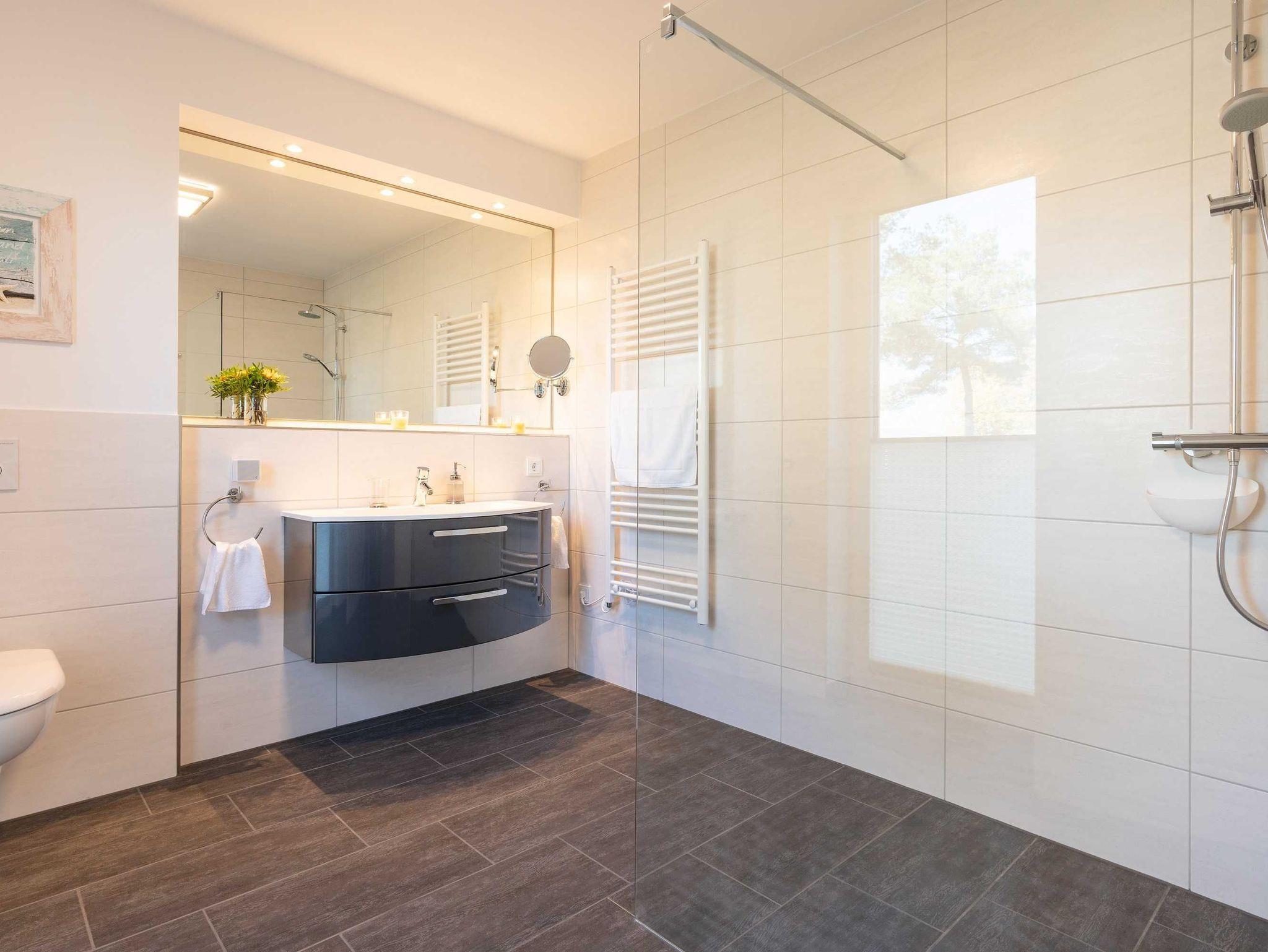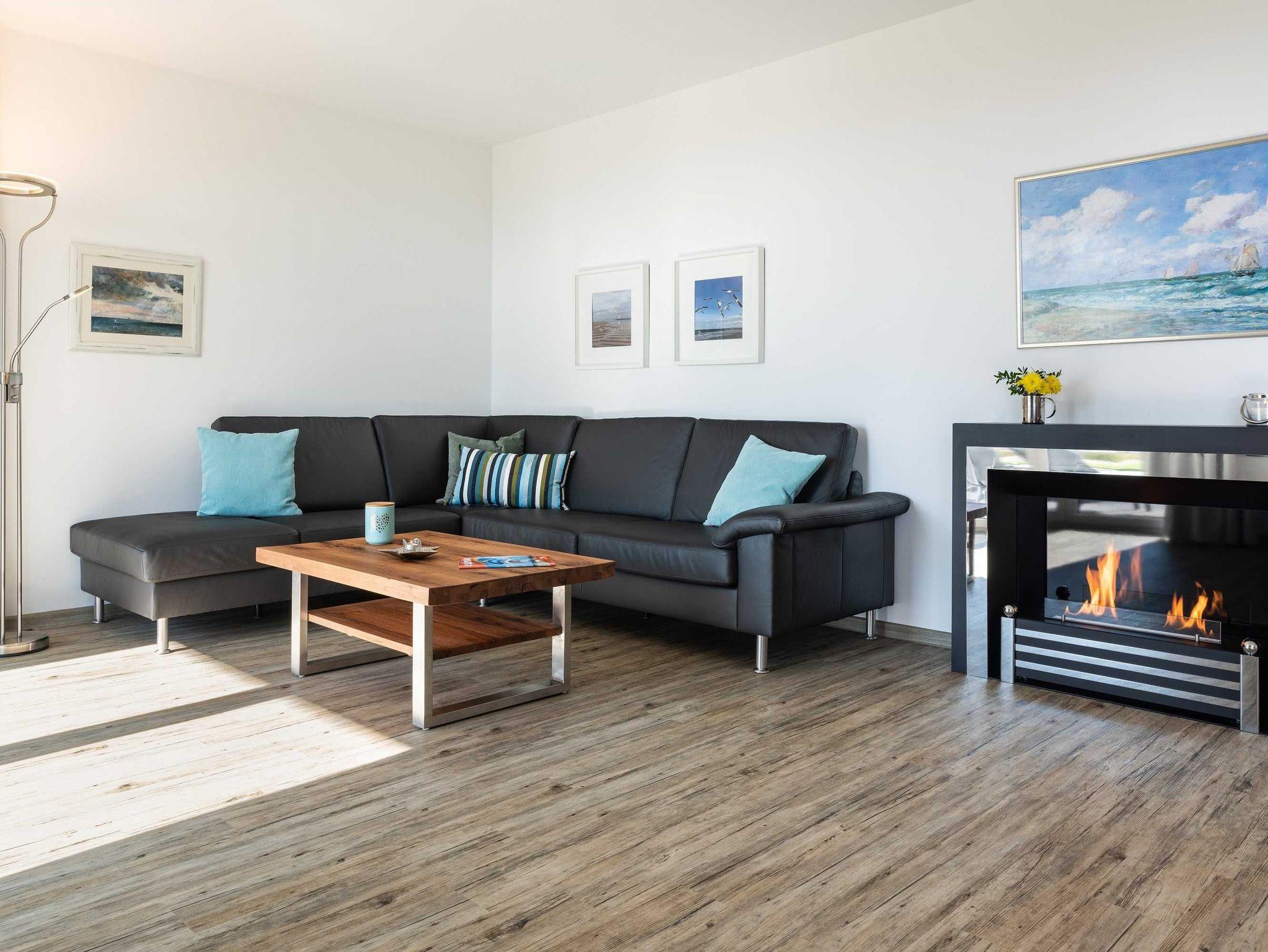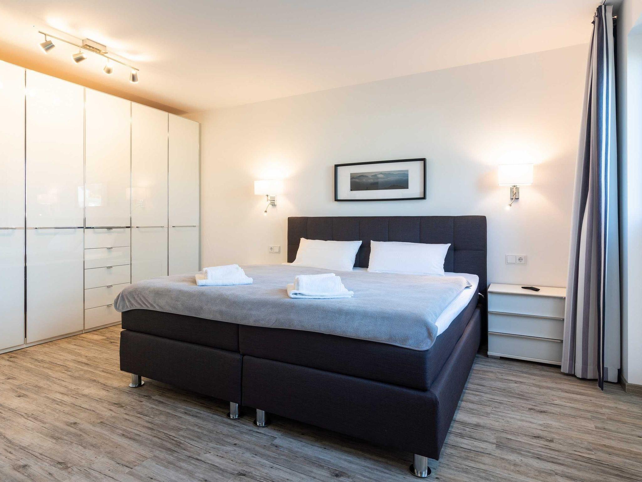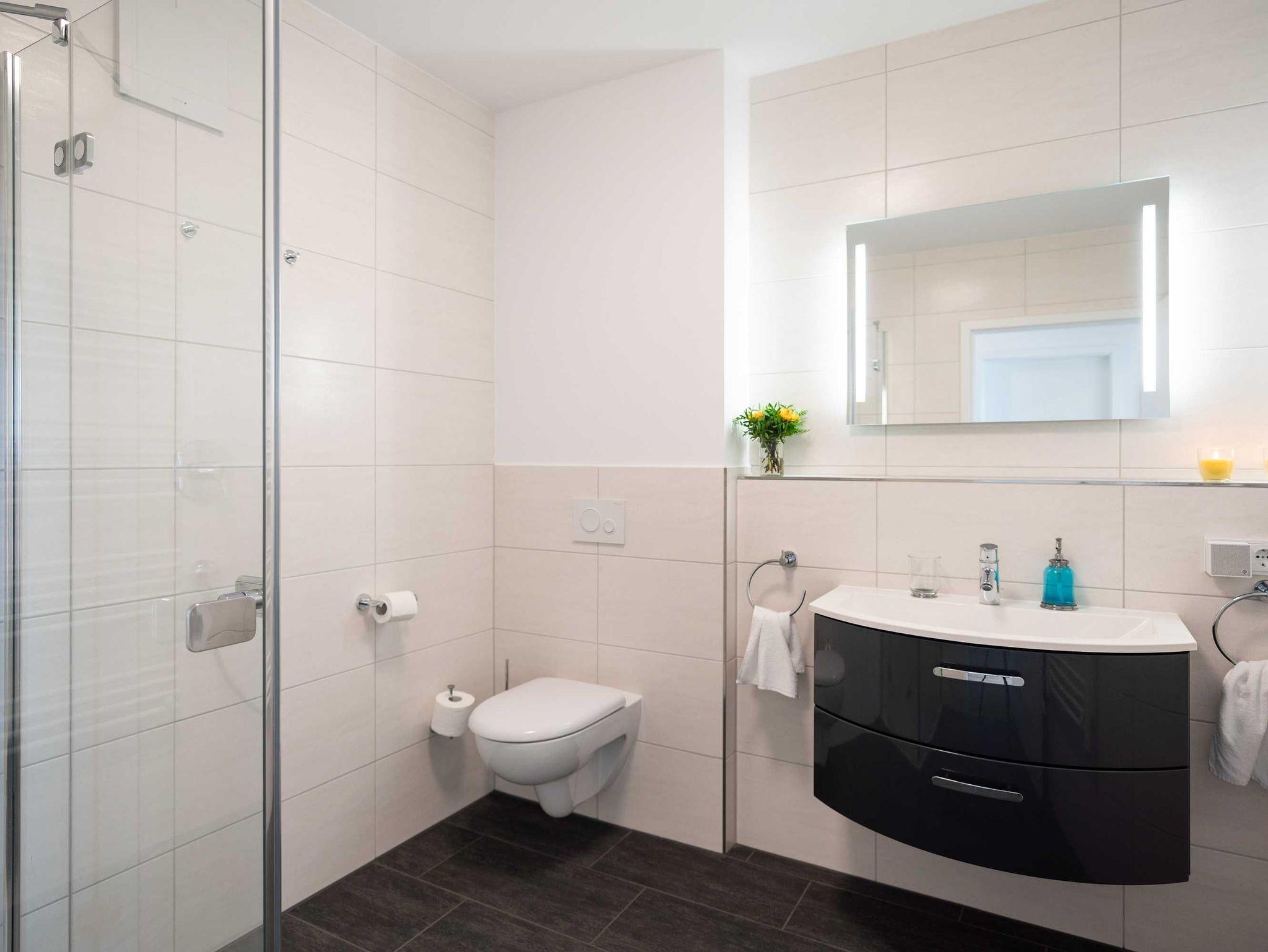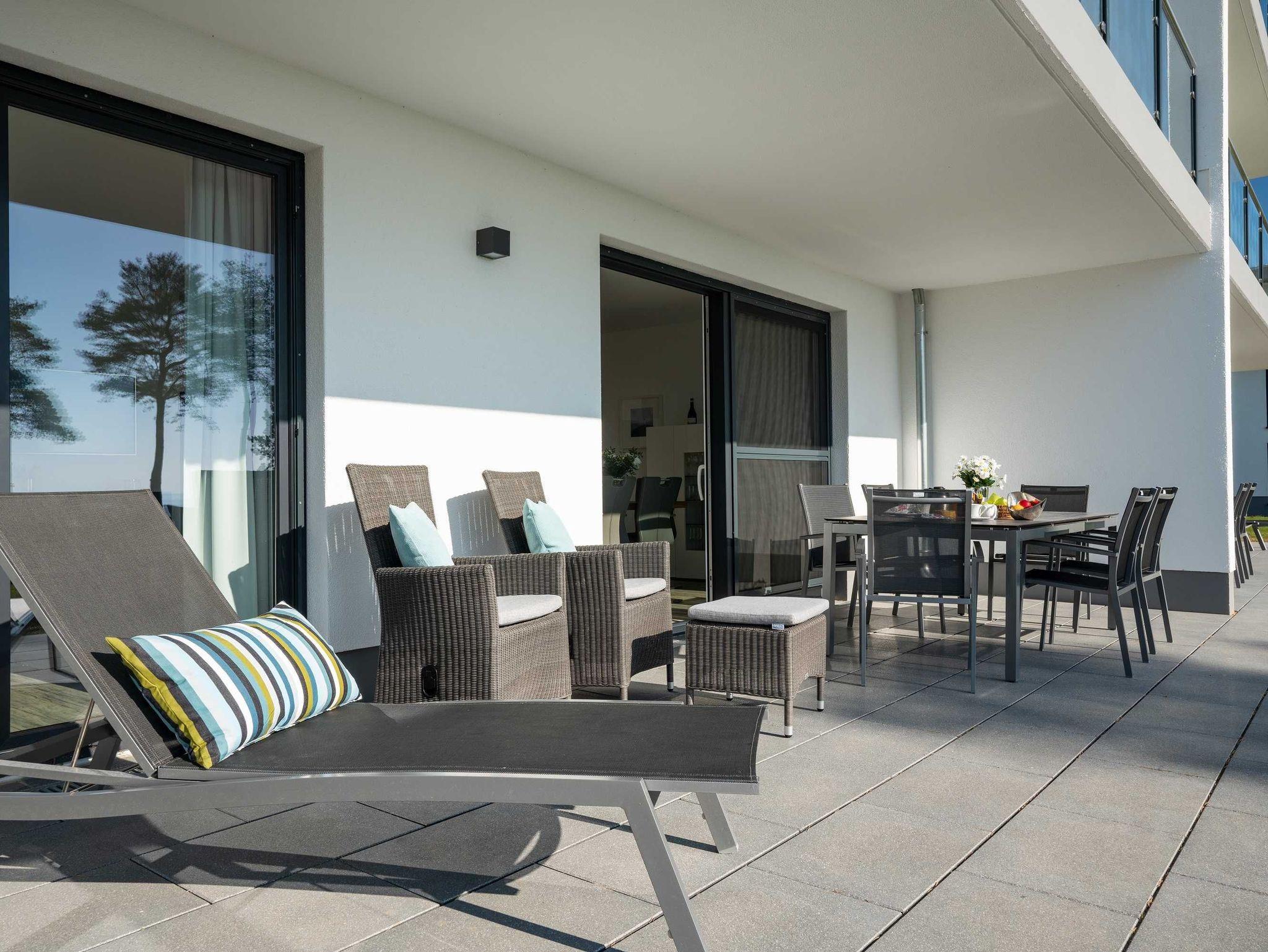 Diese luxuriöse 4-Zimmer-Wohnung im Erdgeschoss von Haus 4 mit Platz für maximal 6 Personen sowie einem Kleinkind bis 2 Jahre im Babybett verfügt über eine Wohnfläche von 119 m² und hat 3 Schlafzimmer sowie 2 voll ausgestattete Duschbäder. Die große Sonnenterrasse mit 21 m² liegt in idealer Süd-Ausrichtung. Die Wohnung ist modern eingerichtet mit offenem Wohn-Essbereich, großem Esstisch, Ledersofa sowie Smart-TV (inkl. Sky-Abo). Die hochwertig ausgestattete Küche, offen zum Wohnbereich, lässt keine Wünsche offen. Erholsamer Schlaf in den beiden Schlafzimmern mit Boxspringbetten und Smart-TV ist garantiert. Im dritten Schlafzimmer befindet sich ein bequemes Schlafsofa (Liegefläche: 1,80 x 2,00 m) und ein Smart-TV. Das Badezimmer en Suite ist mit einer begehbaren Dusche ausgestattet. Auf der großen, überdachten Sonnenterrasse mit Essgruppe und jeweils zwei Relax-Sesseln, Fußhockern, Sonnenschirm und Sonnenliegen können Sie die Seele baumeln lassen.