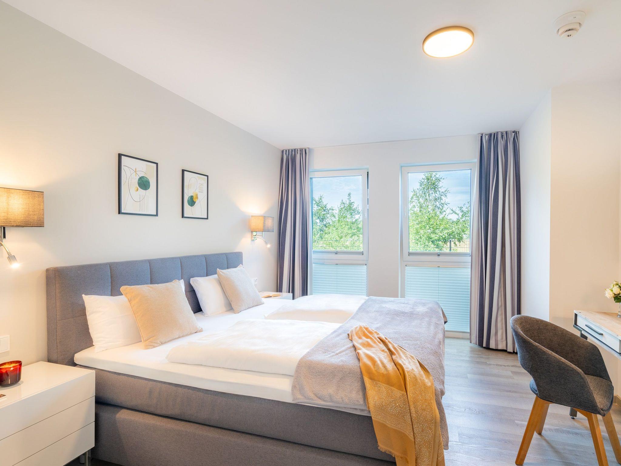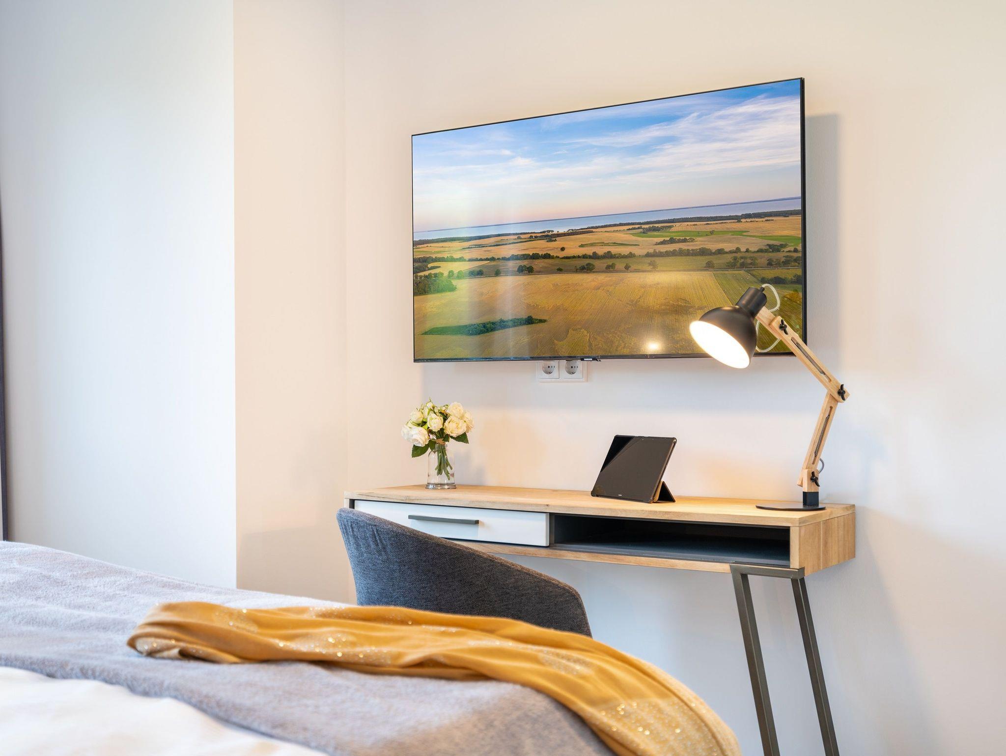 Im zweiten Schlafzimmer finden Sie ebenfalls ein komfortables Boxspringbett (180 x 200 cm), einen Kleiderschrank, einen Schreibtisch und einen Smart-TV vor.
