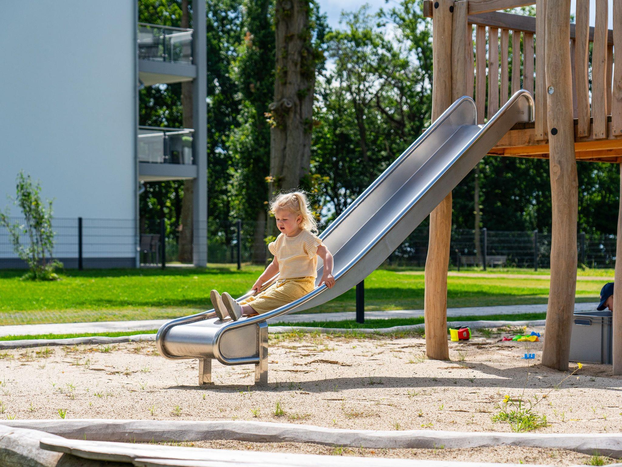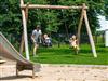 Der vordere, eingezäunte Grundstücksbereich bietet zahlreiche Spielmöglichkeiten für Kinder, darunter eine große Spielanlage mit Rutsche, ein Sandkasten sowie eine Sandbaustelle, ein Wipptier, eine Kinderschaukel und ein Drehkarussell. Zahlreiche Sitzgelegenheiten laden zum Verweilen und Sonne tanken ein.