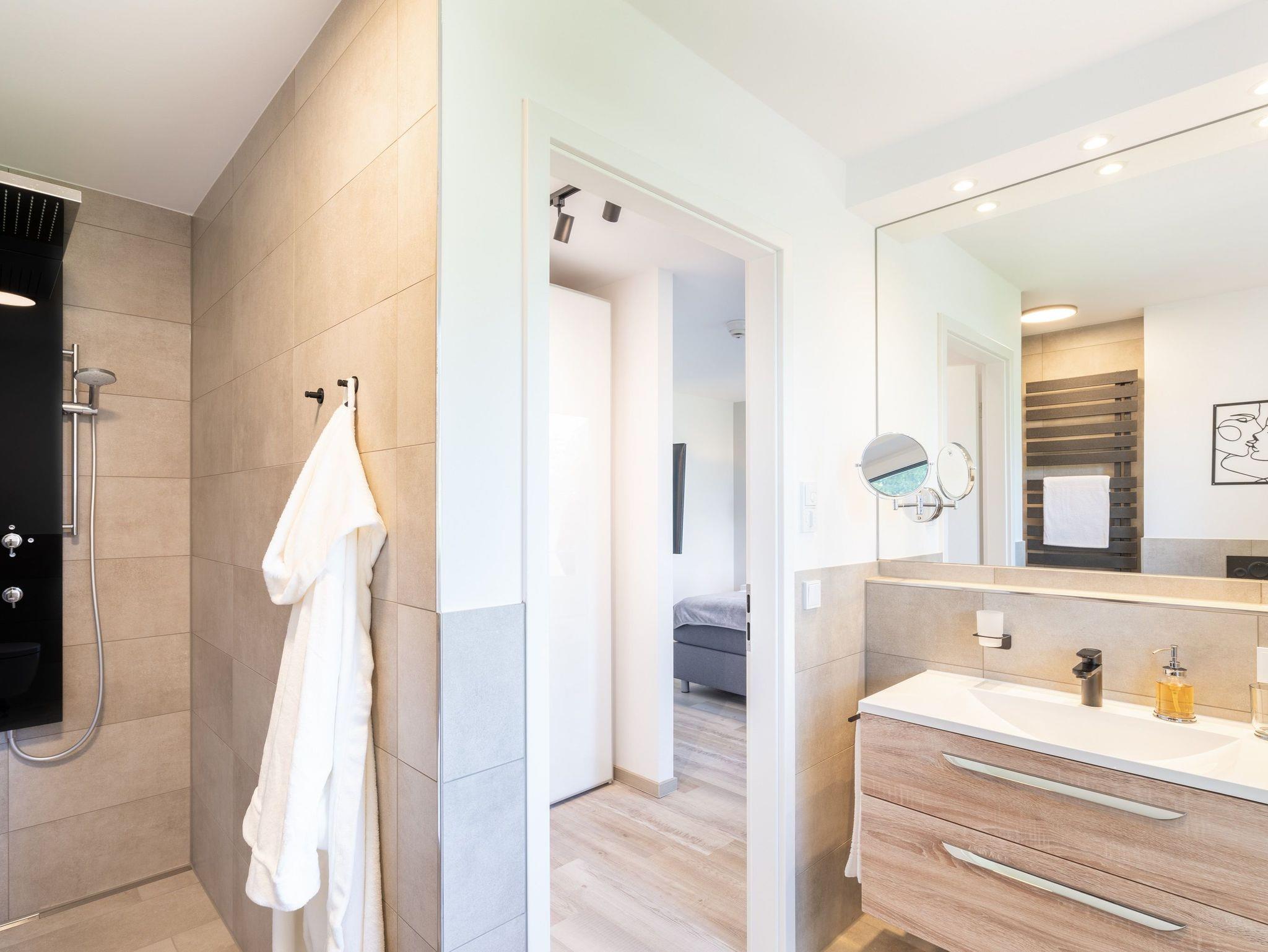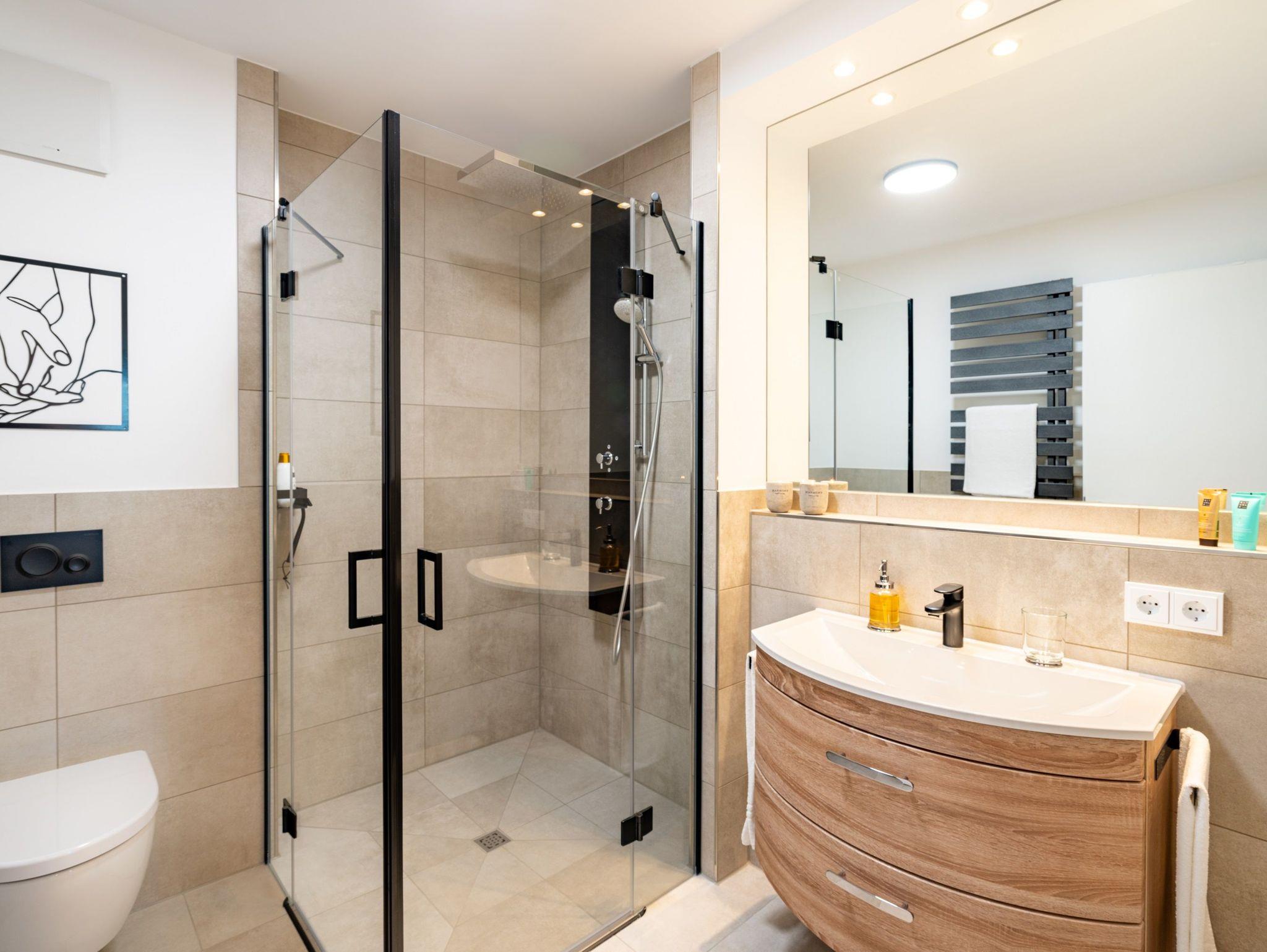 Im zweiten, voll ausgestatteten Badezimmer steht Ihnen eine großzügige Ganzglas-Duschkabine mit den Maßen 120 x 120 cm zur Verfügung.