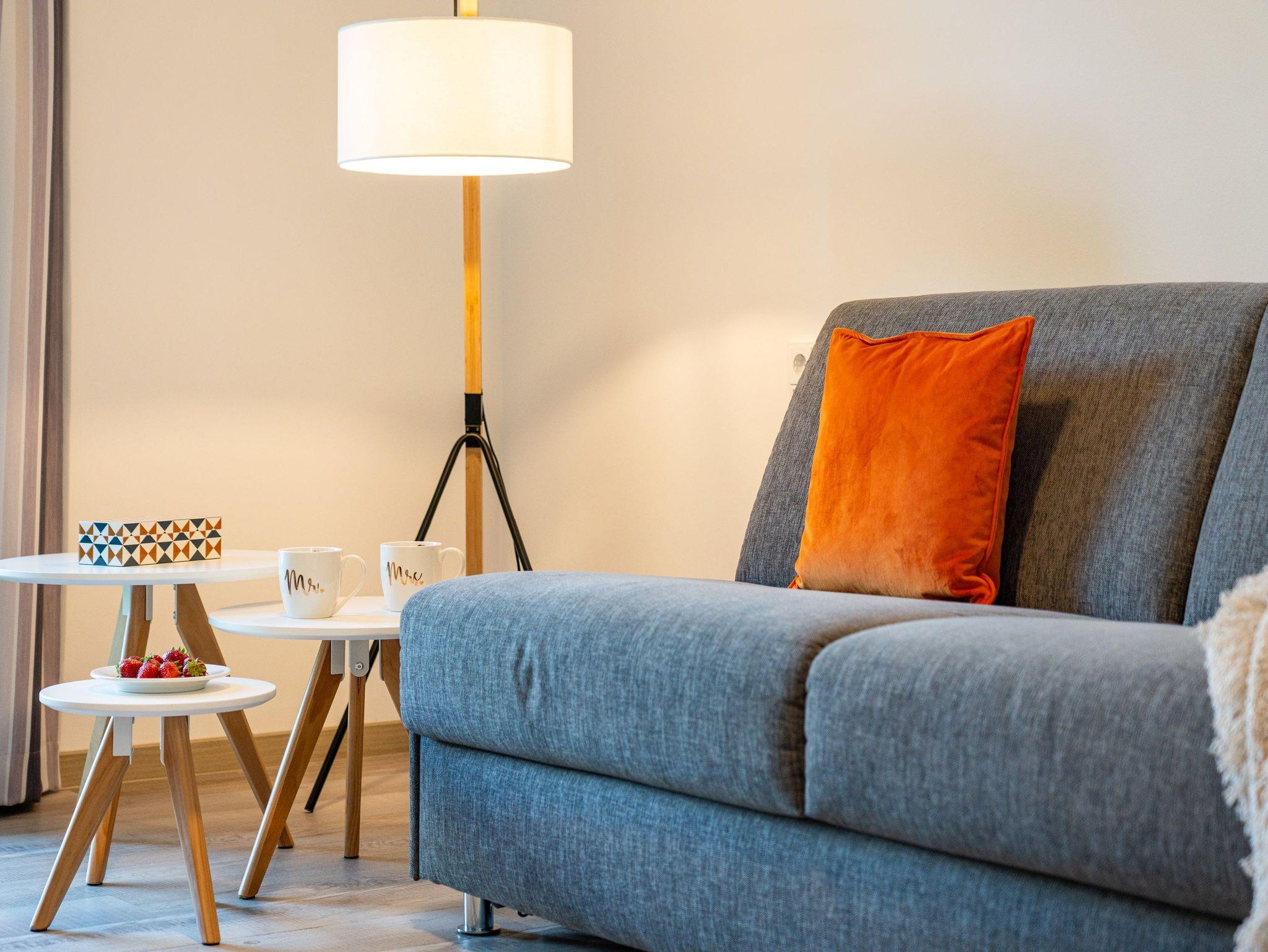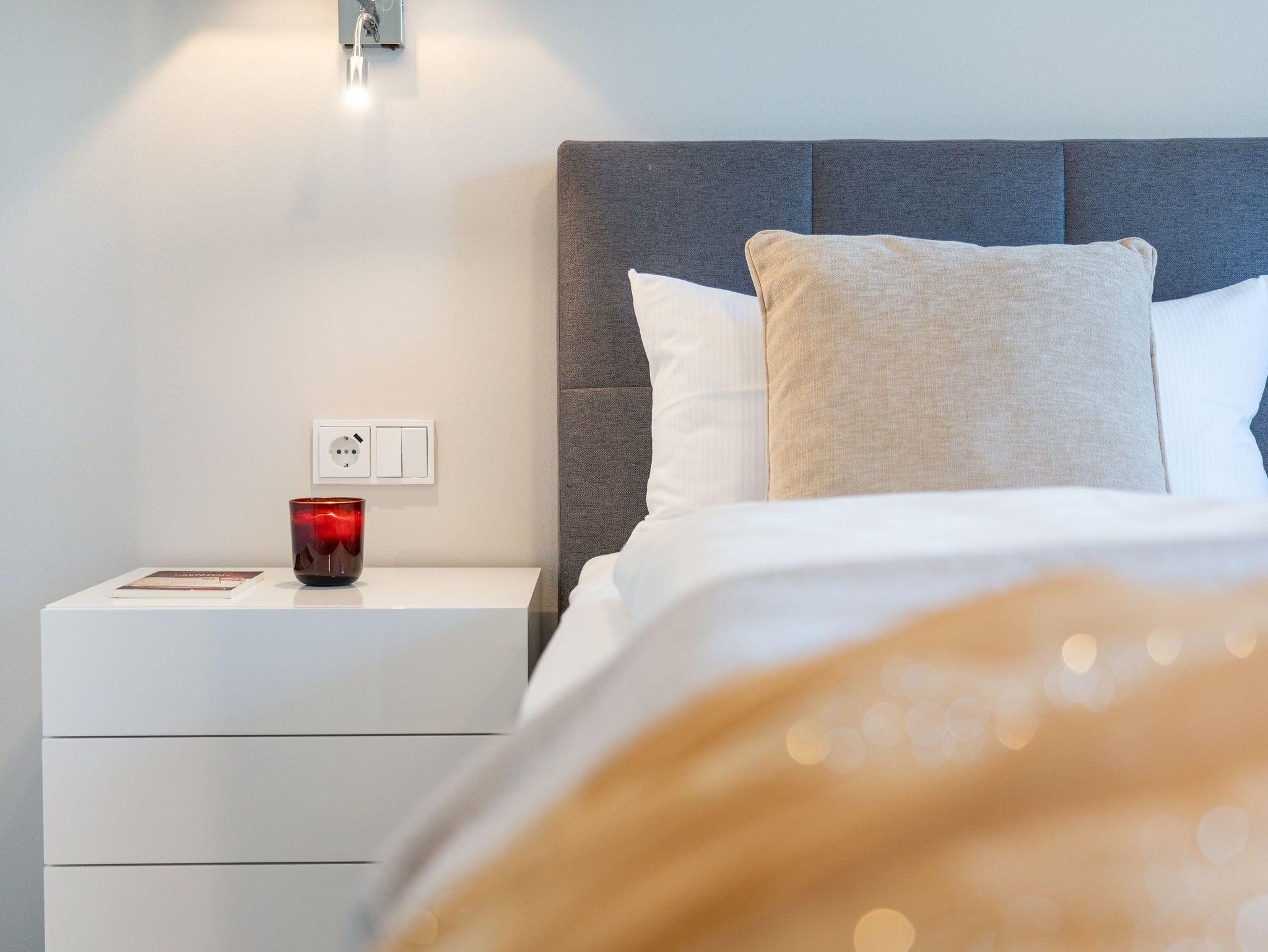 Informationen für Gäste mit Mobilitätseinschränkung: Der Zugang vom Carportstellplatz bis zum Hauseingang ist barrierefrei gestaltet. Direkt vor dem Haus befindet sich eine Kurzzeitparkfläche, die für Be- und Entladevorgänge genutzt werden kann. Die Distanz von der Carportanlage bis zur Hauseingangstür beträgt etwa 30 Meter. Die Breite der Haustür beträgt 100 cm und weist eine Schwelle von etwa 1,5 cm Höhe auf. Der Aufzug im Treppenhaus bedient alle Etagen des Hauses, einschließlich des Freizeit- und Saunabereichs im Untergeschoss. Die Türbreite des Aufzugs beträgt 90 cm, die Tiefe liegt bei 130 cm. Die schwellenlose Wohnungstür weist eine Breite von 90 cm auf. Die Breiten der schwellenlosen Zimmertüren liegen bei 80 cm (Ausnahme: Türbreite von der Abstellkammer beträgt 70 cm). Der schwellenlose Duscheingang im en suite Badezimmer weist eine Breite von 90 cm auf, die Tiefe liegt bei 200 cm. Auf Wunsch kann ein Duschhocker kostenfrei zur Verfügung gestellt werden. Die Waschtische sind nicht unterfahrbar und Haltegriffe sind nicht in den Badezimmern vorhanden. Der Duscheingang im zweiten Badezimmer weist eine Breite von 90 cm auf. Die Höhe der Duschtasse beträgt 1 cm. Die Betten weisen eine Höhe von 65 cm auf und sind unterfahrbar (max. 10 cm). Die Terrassenschiebetür lässt sich auf eine Breite von 130 cm öffnen, die Höhe der Schwelle beträgt 1,5 cm. Die Sauna im Untergeschoss ist schwellenlos erreichbar. Die Schwelle am Saunaeingang beträgt 10 cm, die Breite der Saunatür beträgt 60 cm. Die Breite der Tür zum Ruheraum beträgt 90 cm und weist eine Schwelle von etwa 2 cm auf.