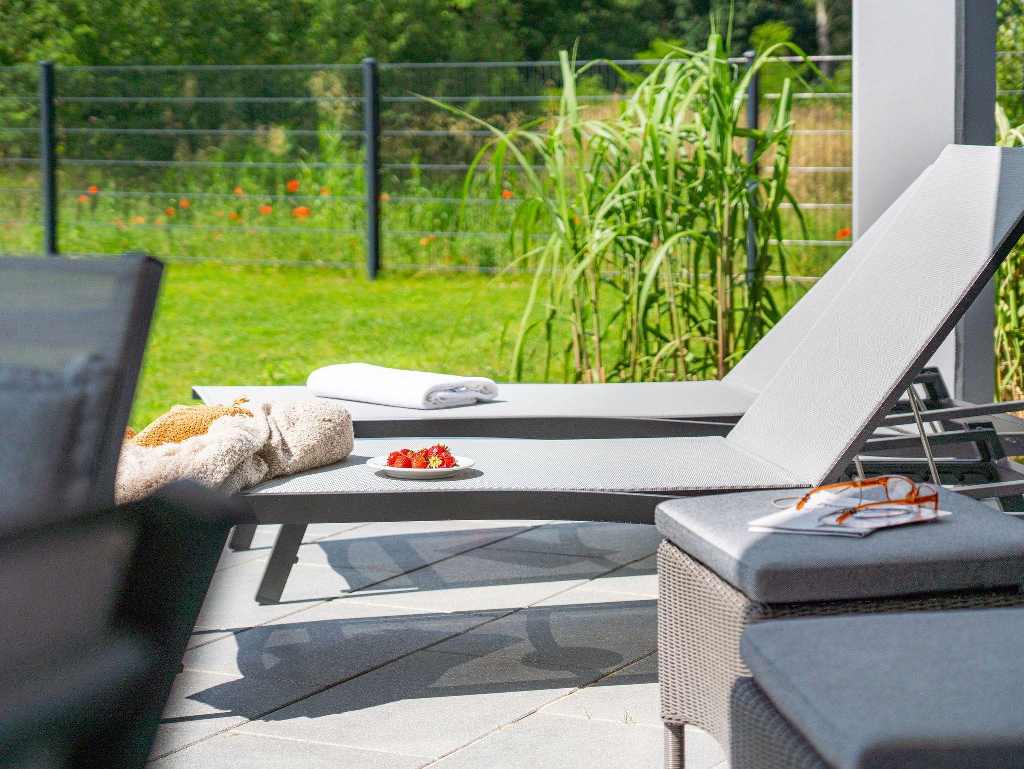 Die 20 m² große, überdachte Sonnenterrasse bietet reichlich Platz für Entspannung und Geselligkeit. Ein großer Esstisch mit sechs Stühlen lädt zu gemeinsamen Mahlzeiten ein, während die gemütliche Sitzgruppe mit zwei verstellbaren Relaxsesseln samt Fußhockern perfekte Plätze für entspannte Stunden bieten. Sonnenanbeterinnen und Sonnenanbeter können es sich auf den zwei bequemen Sonnenliegen gemütlich machen und ausgiebige Sonnenbäder genießen.