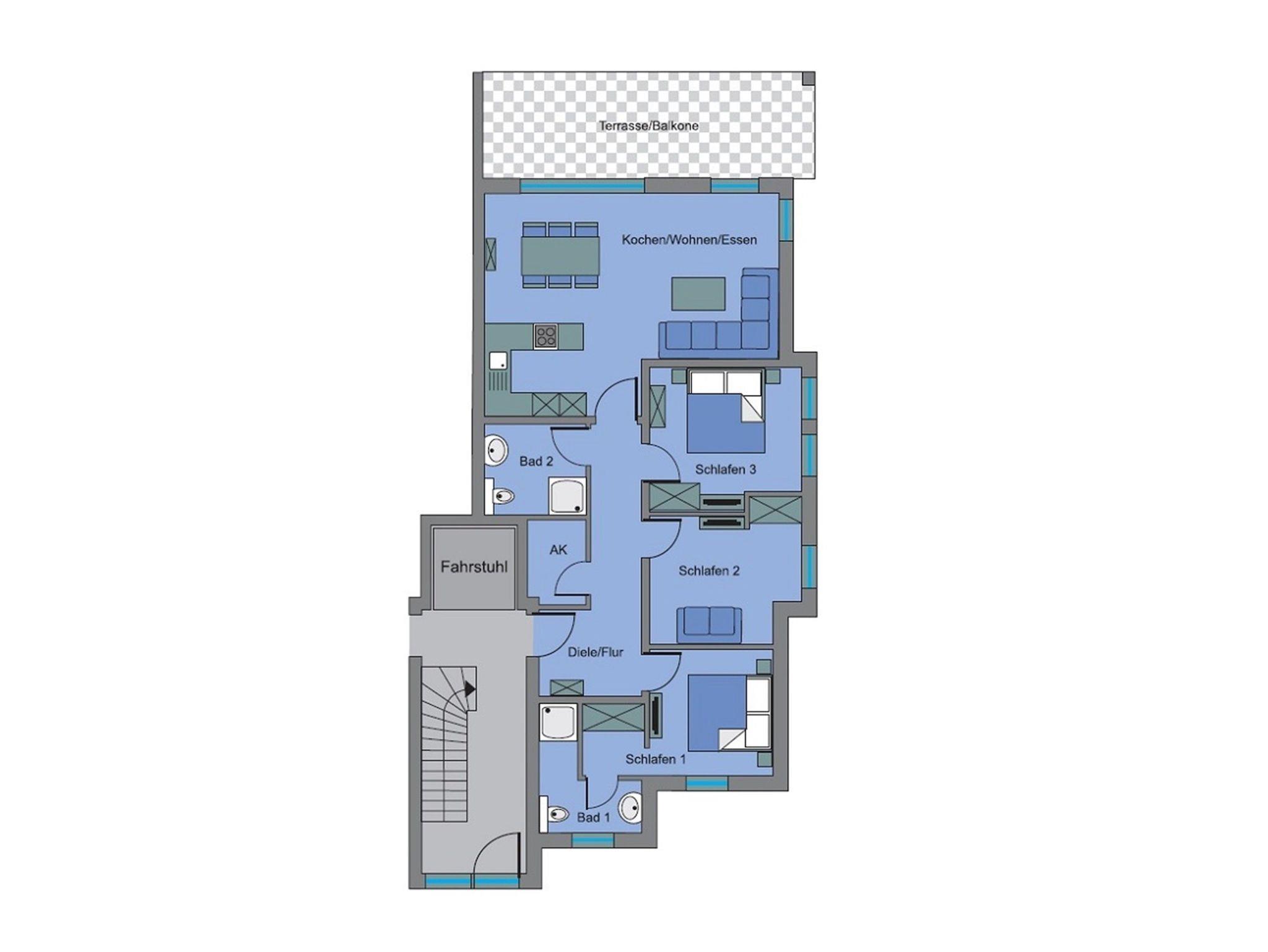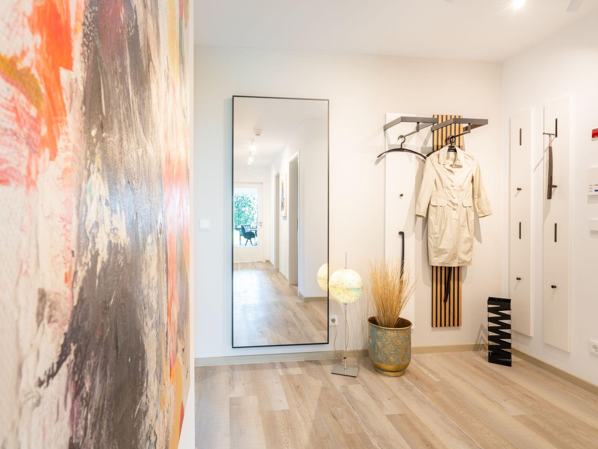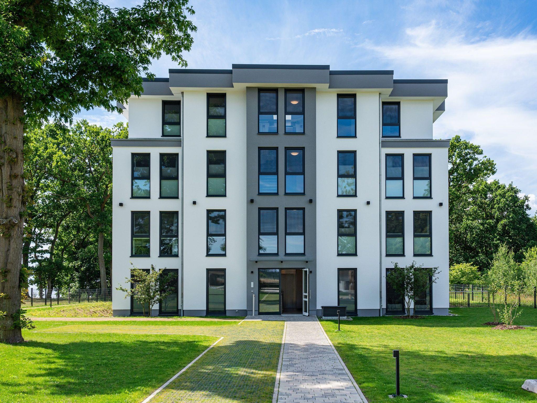 Die barrierefreie und sonnendurchflutete 4-Zimmer-Ferienwohnung liegt im Erdgeschoss des 8-Parteienhauses. Ein Aufzug ist vorhanden, der jede Etage anfährt.