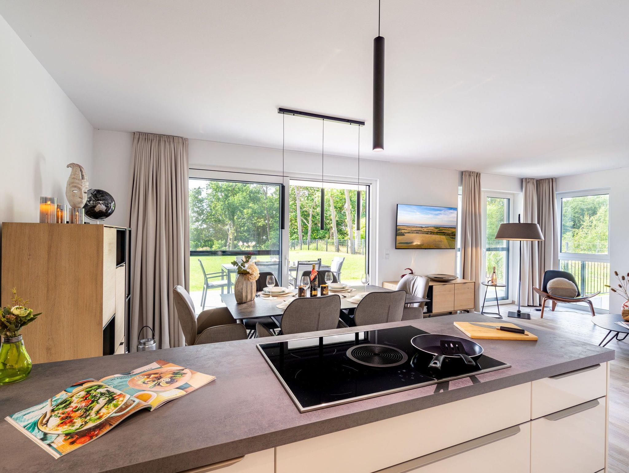 Diese im Jahr 2024 fertiggestellte Ferienwohnung verfügt über eine Wohnfläche von 112 m² und befindet sich im Haus 8, das etwa 400 Meter von den anderen „Oase am Haff“-Häusern entfernt auf einem separaten Grundstück in gleicher Südlage liegt.