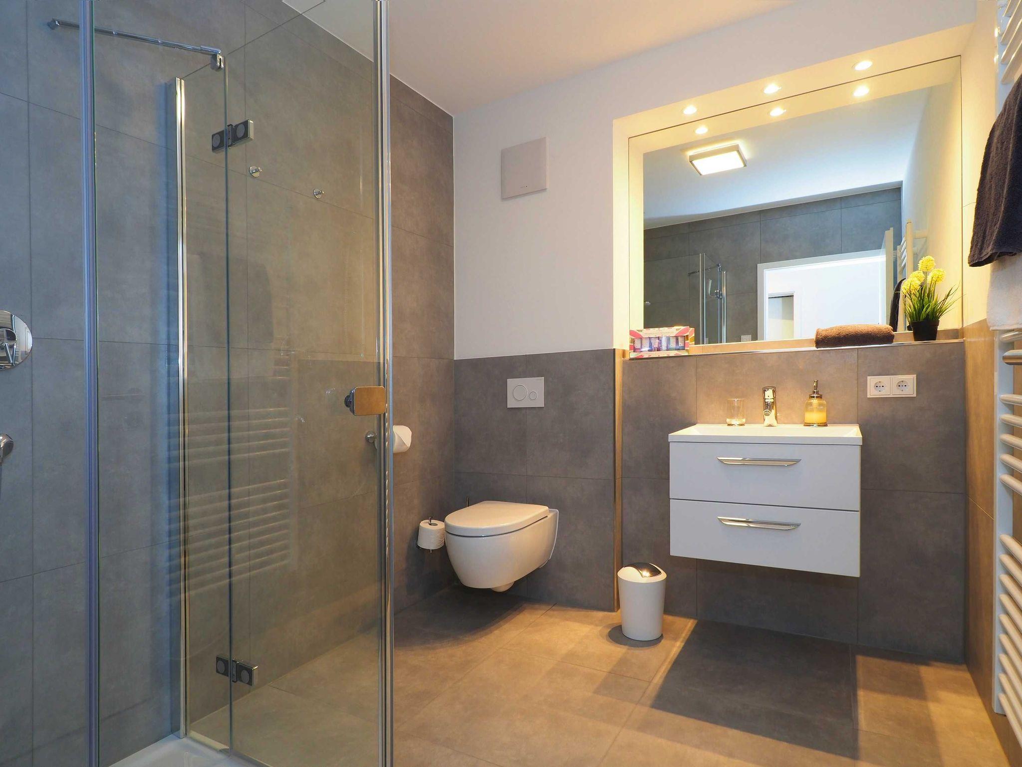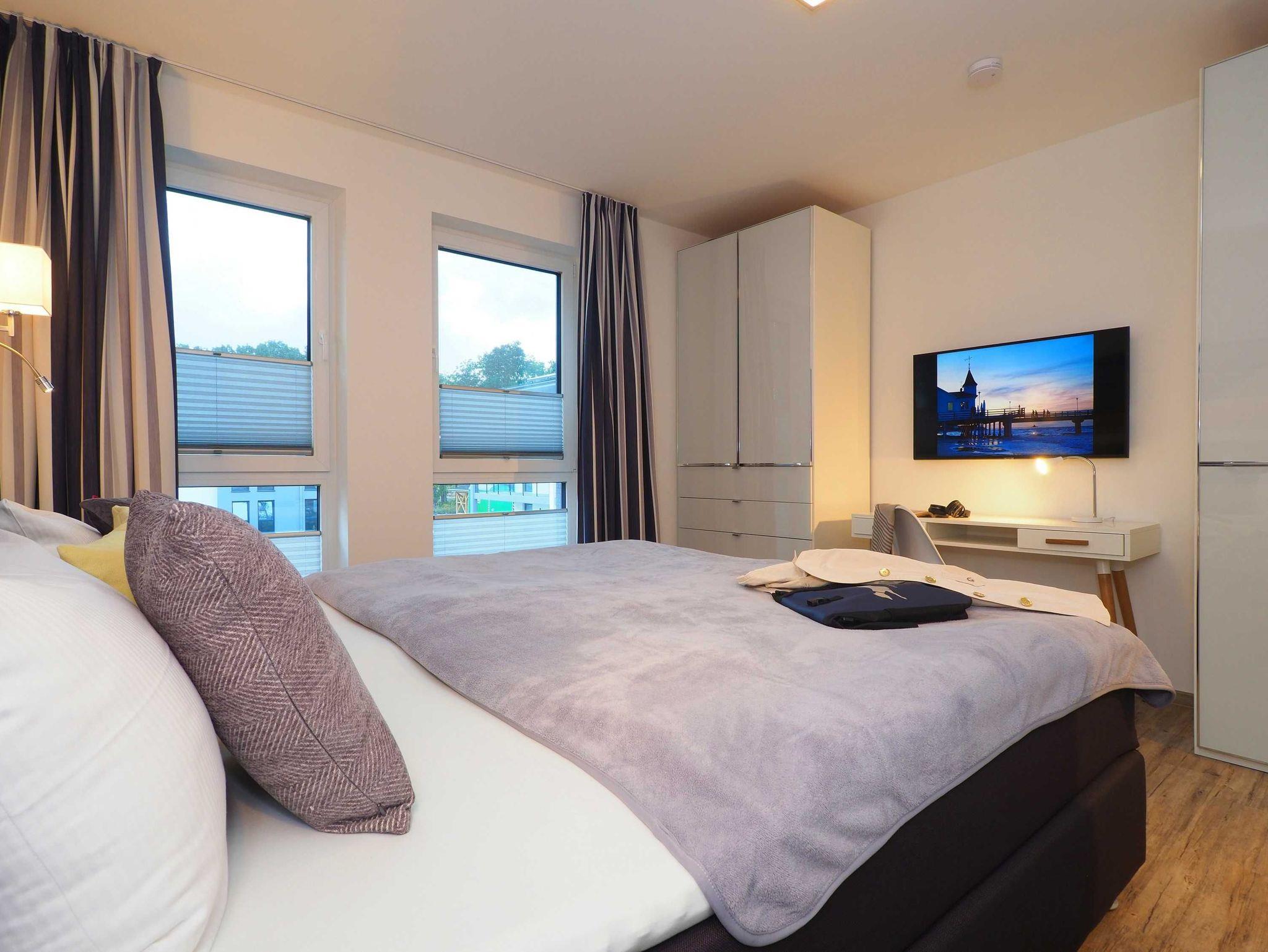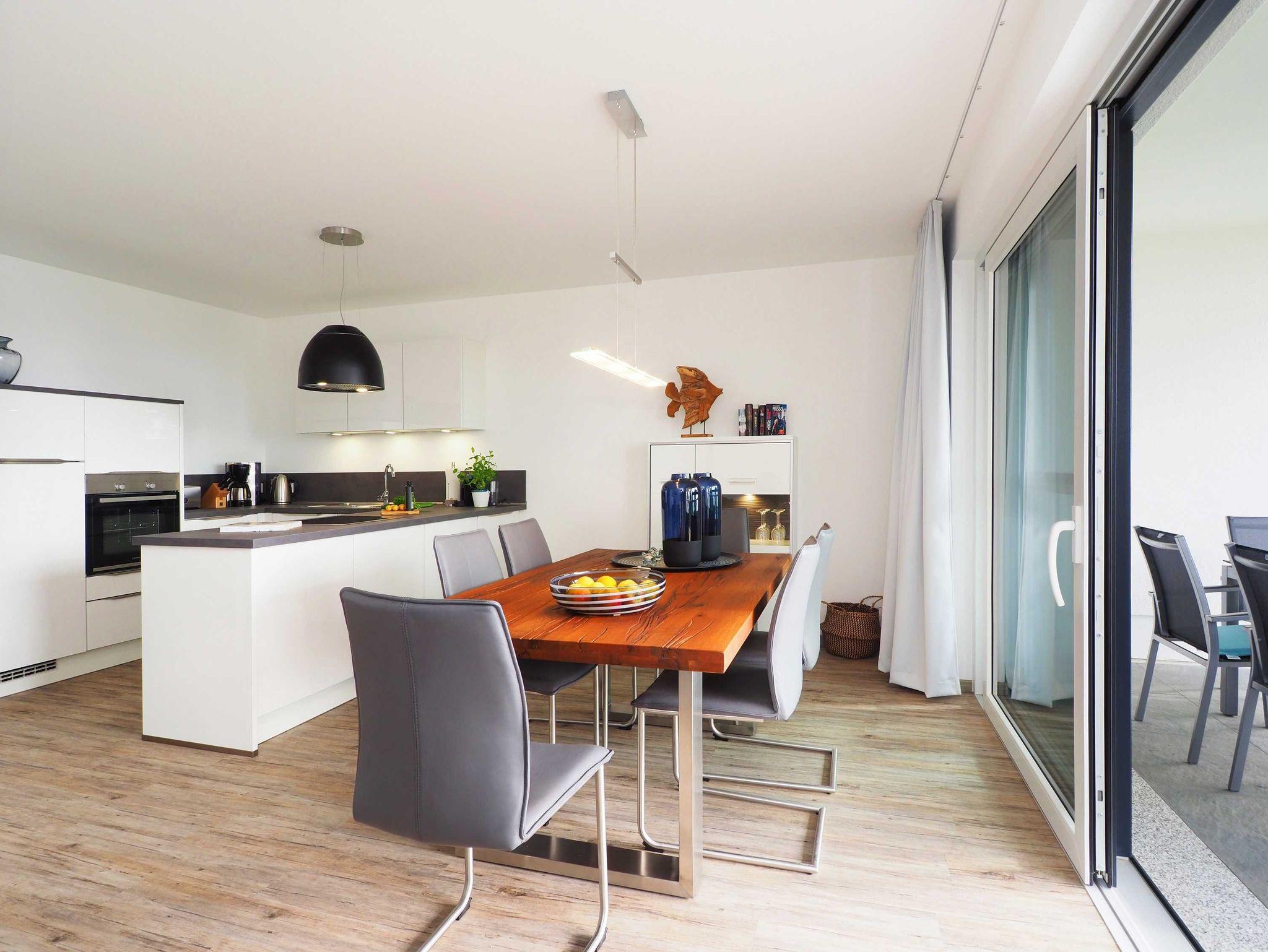 Diese luxuriöse 3-Zimmer-Wohnung im ersten Obergeschoss von Haus 5 (Aufzug vorhanden) mit Platz für maximal 4 Personen sowie einem Kleinkind bis 2 Jahre im Babybett verfügt über eine Wohnfläche von 101 m² und hat 2 Schlafzimmer sowie 2 voll ausgestattete Duschbäder. Die große Sonnenterrasse mit 17 m² liegt in idealer Ausrichtung. Die Wohnung ist modern eingerichtet mit offenem Wohn-Essbereich, großem Esstisch, Ledersofa sowie Smart-TV (inkl. Sky-Abo). Die hochwertig ausgestattete Küche, offen zum Wohnbereich, lässt keine Wünsche offen. Erholsamer Schlaf in den beiden Schlafzimmern mit Boxspringbetten und Smart-TV ist garantiert. Das Badezimmer en Suite ist mit einer begehbaren Dusche ausgestattet. Auf der großen, überdachten Sonnenterrasse mit Essgruppe und jeweils zwei Relax-Sesseln, Fußhockern sowie einem Sonnenschirm können Sie die Seele baumeln lassen.