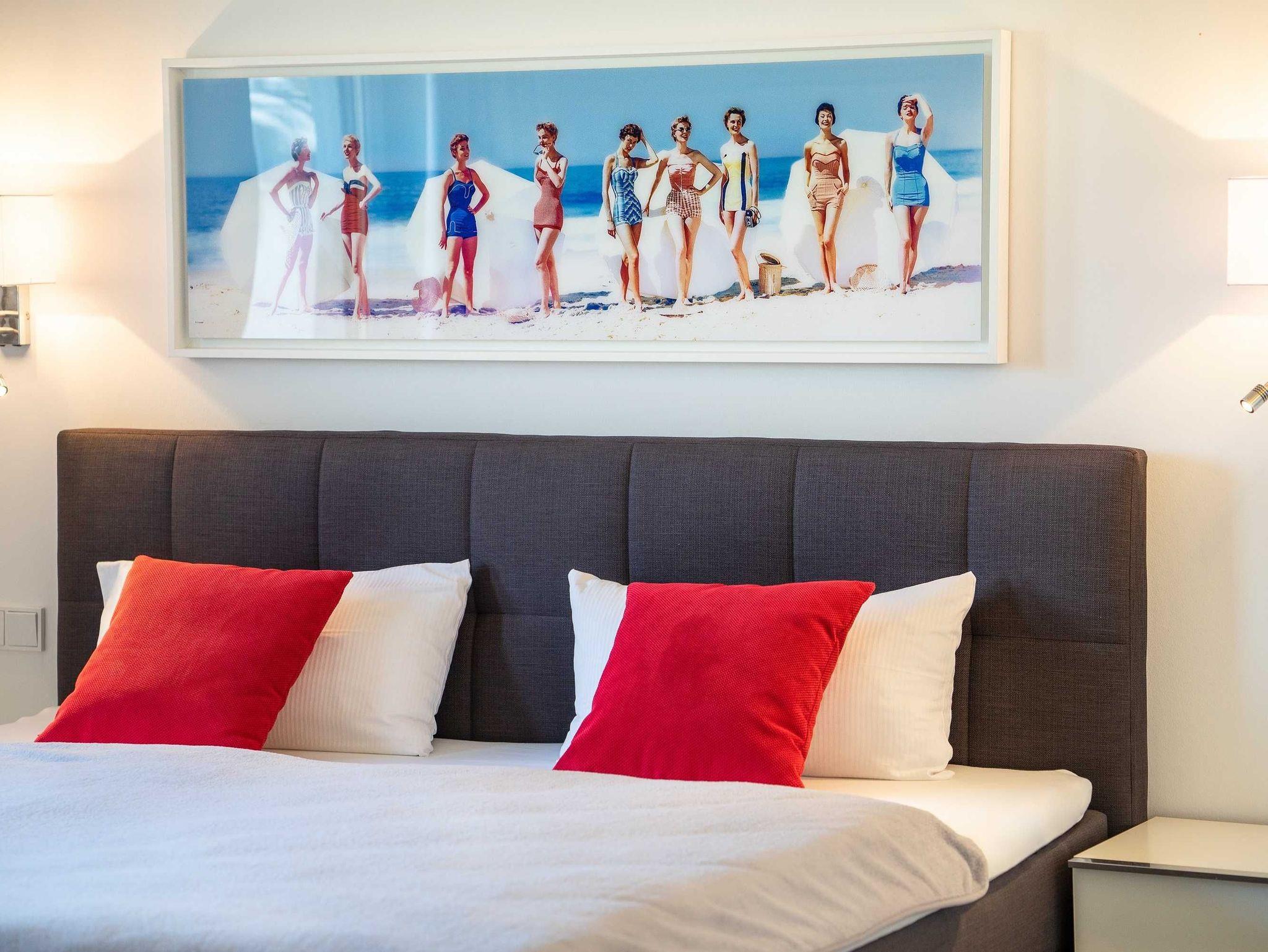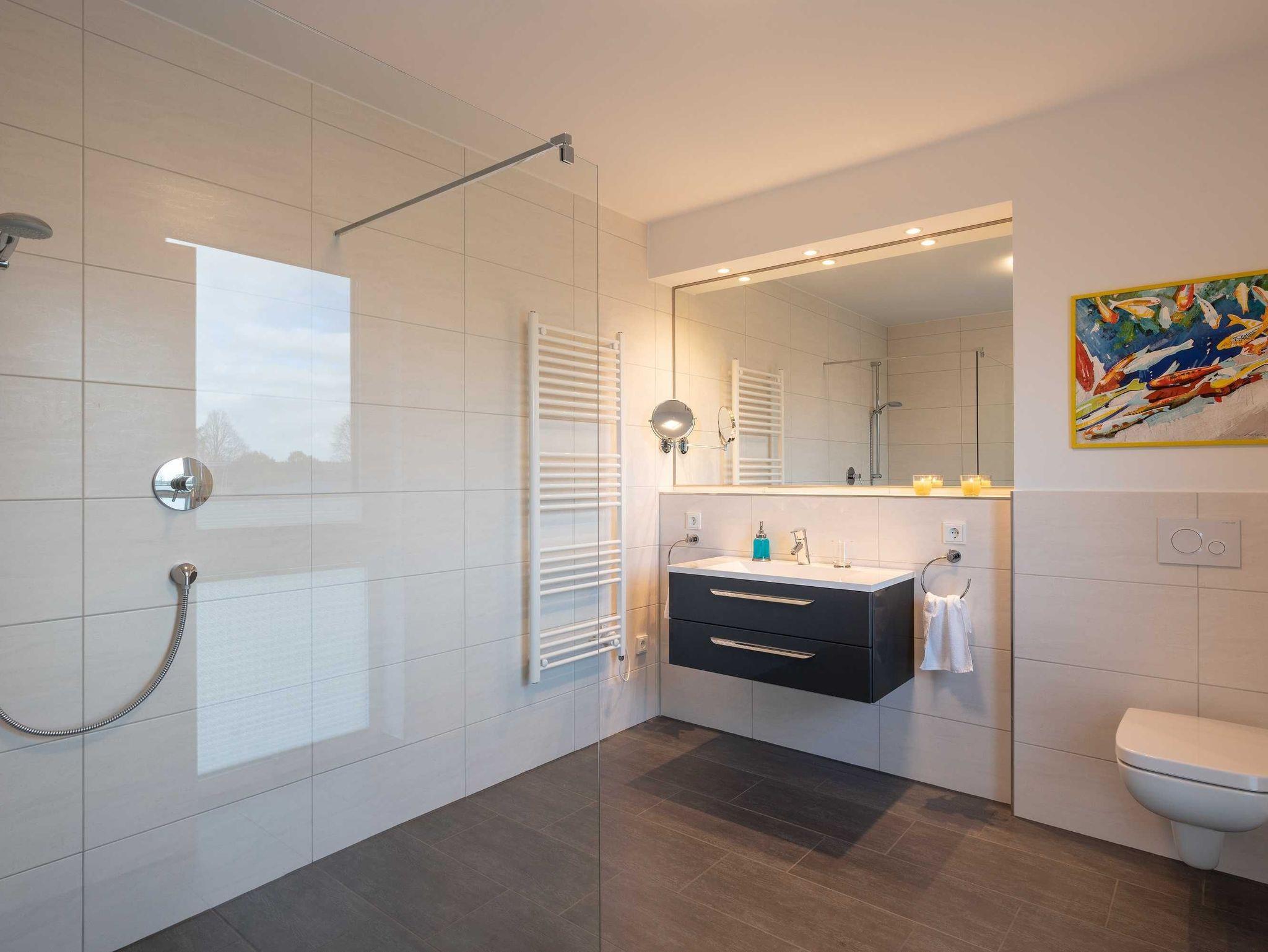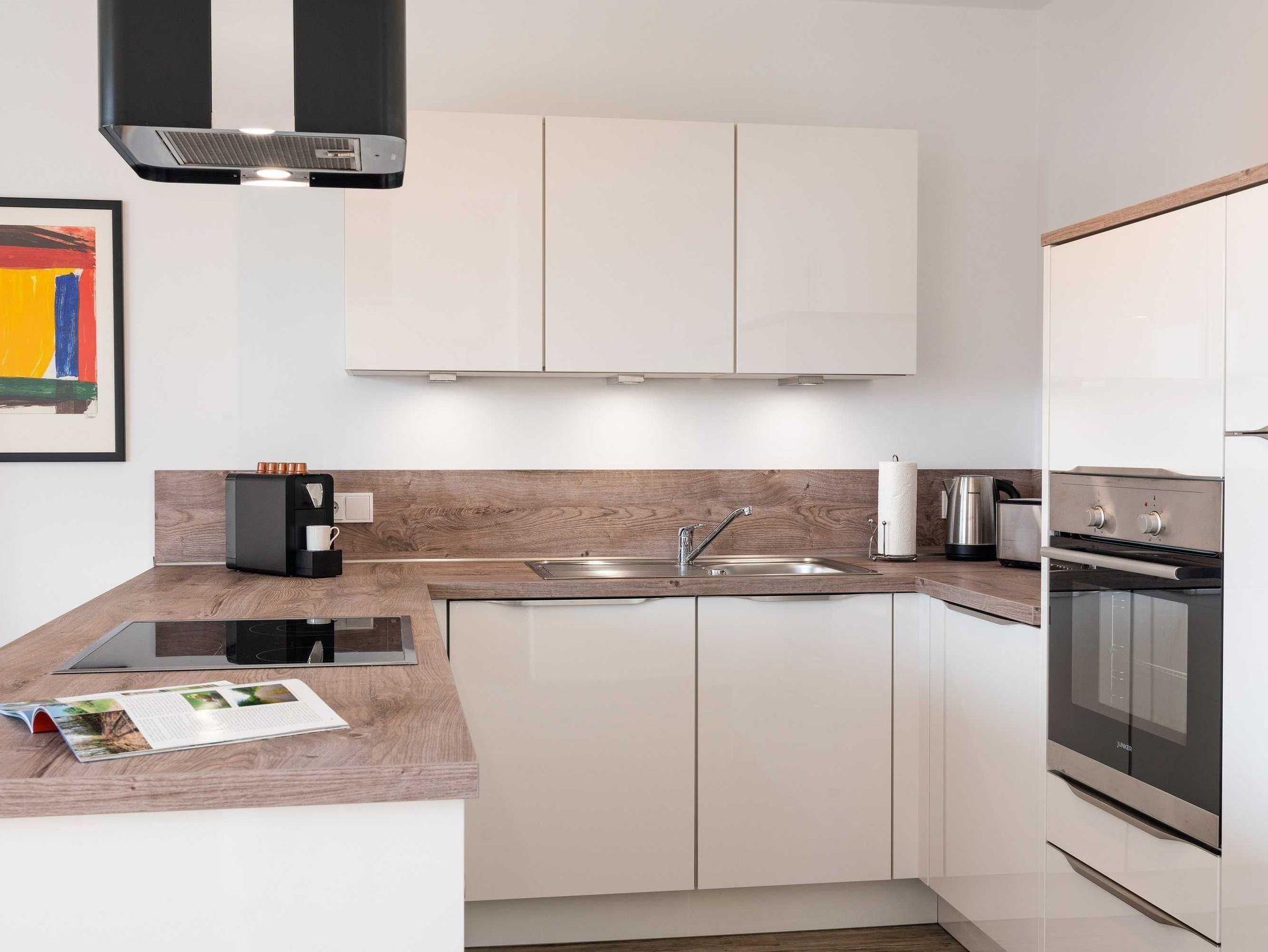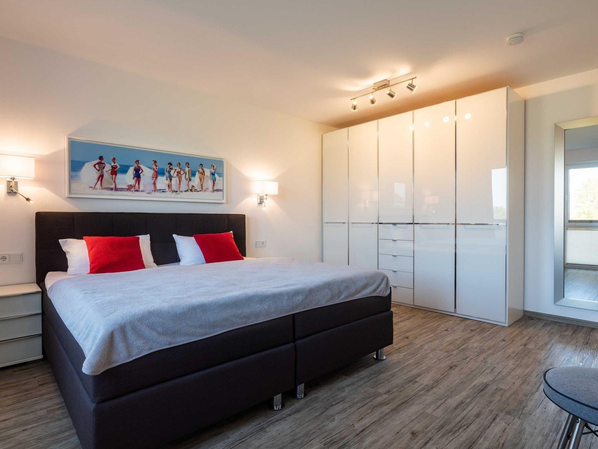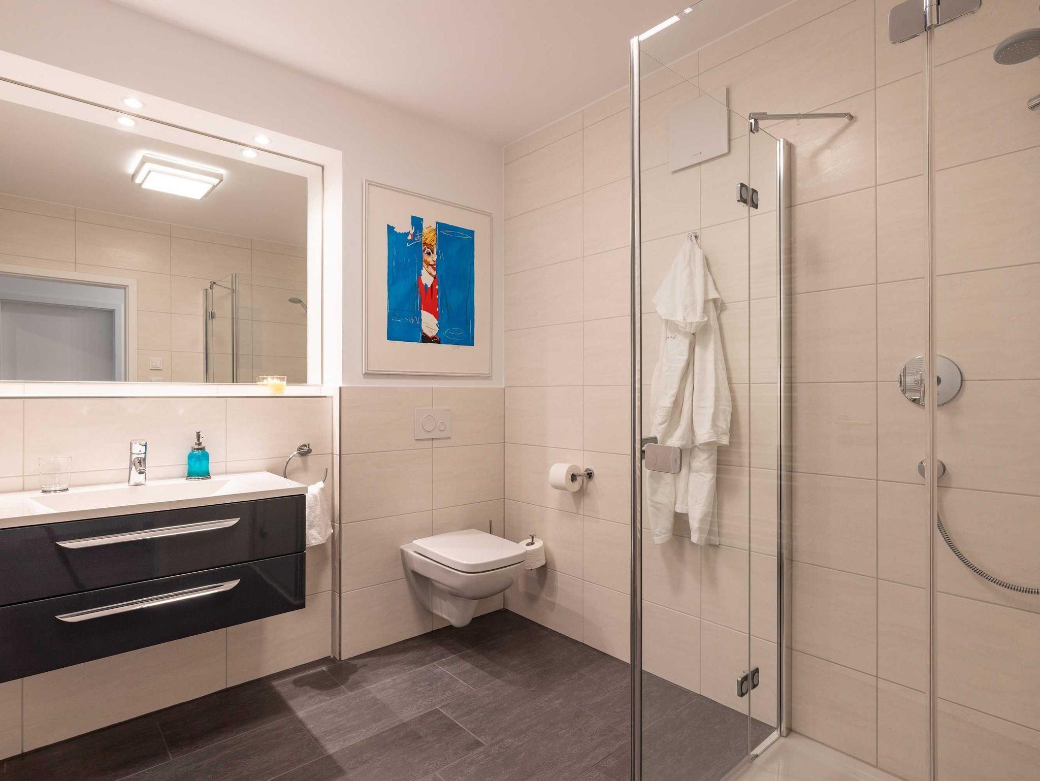 Diese luxuriöse 4-Zimmer-Wohnung im ersten Obergeschoss von Haus 3 (Aufzug vorhanden) mit Platz für maximal 6 Personen sowie einem Kleinkind bis 2 Jahre im Babybett verfügt über eine Wohnfläche von 119 m² und hat 3 Schlafzimmer sowie 2 voll ausgestattete Duschbäder. Die große Sonnenterrasse mit 17 m² liegt in idealer Süd-Ausrichtung. Die Wohnung ist modern eingerichtet mit offenem Wohn-Essbereich, großem Esstisch, Ledersofa sowie Smart-TV (inkl. Sky-Abo). Die hochwertig ausgestattete Küche, offen zum Wohnbereich, lässt keine Wünsche offen. Erholsamer Schlaf in den beiden Schlafzimmern mit Boxspringbetten und Smart-TV ist garantiert. Im dritten Schlafzimmer befindet sich ein bequemes Schlafsofa (Liegefläche: 1,80 x 2,00 m) und ein Smart-TV. Das Badezimmer en Suite ist mit einer begehbaren Dusche ausgestattet. Auf dem großen, überdachten Sonnenbalkon mit Essgruppe und zwei Relax-Sesseln, Fußhockern sowie einem Sonnenschirm können Sie die Seele baumeln lassen.