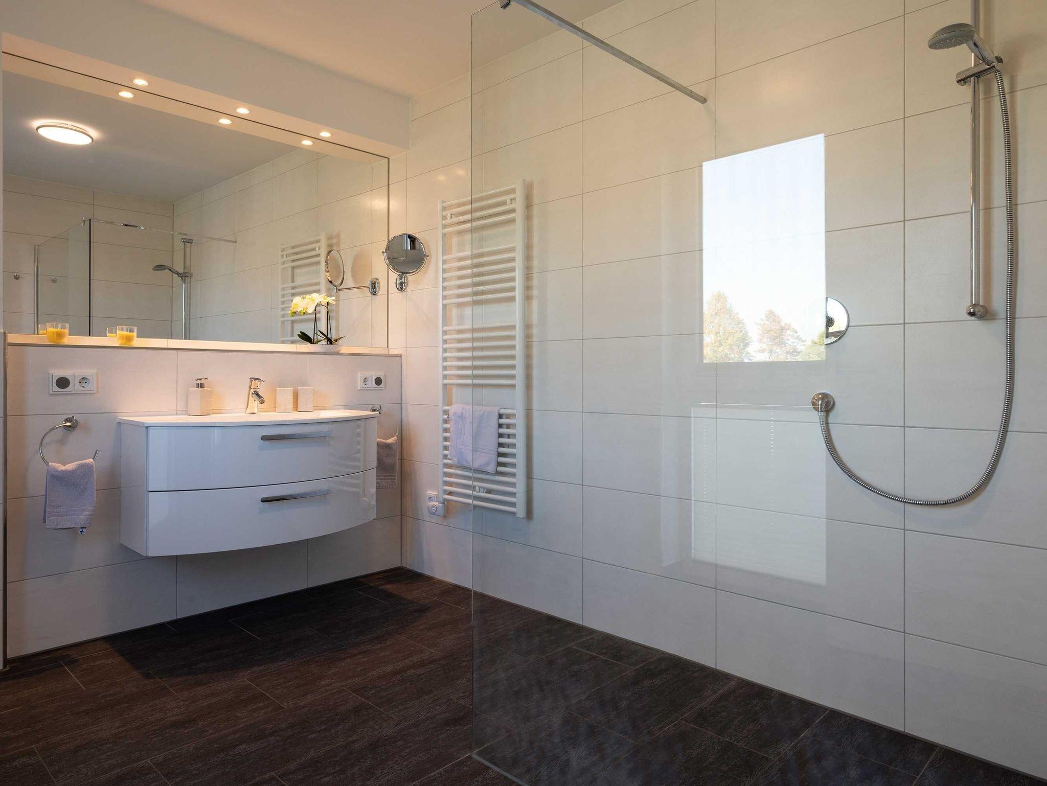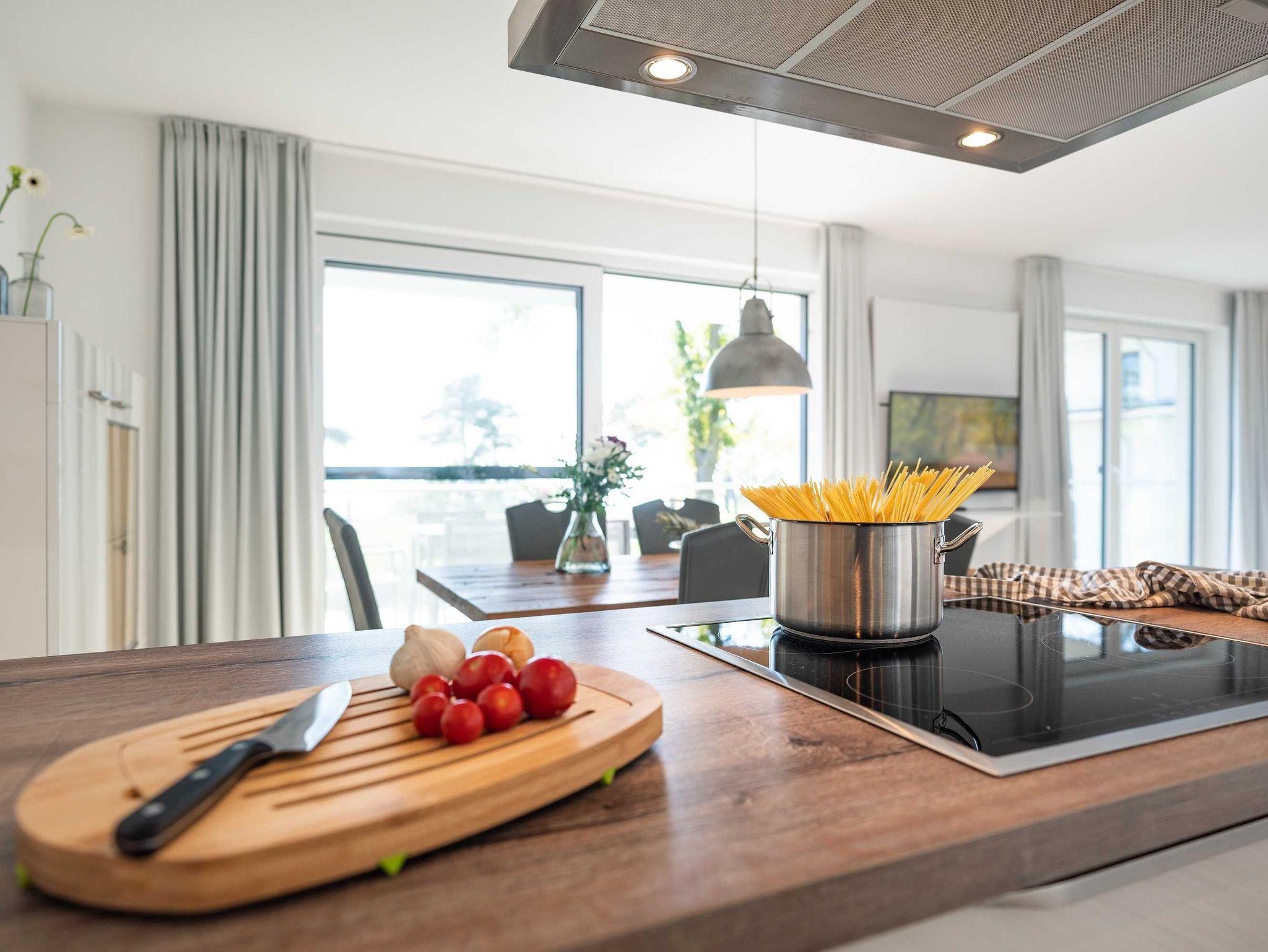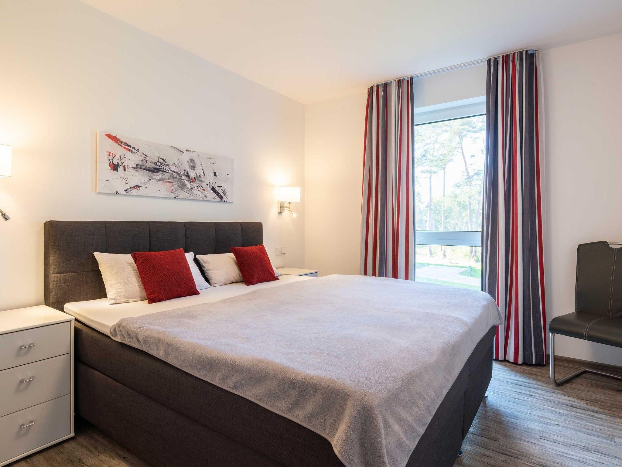 Diese luxuriöse 4-Zimmer-Wohnung im ersten Obergeschoss von Haus 1 (Aufzug vorhanden) mit Platz für maximal 6 Personen sowie einem Kleinkind bis 2 Jahre im Babybett verfügt über eine Wohnfläche von 119 m² und hat 3 Schlafzimmer sowie 2 voll ausgestattete Duschbäder. Die große Sonnenterrasse mit 17 m² liegt in idealer Süd-Ausrichtung. Die Wohnung ist modern eingerichtet mit offenem Wohn-Essbereich, großem Esstisch, Ledersofa sowie Flat-TV (inkl. Sky-Abo). Die hochwertig ausgestattete Küche, offen zum Wohnbereich, lässt keine Wünsche offen. Erholsamer Schlaf in den beiden Schlafzimmern mit Boxspringbetten und Flat-TV ist garantiert. Im dritten Schlafzimmer befindet sich ein bequemes Schlafsofa (Liegefläche: 1,80 x 2,00 m) und ein Flat-TV. Das Badezimmer en Suite ist mit einer begehbaren Dusche ausgestattet. Auf der großen, überdachten Sonnenterrasse mit Essgruppe und jeweils zwei Relax-Sesseln mit Fußhockern sowie einem Sonnenschirm können Sie die Seele baumeln lassen.