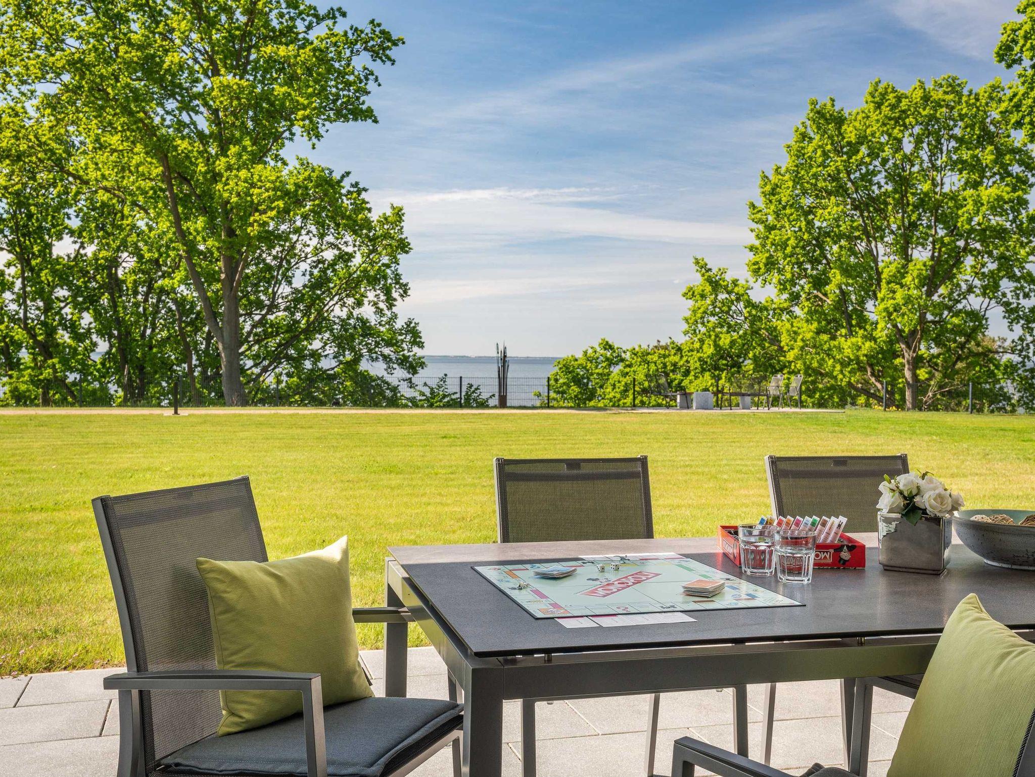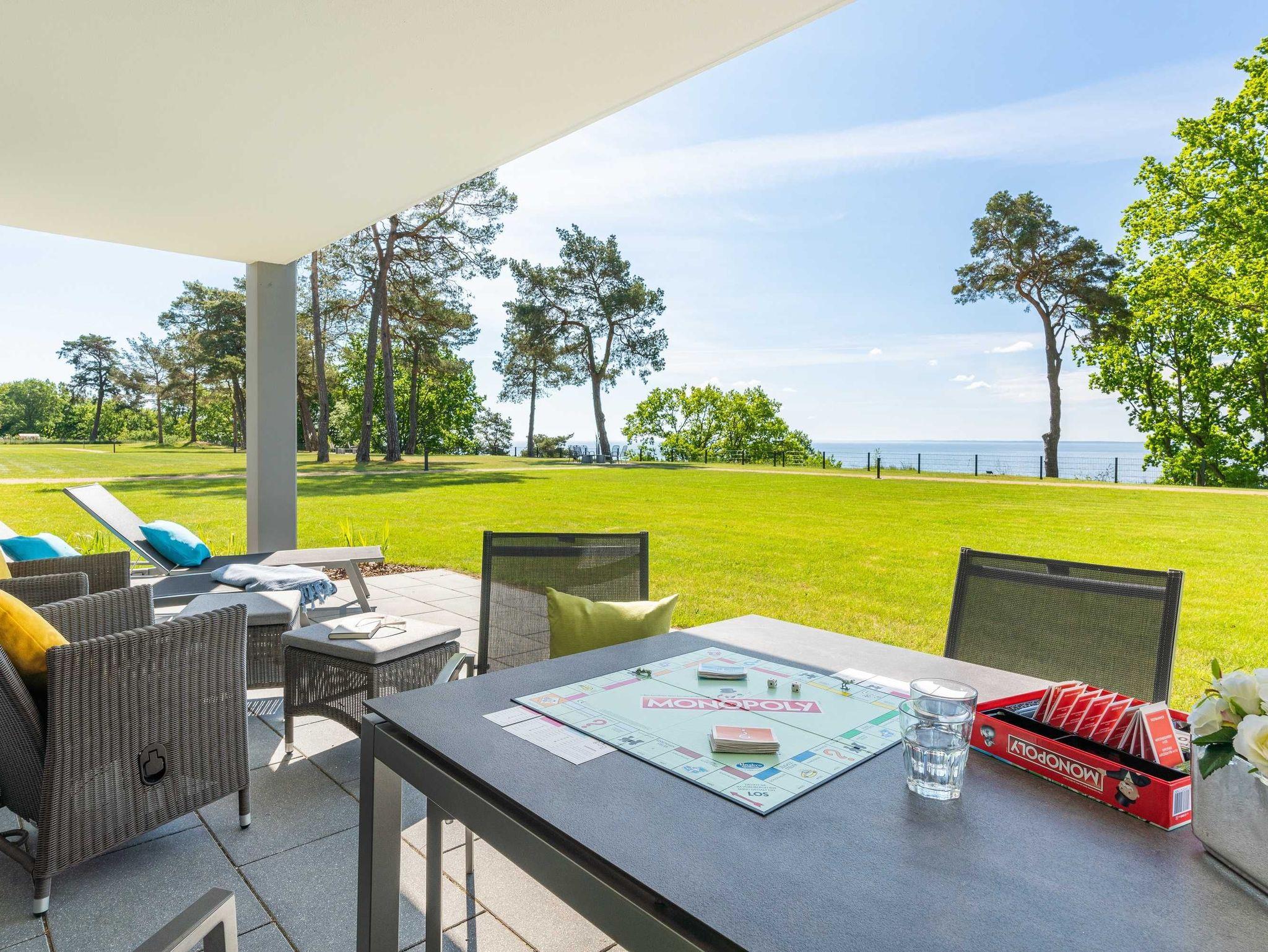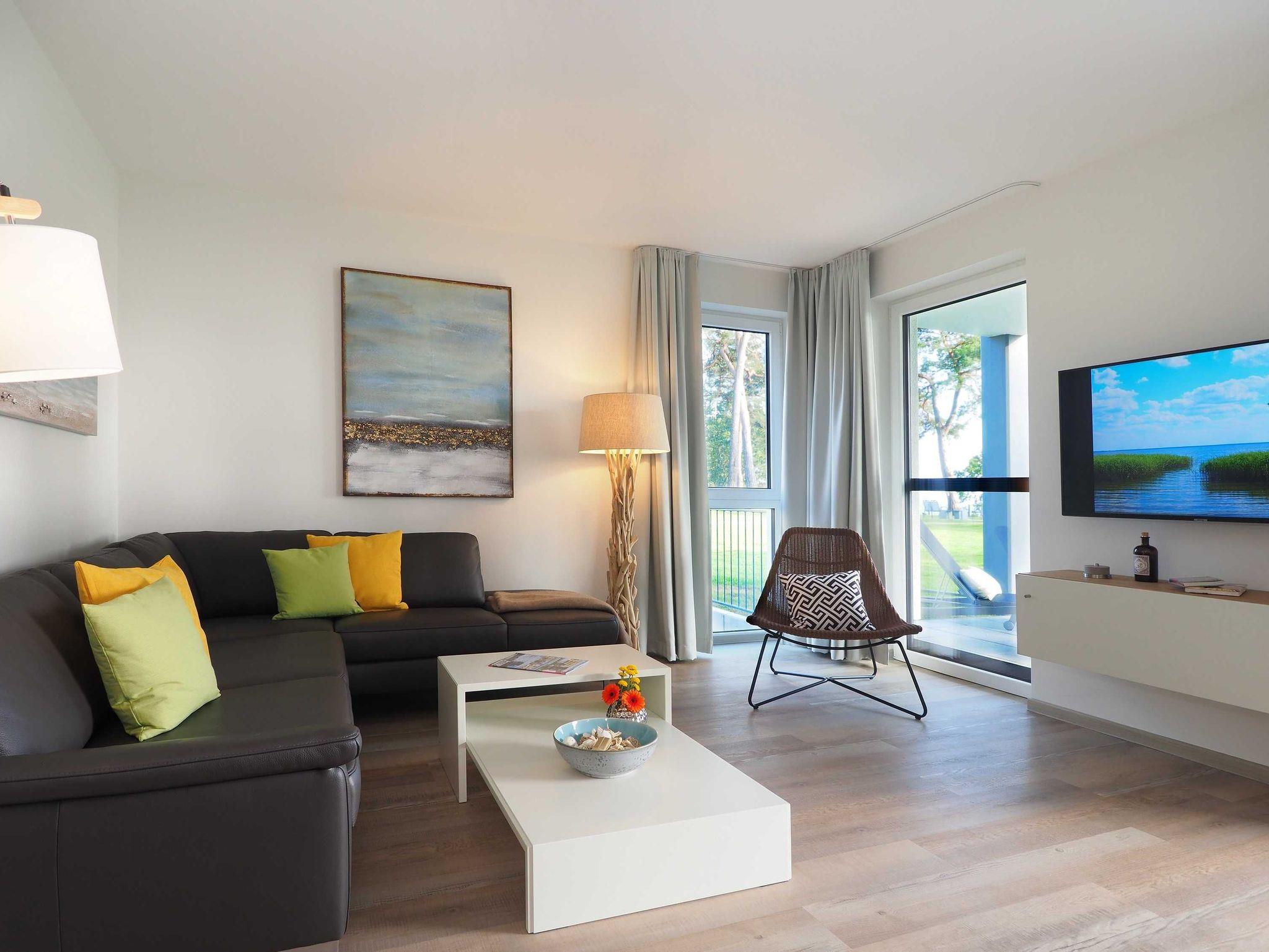 Alle Terrassenwohnungen und Appartements sind mit viel Liebe zum Detail in hochwertiger Luxus-Ausstattung eingerichtet. Von großen Rasenflächen und ebenen Gehwegen umgeben, stehen unsere Ferienhäuser auf die Haffküste ausgerichtet und auf einer weitflächigen Außenanlage zueinander. Unsere Haffterrassen laden mit Sitzgelegenheiten an der Steilküste zum Entspannen bei einem Glas Wein ein.