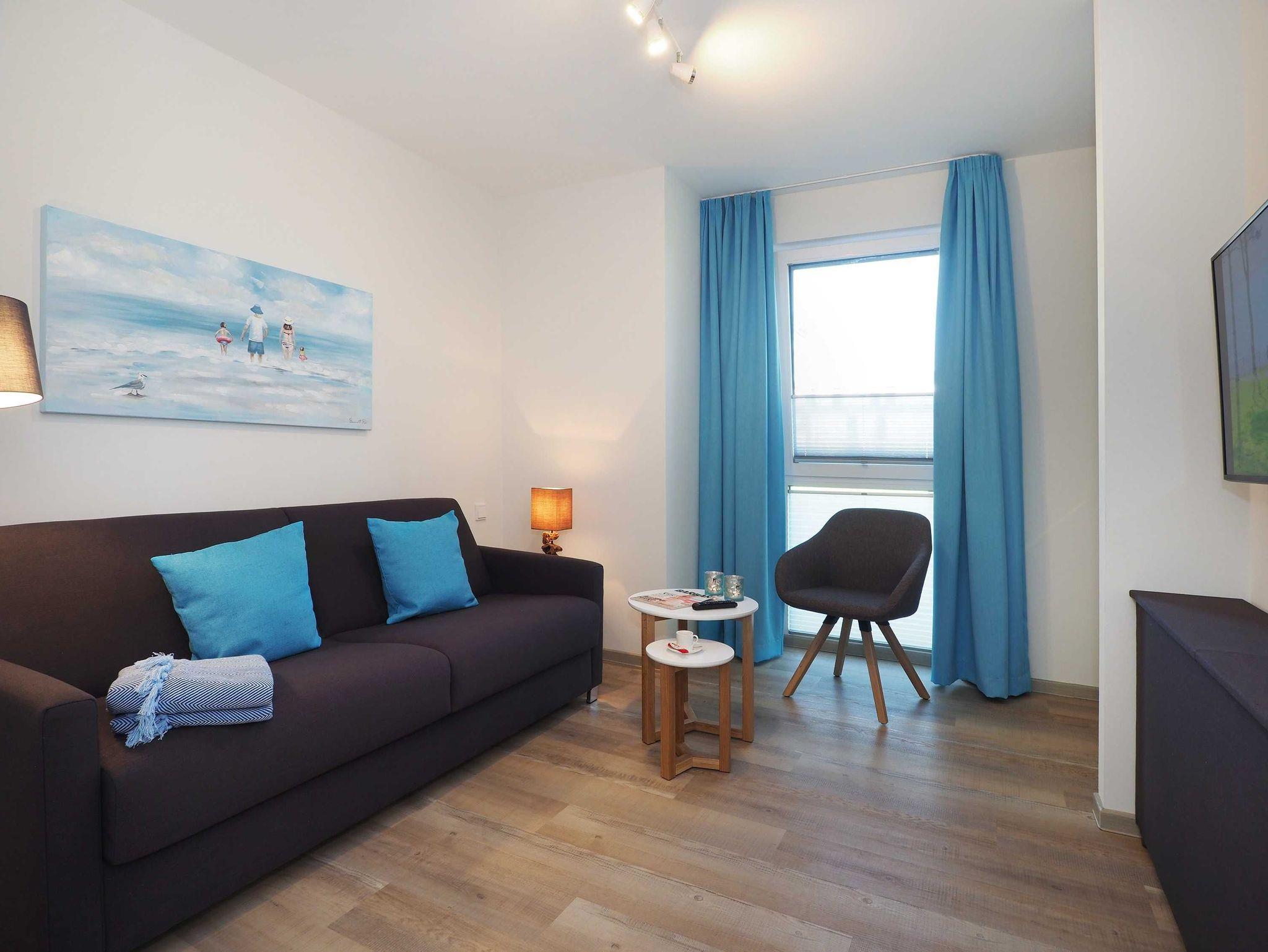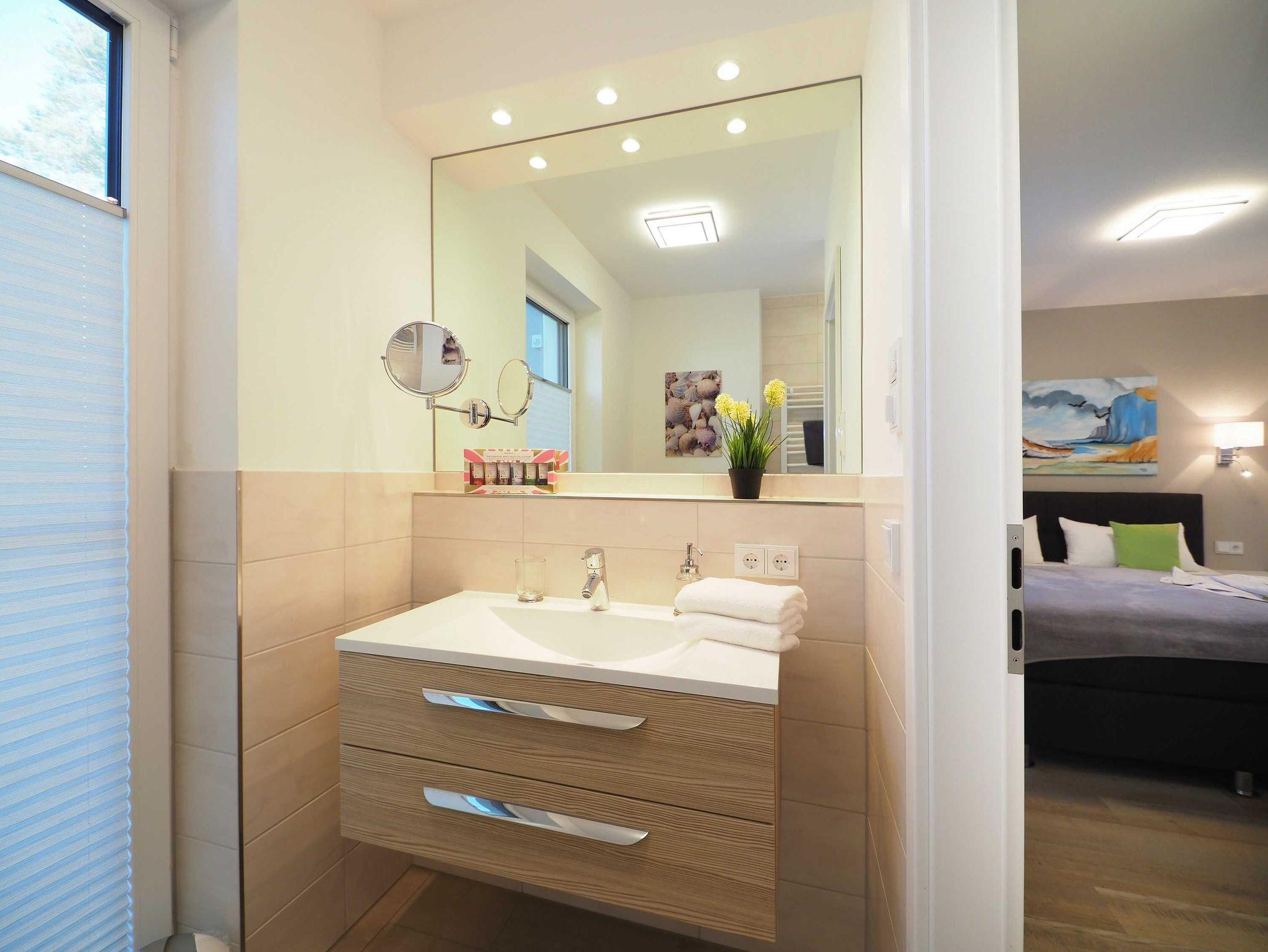 Diese luxuriöse 4-Zimmer-Wohnung im Erdgeschoss von Haus 5 mit Platz für maximal 6 Personen verfügt über eine Wohnfläche von 100 m² und hat 3 Schlafzimmer sowie 2 voll ausgestattete Duschbäder. Die große Sonnenterrasse mit 21 m² liegt in idealer Süd-Ausrichtung. Die Wohnung ist modern eingerichtet mit offenem Wohn-Essbereich, großem Esstisch, Ledersofa sowie Smart-TV (inkl. Sky-Abo). Die hochwertig ausgestattete Küche, offen zum Wohnbereich, lässt keine Wünsche offen. Erholsamer Schlaf in den beiden Schlafzimmern mit Boxspringbetten und Smart-TV ist garantiert. Im dritten Schlafzimmer befindet sich ein bequemes Schlafsofa (Liegefläche: 1,60 x 2,00 m), Schreibtisch und Smart-TV. Das Badezimmer en Suite ist mit einer begehbaren Dusche ausgestattet. Auf der großen, überdachten Sonnenterrasse mit Essgruppe und jeweils zwei Relax-Sesseln, Fußhockern, Sonnenschirm und Sonnenliegen können Sie die Seele baumeln lassen.