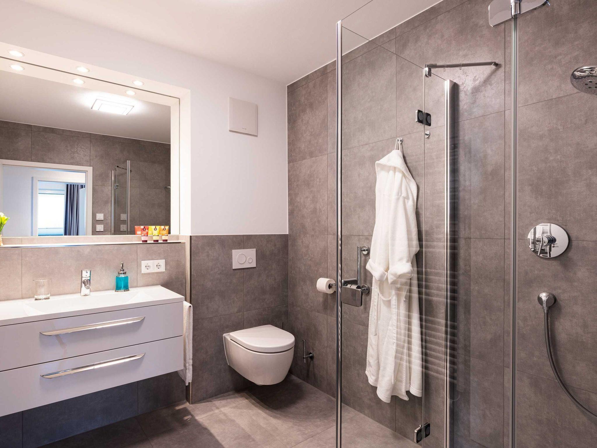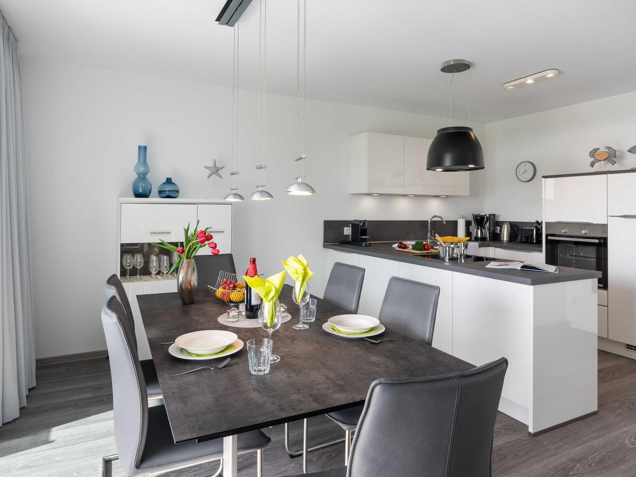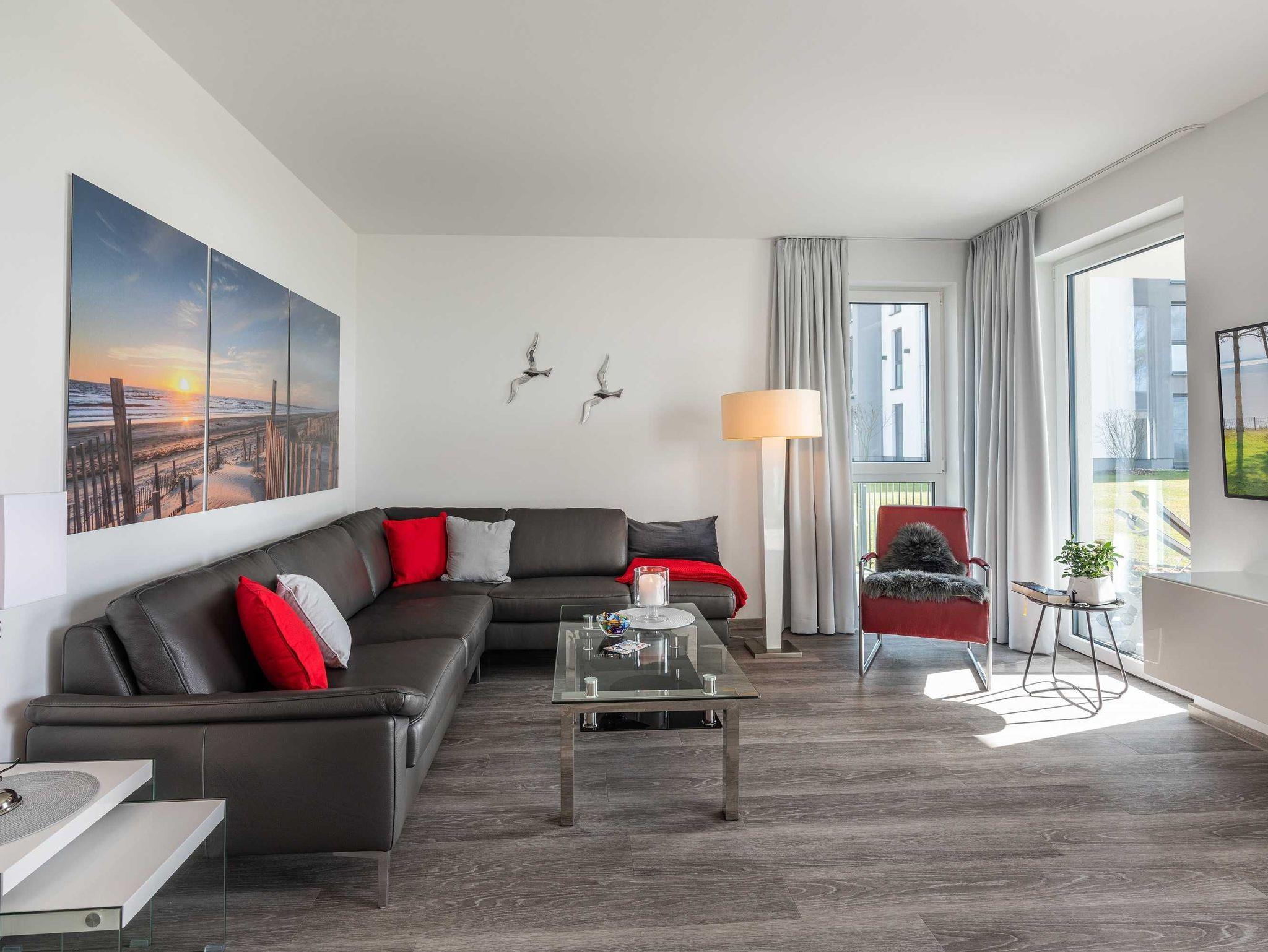 Diese luxuriöse 4-Zimmer-Wohnung im Erdgeschoss von Haus 6 mit Platz für maximal 6 Personen verfügt über eine Wohnfläche von 100 m² und hat 3 Schlafzimmer sowie 2 voll ausgestattete Duschbäder. Die große Sonnenterrasse mit 21 m² liegt in idealer Süd-Ausrichtung. Die Wohnung ist modern eingerichtet mit offenem Wohn-Essbereich, großem Esstisch, Ledersofa sowie Smart-TV (inkl. Sky-Abo). Die hochwertig ausgestattete Küche, offen zum Wohnbereich, lässt keine Wünsche offen. Erholsamer Schlaf in den beiden Schlafzimmern mit Boxspringbetten und Smart-TV ist garantiert. Im dritten Schlafzimmer befindet sich ein bequemes Schlafsofa (Liegefläche: 1,60 x 2,00 m) und ein Smart-TV. Das Badezimmer en Suite ist mit einer begehbaren Dusche ausgestattet. Auf der großen, überdachten Sonnenterrasse mit Essgruppe und jeweils zwei Relax-Sesseln, Fußhockern, Sonnenschirm und Sonnenliegen können Sie die Seele baumeln lassen.