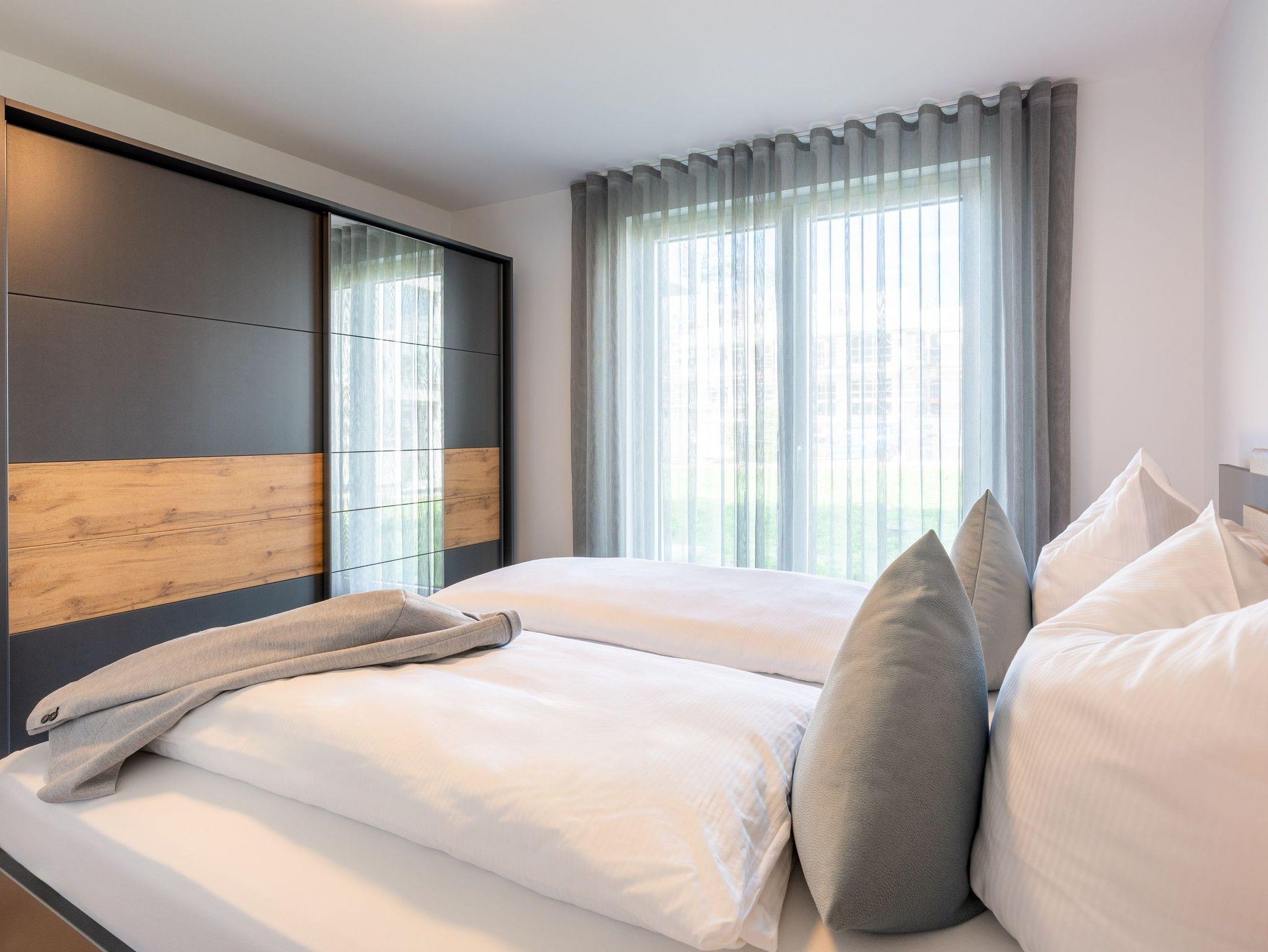 Informationen für Gäste mit Mobilitätseinschränkung: Der Zugang vom Parkplatz zum Hauseingang ist barrierefrei. Die Distanz vom Parkplatz zur Haustür beträgt etwa 30 Meter. Die Breite der Haustür beträgt 100 cm. Die Dichtigkeitsschwelle der Haustür ist etwa 1,5 cm hoch. Der Aufzug im Treppenhaus fährt jede Etage, auch die Saunalandschaft im Obergeschoss, an. Die Türbreite des Aufzugs beträgt 90 cm, die Tiefe beträgt 130 cm. Die Wohnungstür weist eine Breite von 90 cm auf. Die Breiten der Zimmertüren liegen bei 80 cm (Ausnahme: Türbreite von der Abstellkammer beträgt 70 cm). Im Badezimmer beträgt die Breite der Duschtür etwa 75 cm, die Dichtigkeitsschwelle ist etwa 0,5 cm hoch. Die Duschkabine hat eine Maße von 100 x 100 cm. Auf Wunsch kann ein Duschhocker kostenfrei zur Verfügung gestellt werden. Der Waschtisch ist unterfahrbar. Haltegriffe sind nicht vorhanden. Das Bett weist eine Höhe von 60 cm auf und ist unterfahrbar (max. 15 cm). Die Terrassentür ist zweiflügelig und weist eine Schwelle von etwa 15 cm auf (nicht barrierefrei). Das an der Terrassentür befindliche Fliegengitterschiebeelement lässt die Balkontür auf eine Breite von etwa 70 cm öffnen. Die Schwelle von der gepflasterten Terrasse zur Rasenkante beträgt etwa 15 cm. Der Saunabereich im Dachgeschoss ist mit dem Aufzug erreichbar. Im Dachgeschoss ist eine Sauna mit dem Rollstuhl befahrbar, die Türbreite beträgt 90 cm. Für das Betreten der Dachterrassen müssen zwei Stufen passiert werden. Das Betreten des Südbalkons im Dachgeschoss ist barrierefrei möglich. Die Freizeitbereiche im Untergeschoss des Nachbarhauses sind komplett barrierefrei gestaltet. Die Türbreiten liegen bei 90 cm.