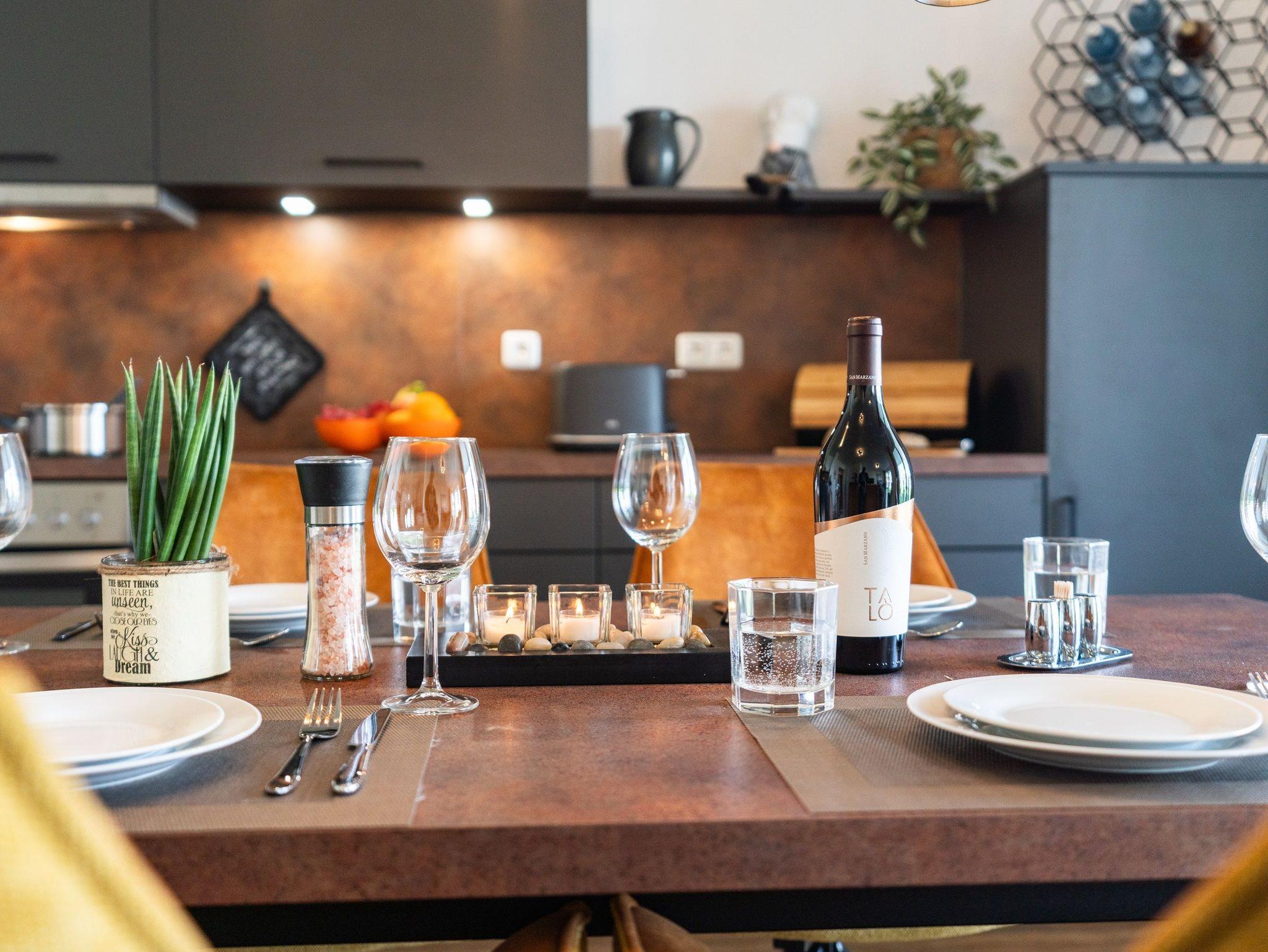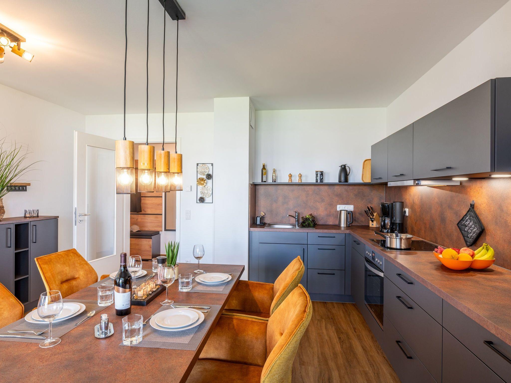 Die Küchenzeile verfügt über hochwertige Geräte wie Herd, Kaffeefiltermaschine, Backofen, Kühlschrank mit Gefrierfach sowie Spülmaschine. Ausreichend Geschirr, Besteck sowie Töpfe und Pfannen befinden sich in den Schränken. Am Esstisch finden Sie vor einem erholsamen Urlaubstag zu einem gemeinsamen Frühstück zusammen.
